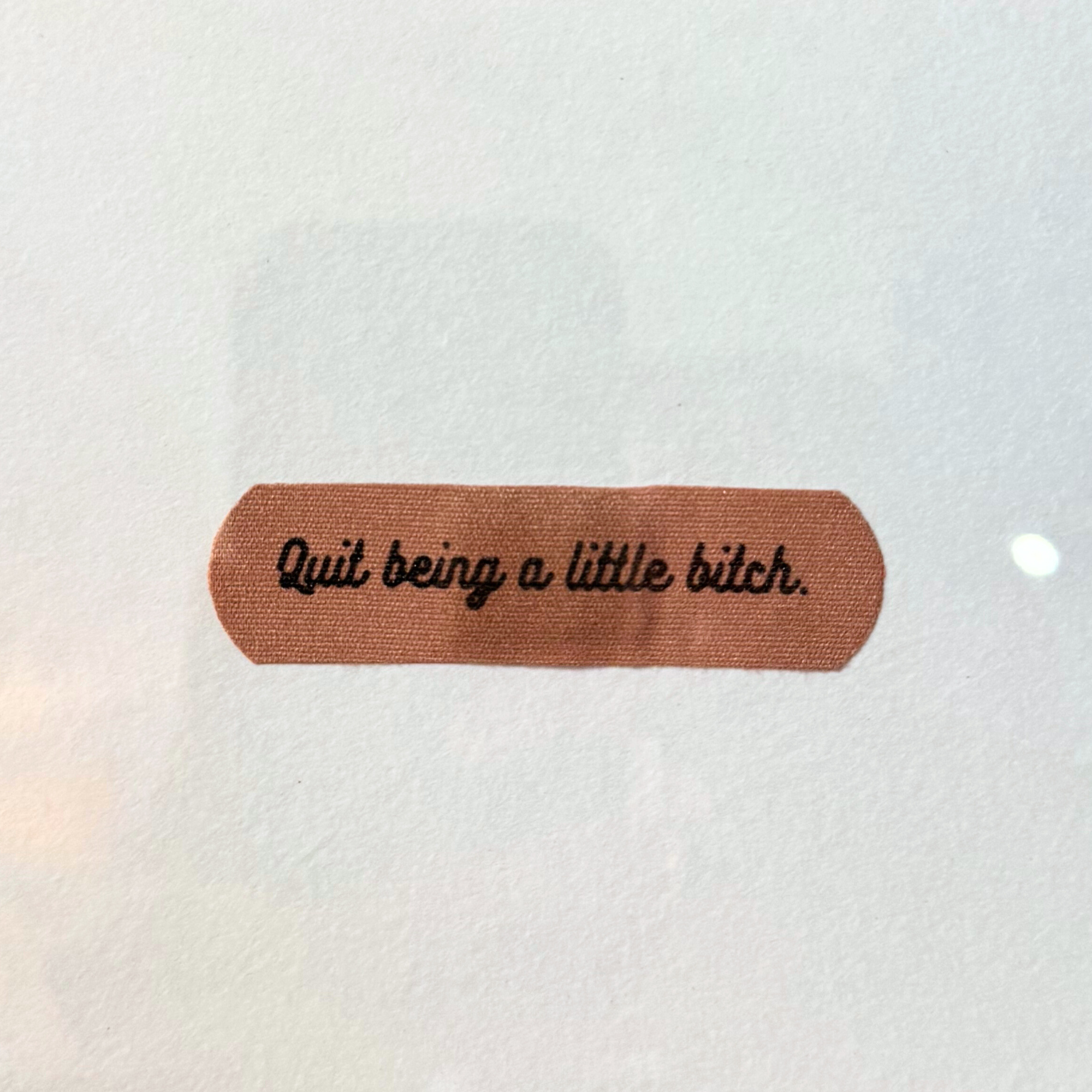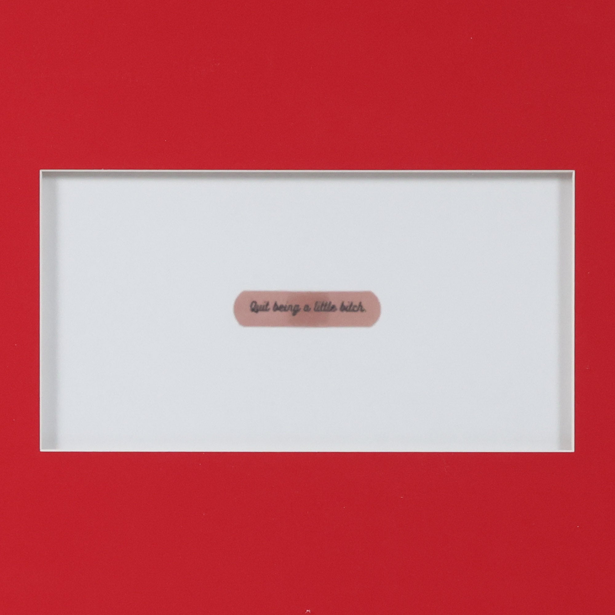 From the Tat Frederick studio, Just Quit features a bandaid with the phrase "Quit being a little bitch" written on it. This isn’t just art, it’s an attitude adjustment in a bright red frame.