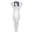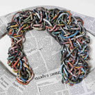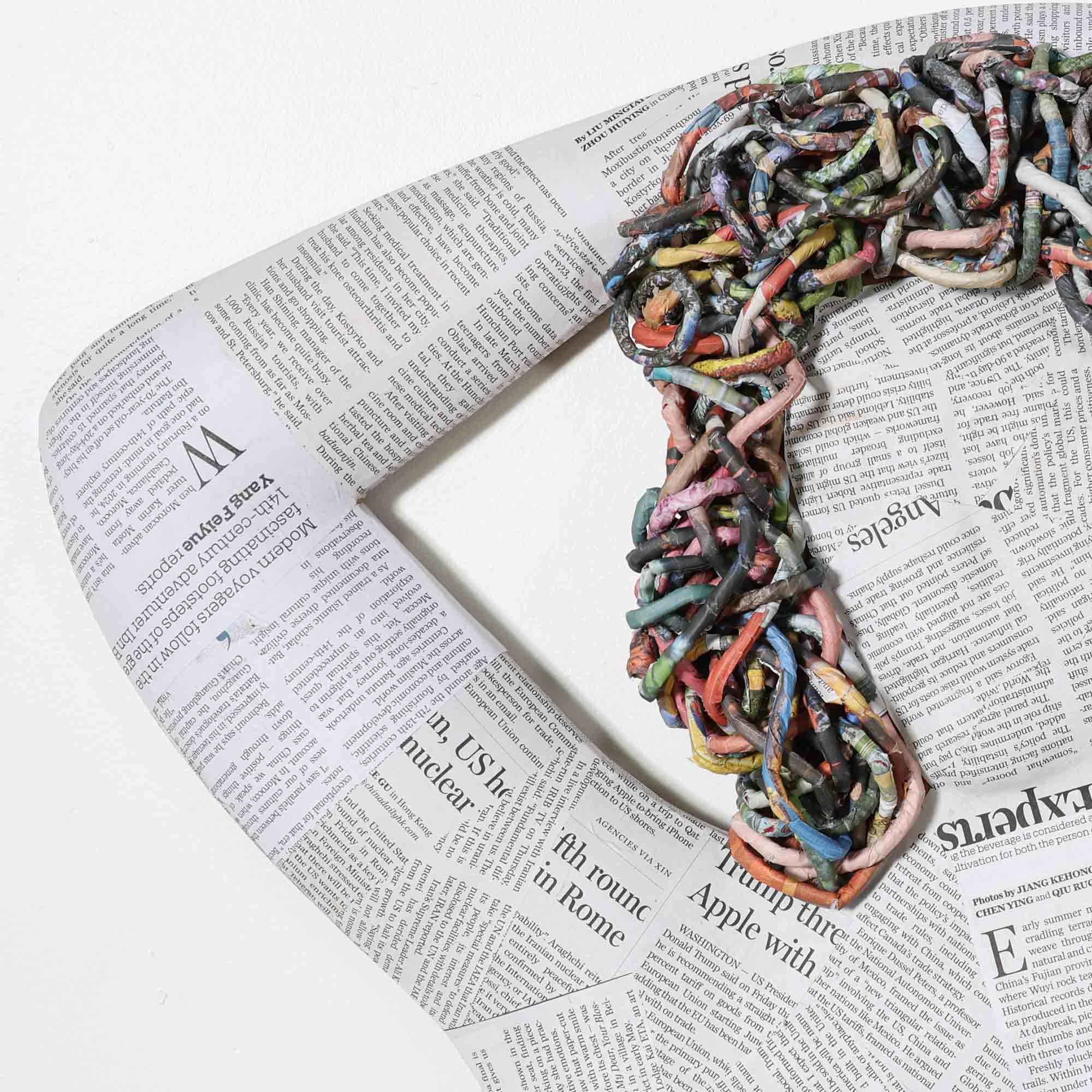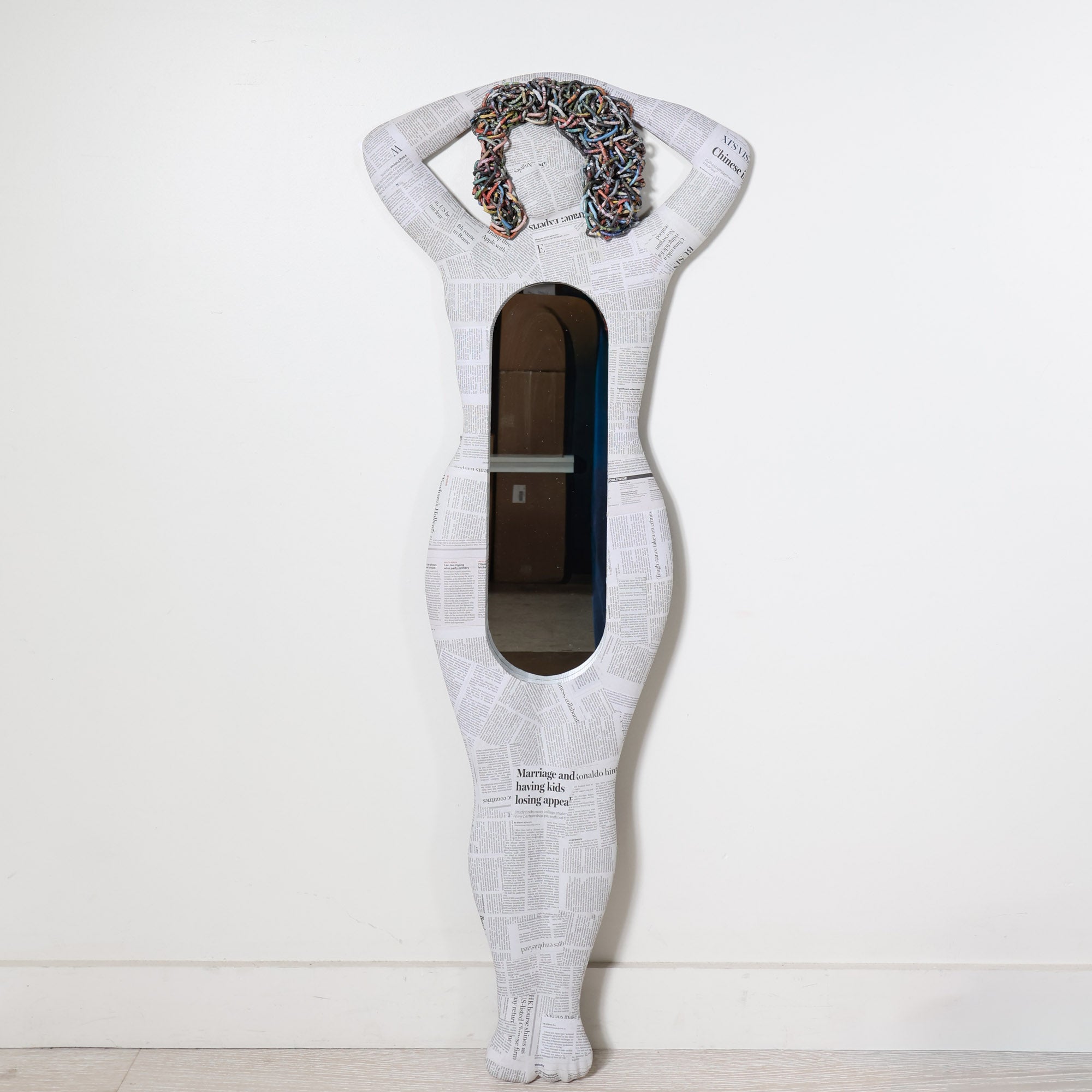 The Muse Mirror is adorned with layers of newspaper, wrapped to form a standing figure with arms lifted overhead. Headlines and columns overlap across the surface, turning old news into art that deserves a second look. Curled color photos and paper on top create a fun hairdo that adds texture and intrigue.