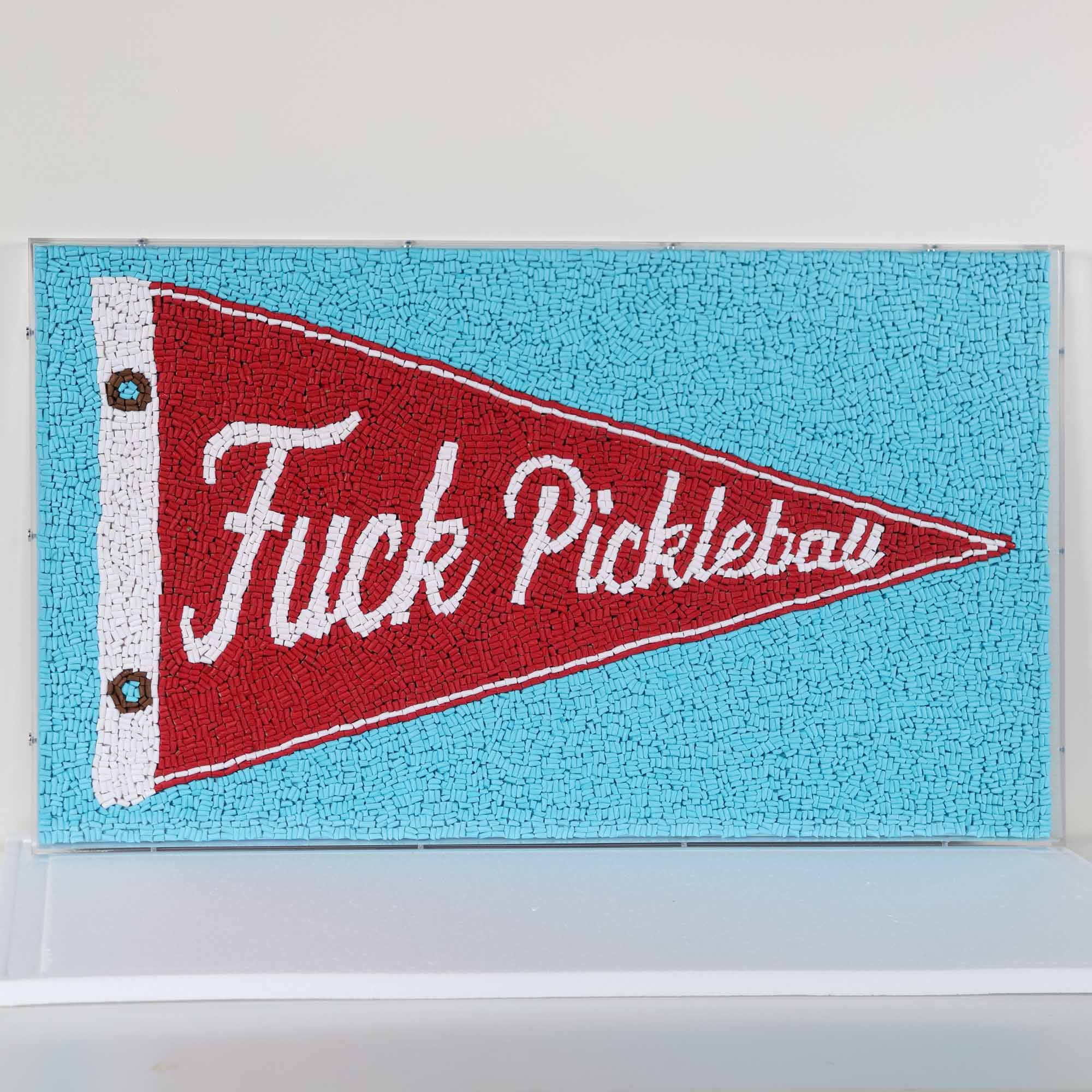 From the Tat Frederick studio, Pickleball Flag is comprised of tiny pieces of painted rope that have been arranged by hand. Framed in an acrylic shadowbox.