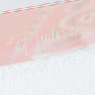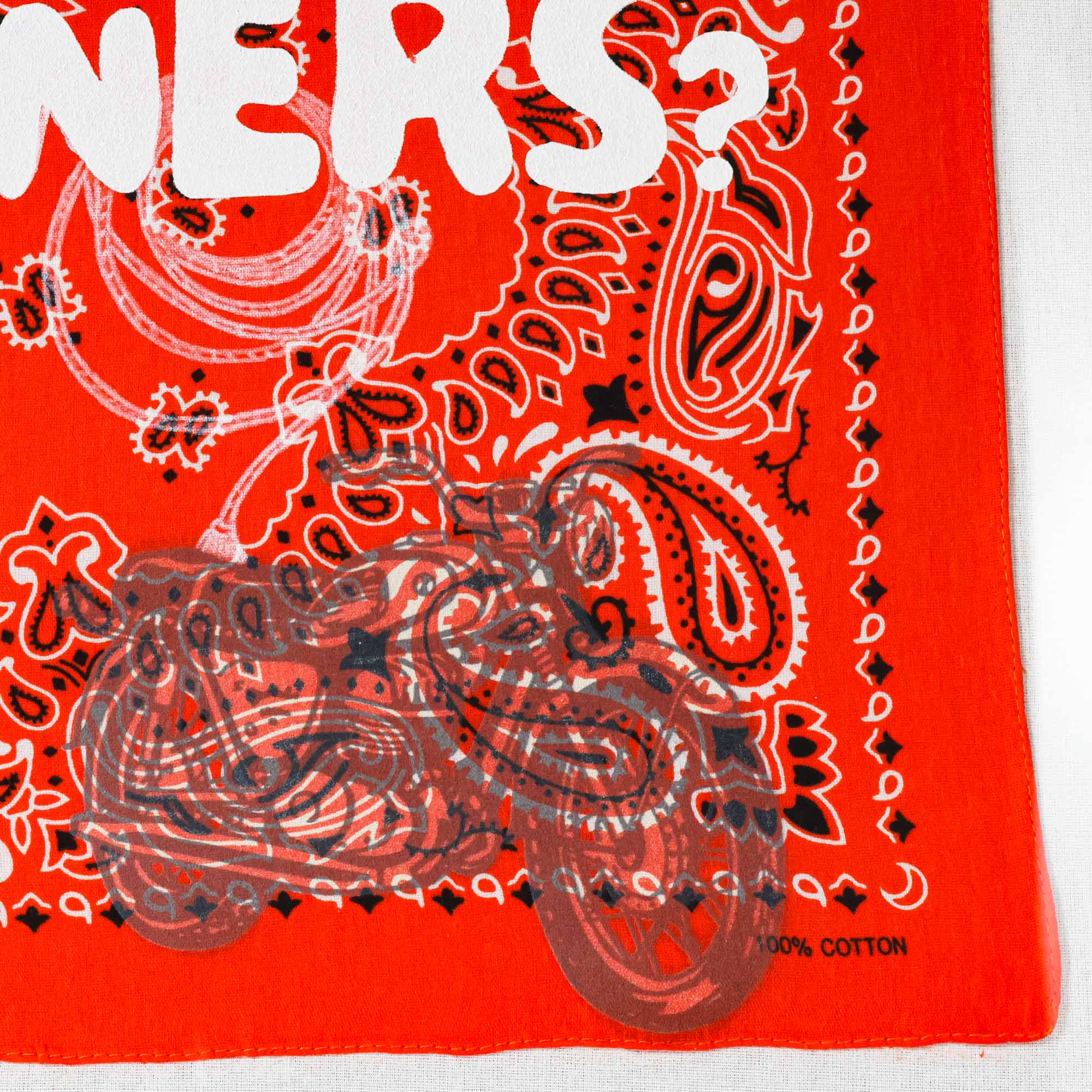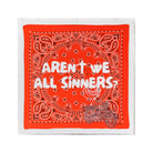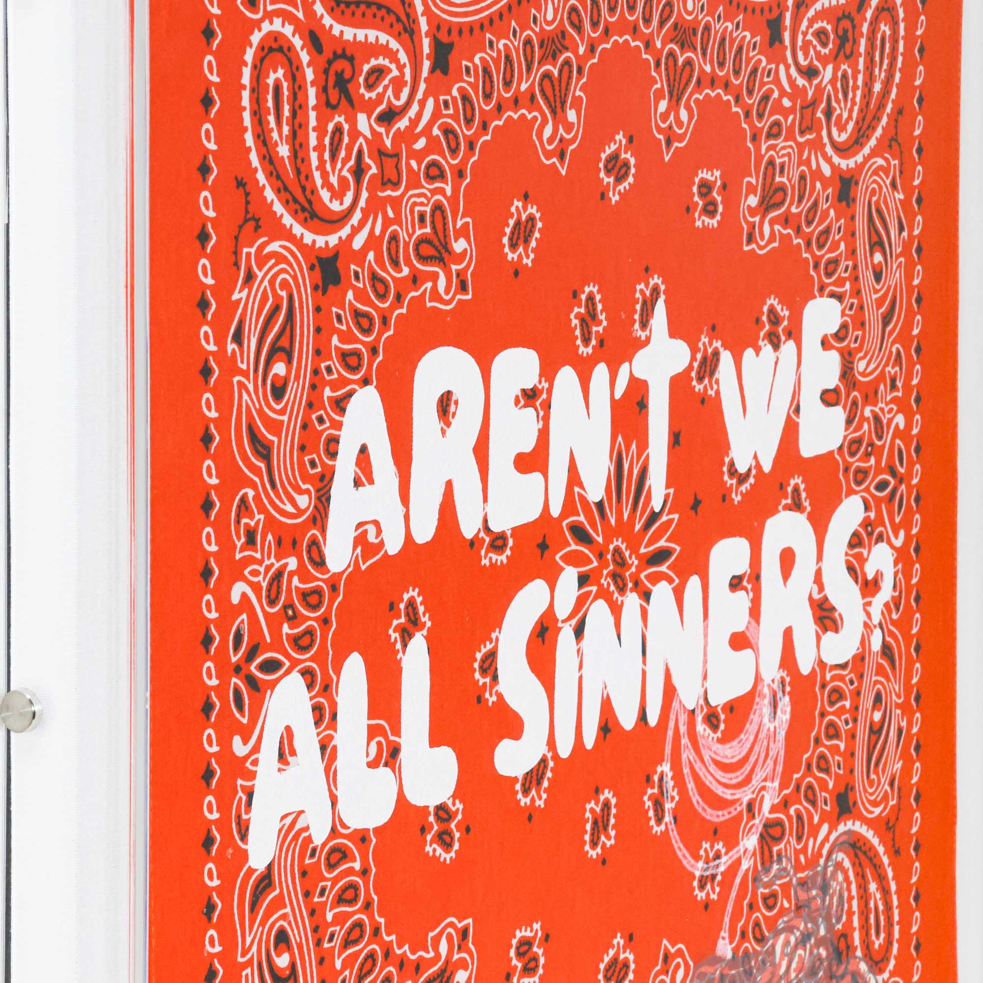 From the Tat Frederick studio, the Bandana Series features bandanas with white printed phrases on each. Framed in an acrylic shadowbox, this piece depicts the saying 'Aren't We All Sinners?' and a motorbike on a red bandana.