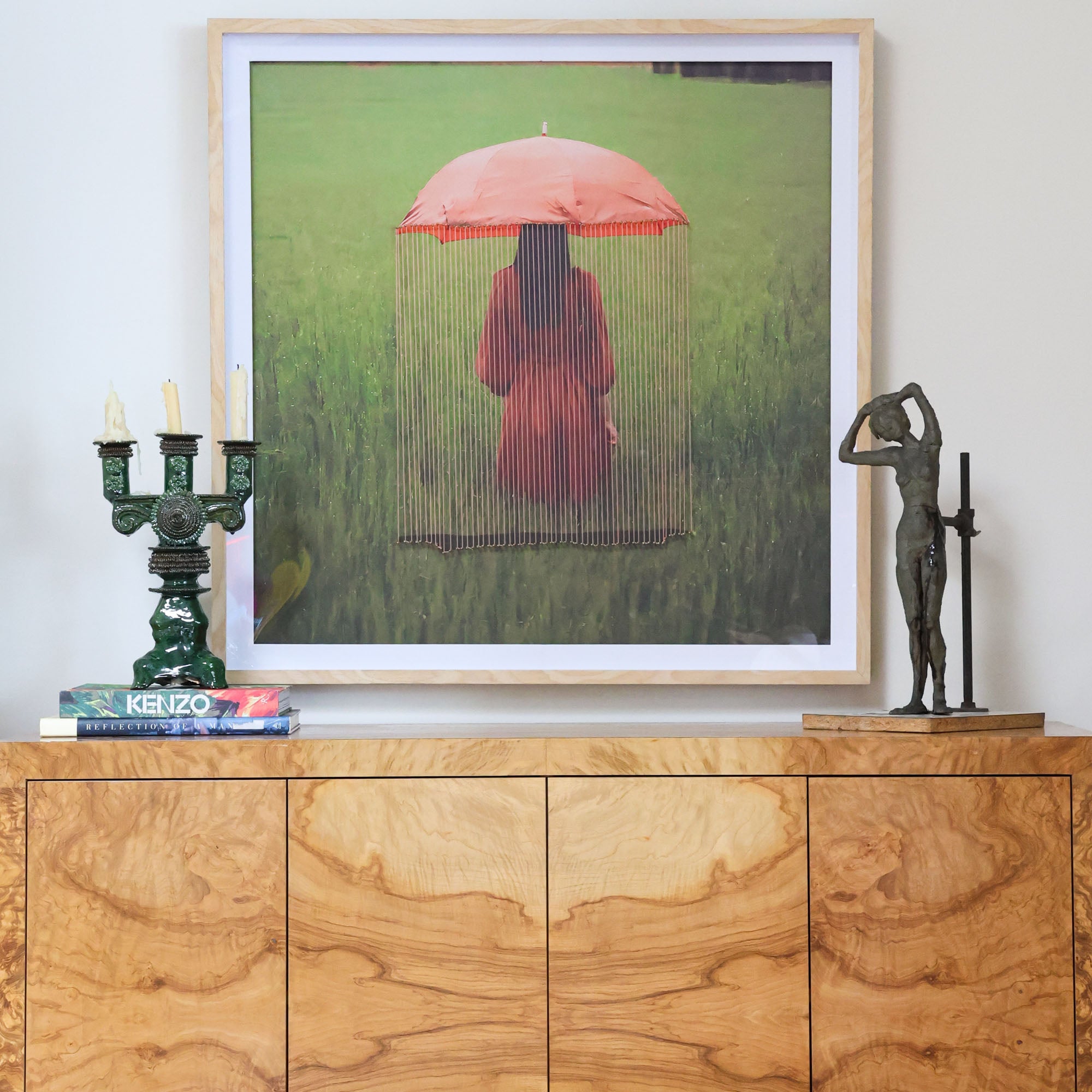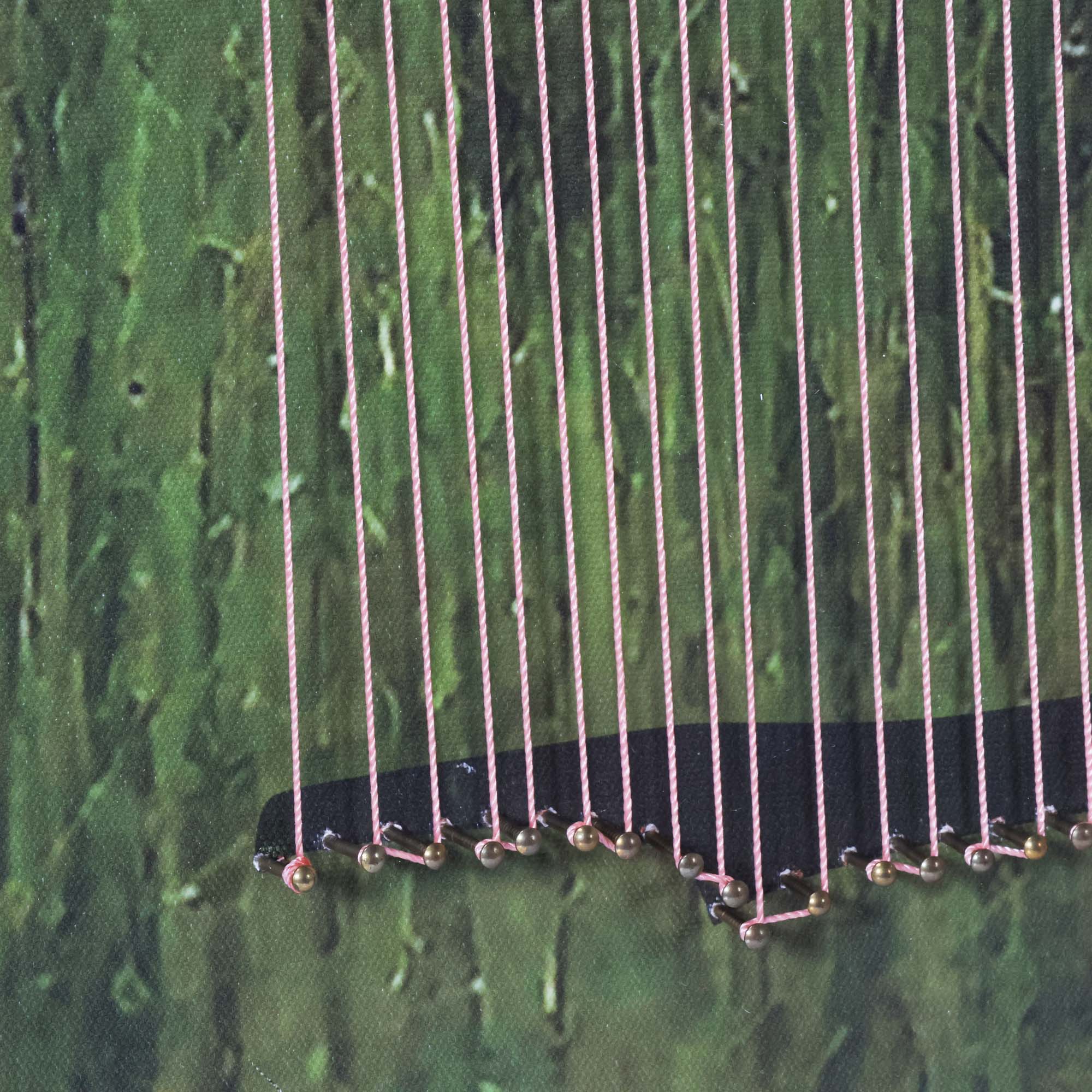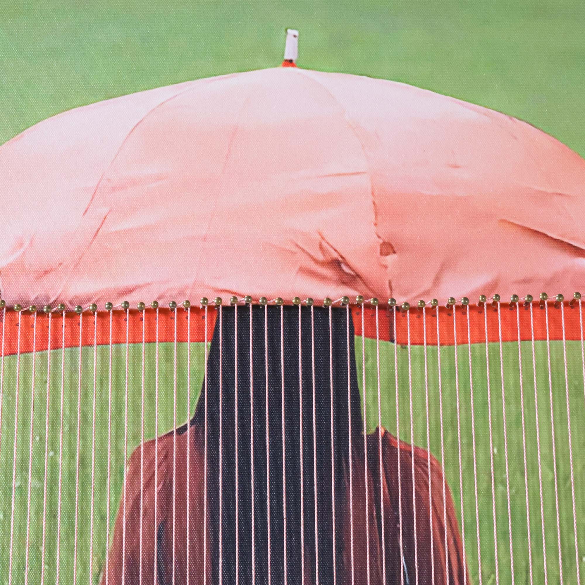 From the Tat Frederick studio, the Umbrella String Series features printed photographs that have been framed and matted in white. Hand-placed pins hold strings that come down from the pictured umbrella for an eye-catching linear effect.