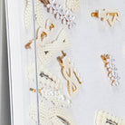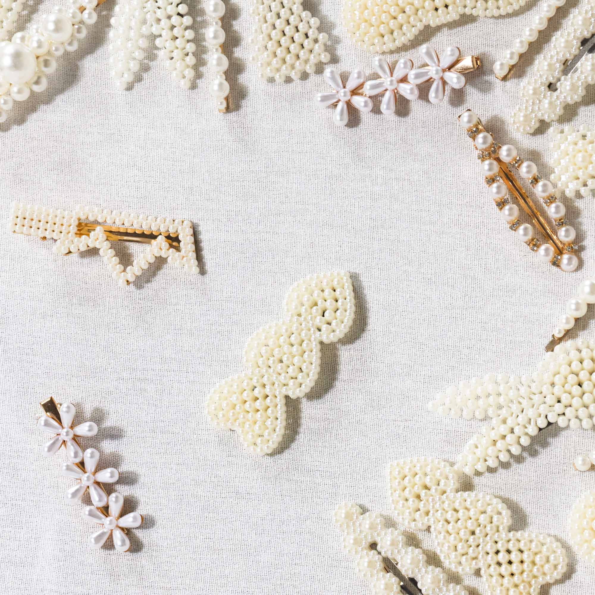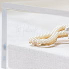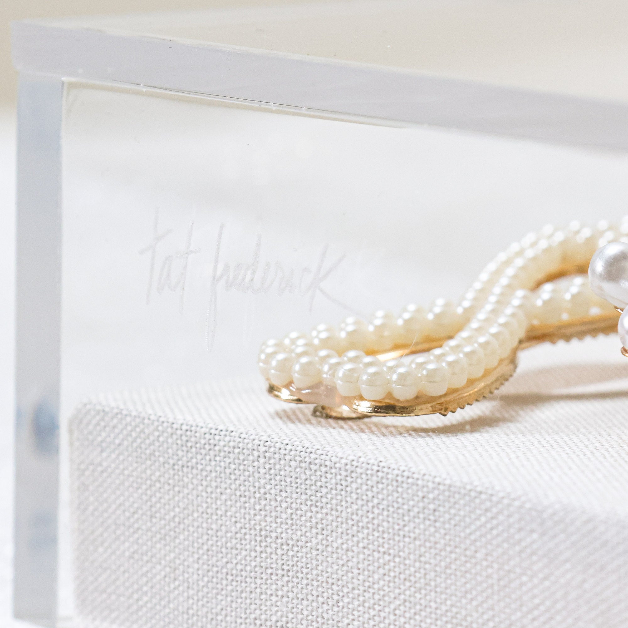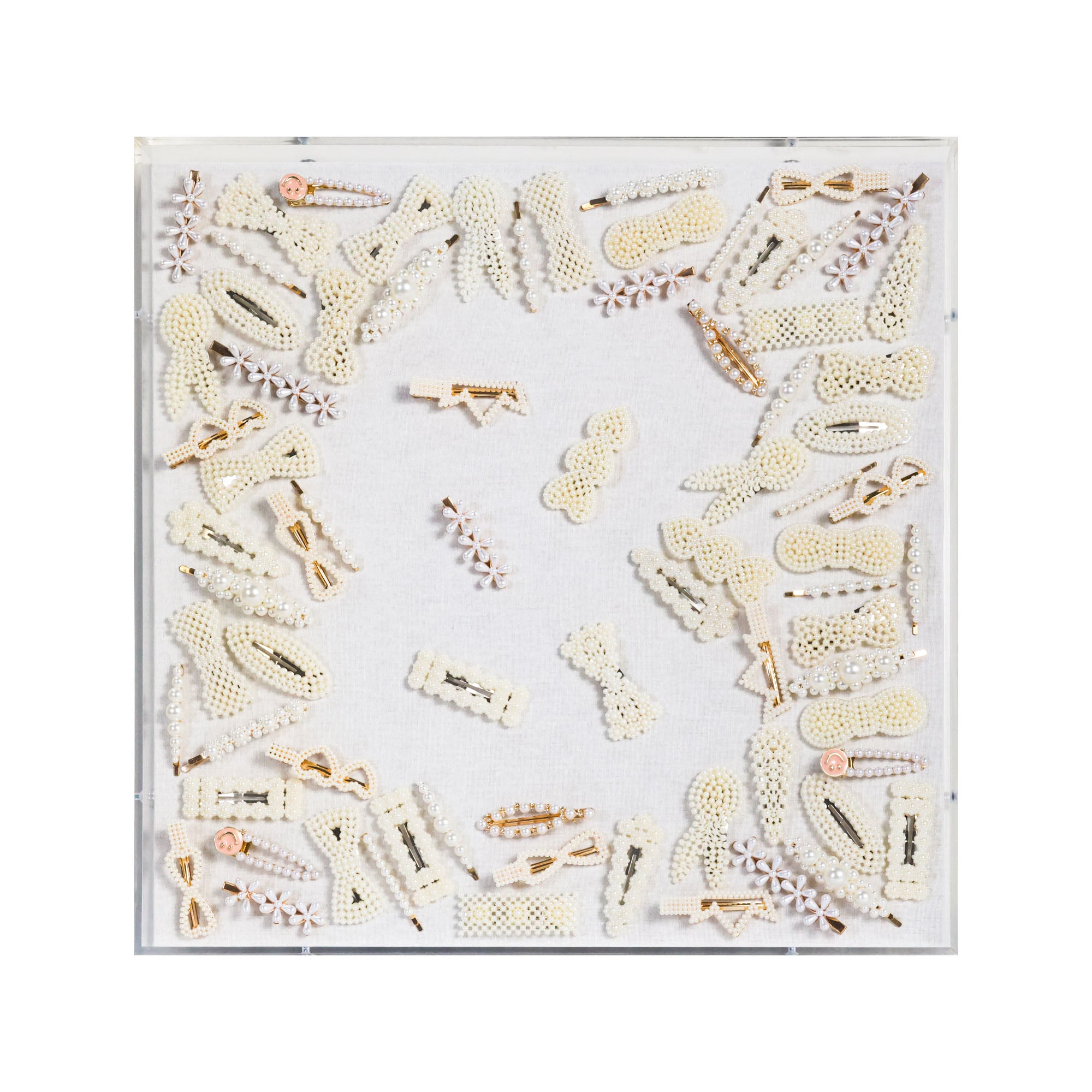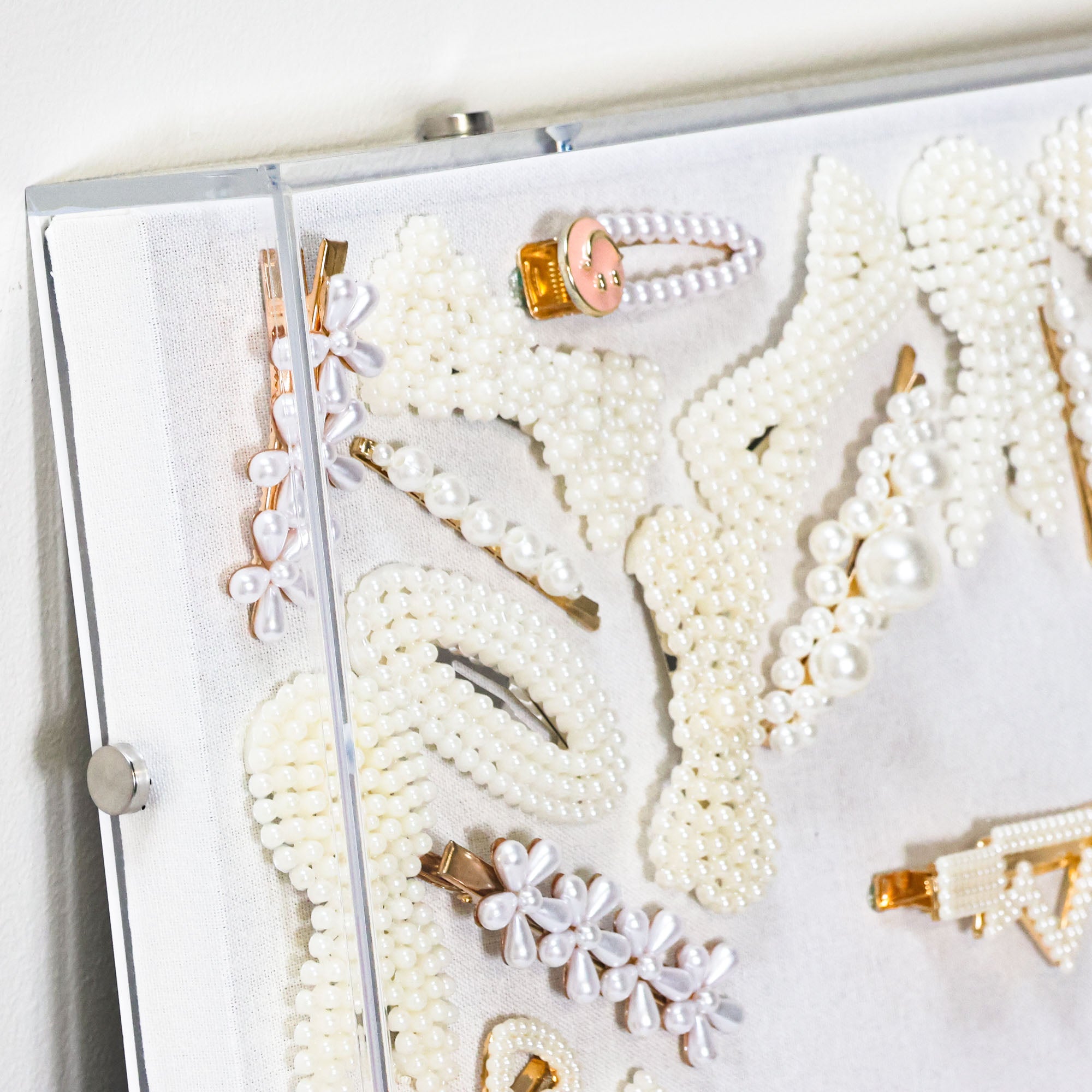 From the Tat Frederick studio, 'Where'd You Go Bernadette - Pearls' features pearl hair barrettes, hand-placed on canvas and framed in an acrylic shadowbox.