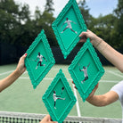 The Wimbledon Series captures the elegance and athleticism of tennis through hand-painted players frozen mid-serve, volley, and smash. Each figure is set against bold jade-green diamond frames, turning classic sport into pop-iconography.