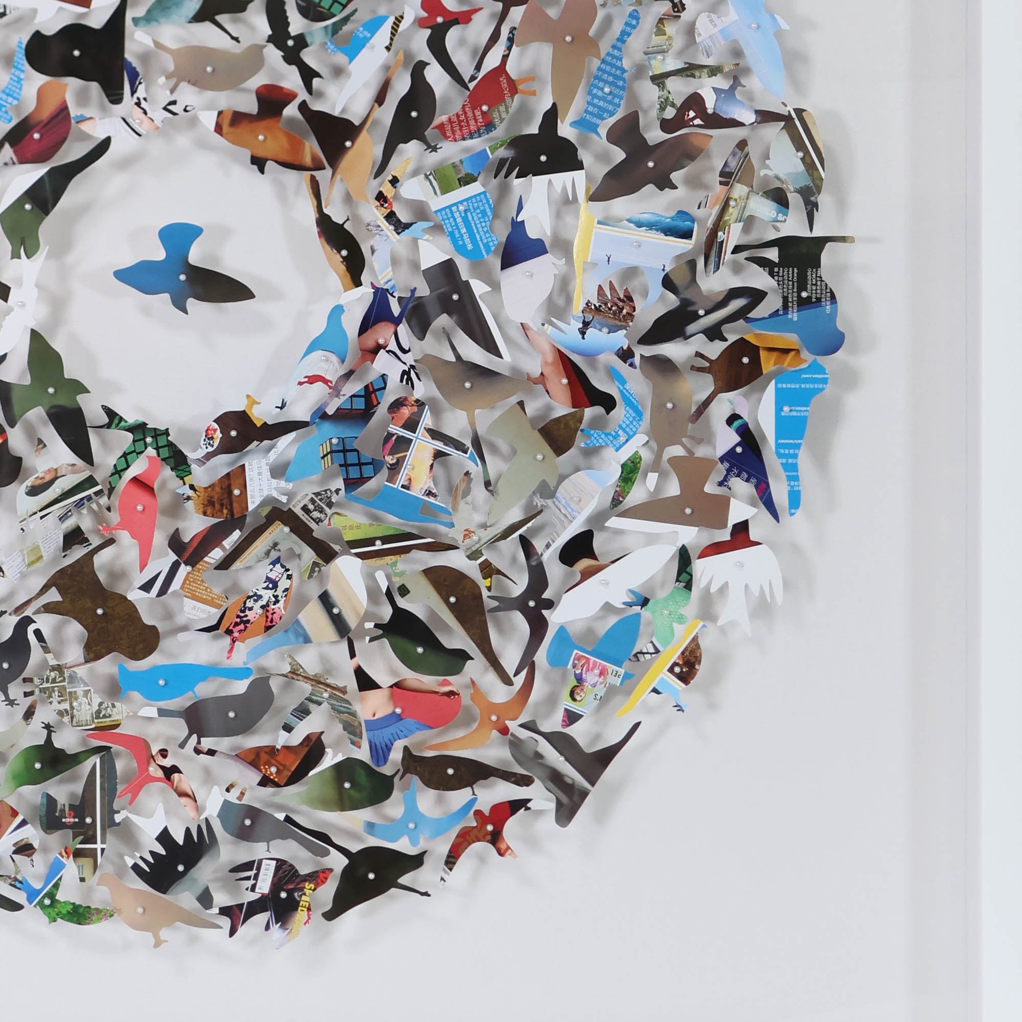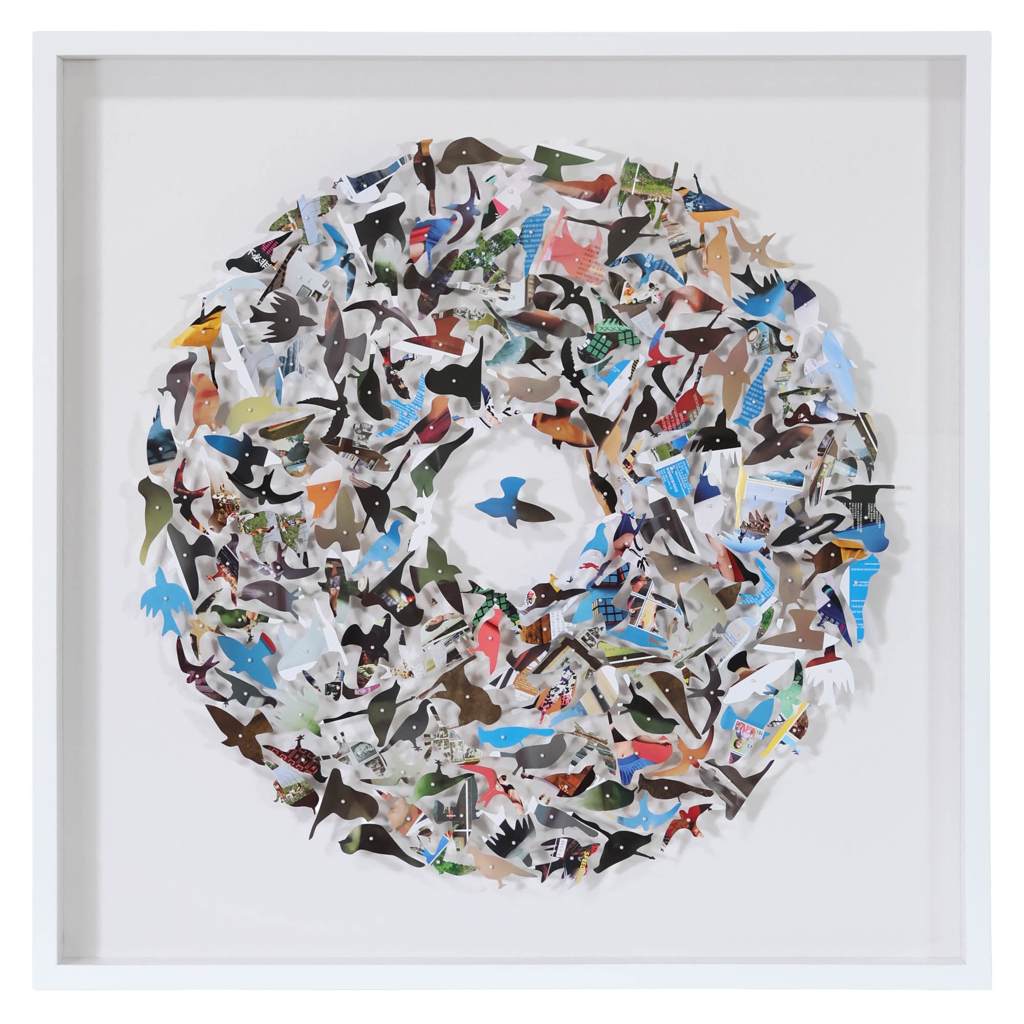 Framed multicolor 3D paper bird art of the Jen Lin Series. Each bird is hand cut and individually pinned to white linen.