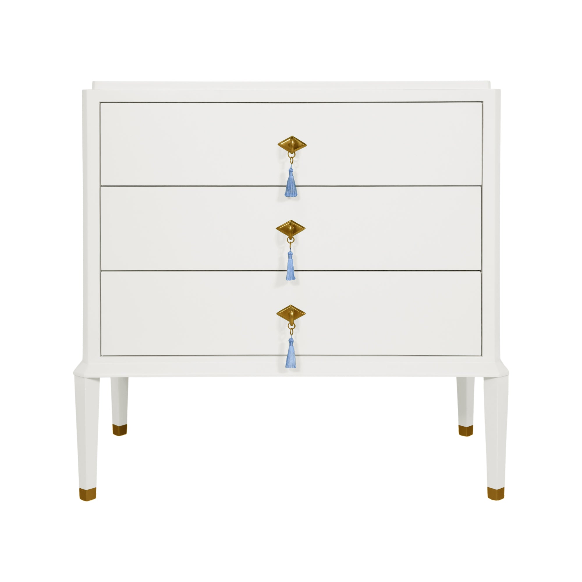 Our Clancy Chest is a cool, collected classic that still knows how to have a little fun. Dressed in matte white lacquer, this three-drawer beauty brings a fresh, polished look to any room while keeping things playful with its blue tassels and brass hardware.