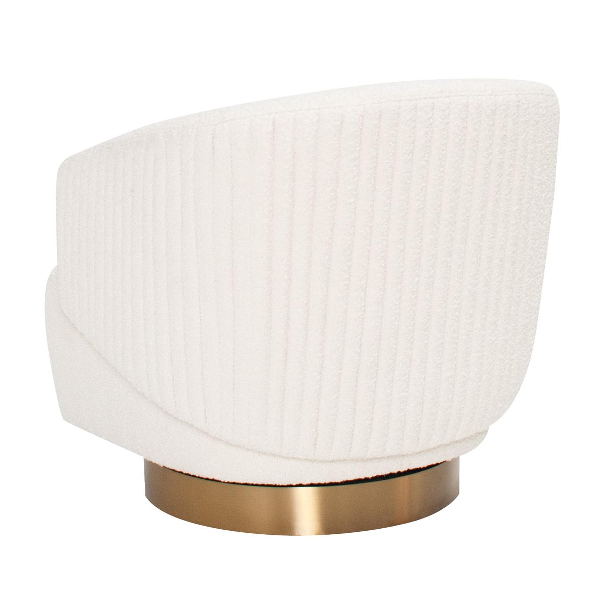 This swivel chair will have you spinning for days. A brass base gives it modern flair, while ivory boucle fabric provides soft texture. Plus, pleats on the back give this one extra interest that doesn't disappoint.