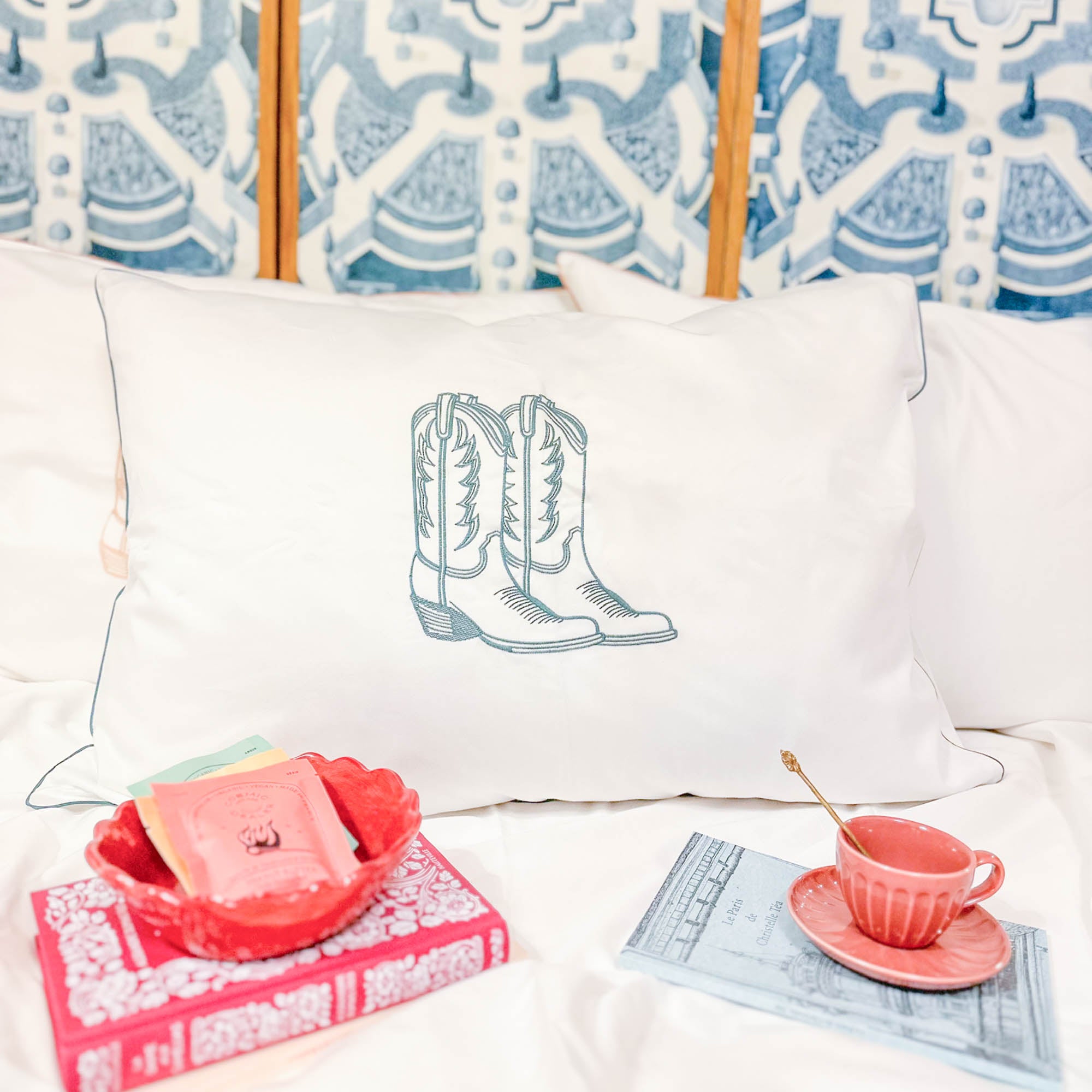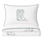 These duvet sets put the yee in your haw. Featuring custom-embroidered cowboy boots on crisp white cotton, this bedding brings a playful twist to classic Western charm.