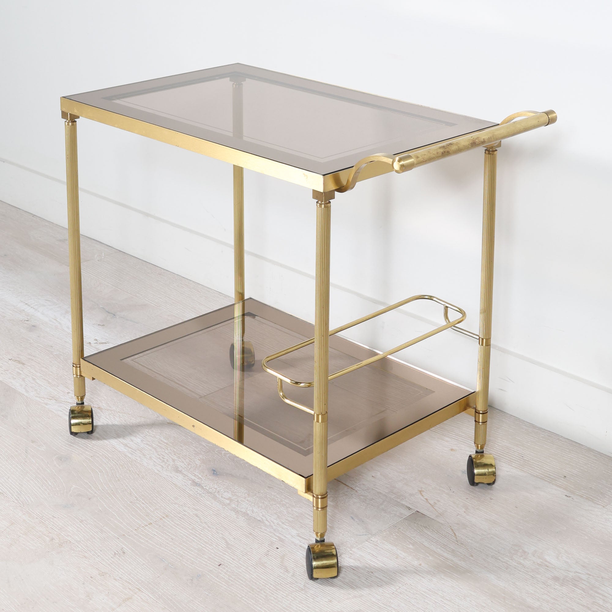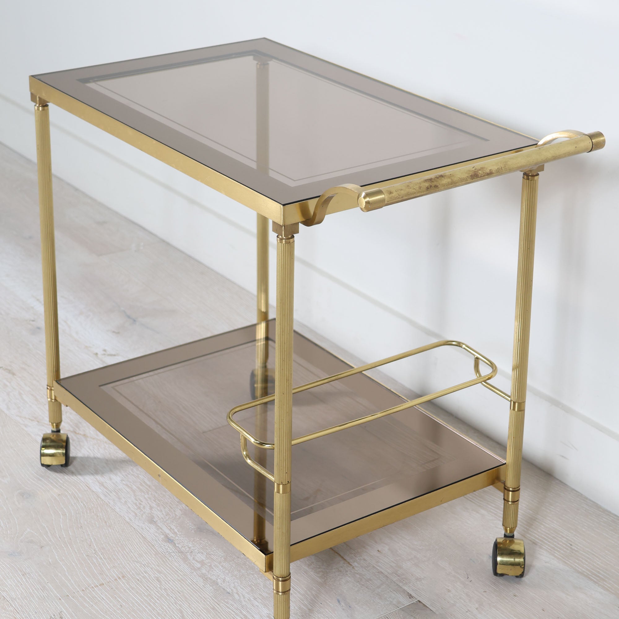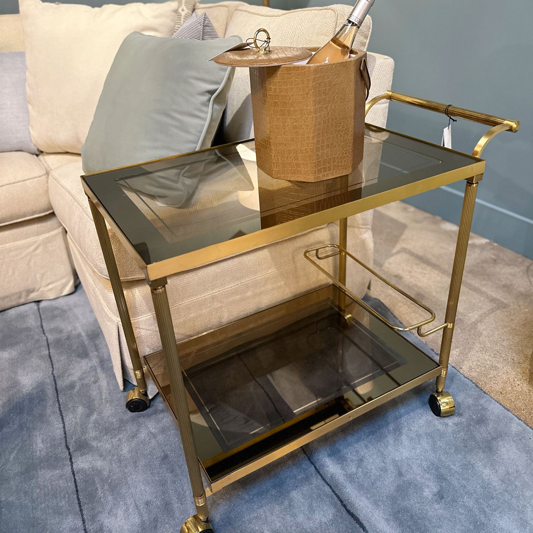 We simply could not pass up this glamorous French Deco style bar cart with its stylish shape and luxe smoke glass shelving. This vintage would be truly seductive with your beverages and styling of choice.