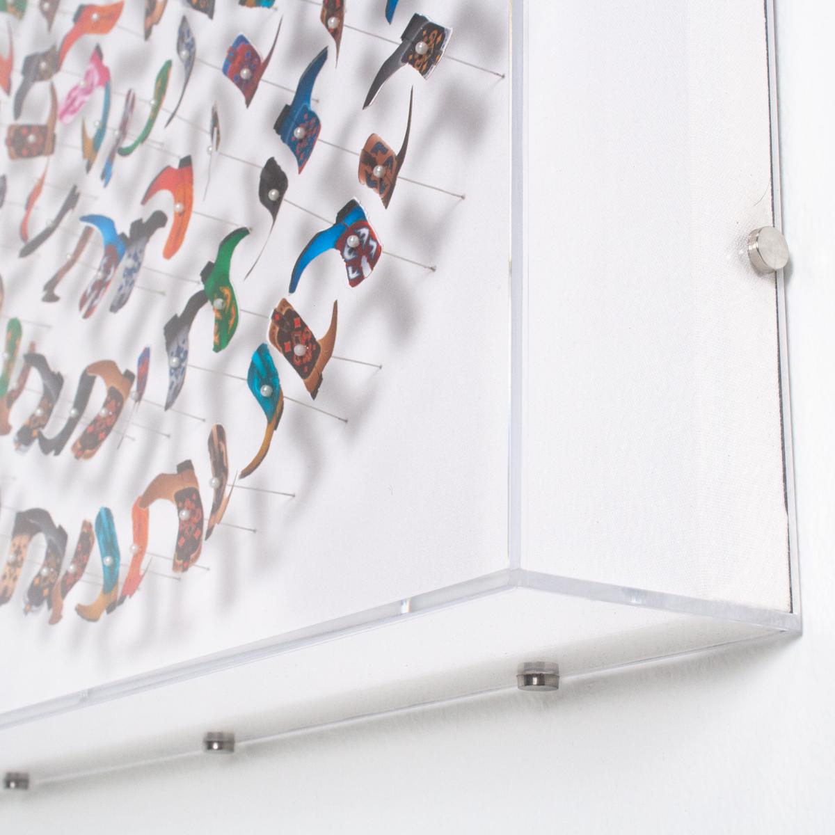 Hand-cut cowboy boots are individually placed on white canvas and framed in an acrylic shadowbox. Each piece is handmade and will have some variations in color and finish.