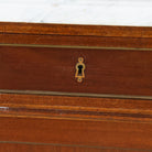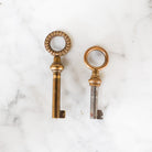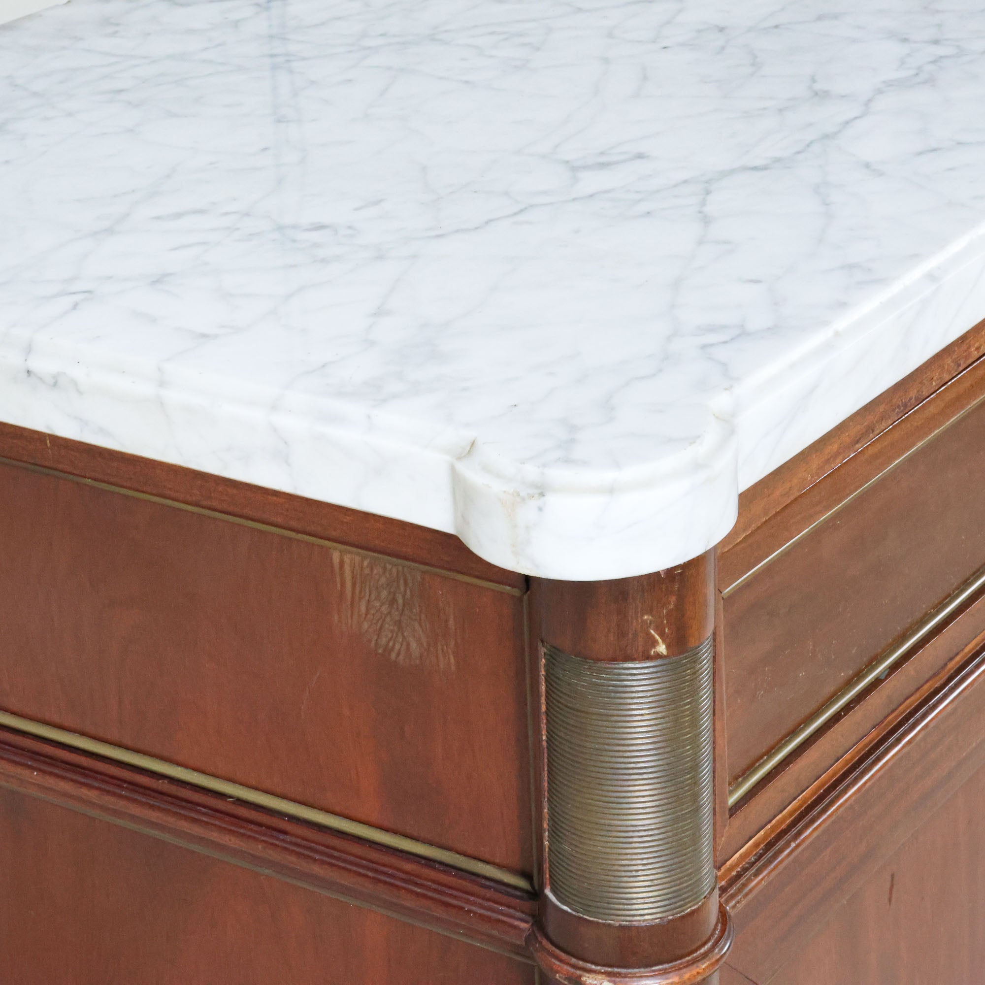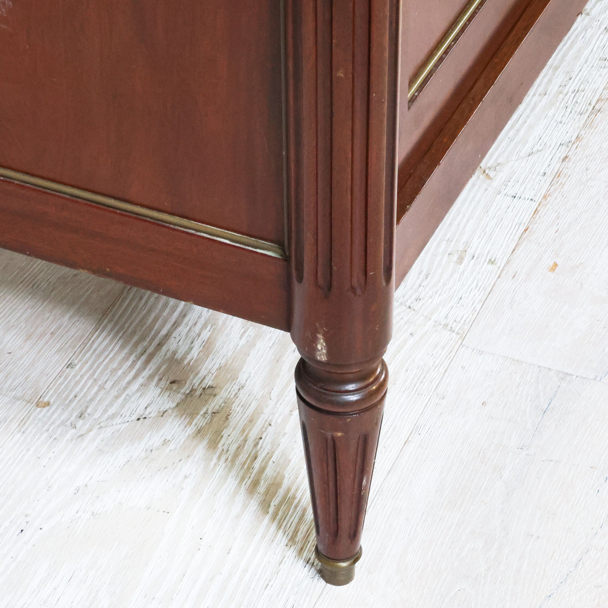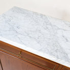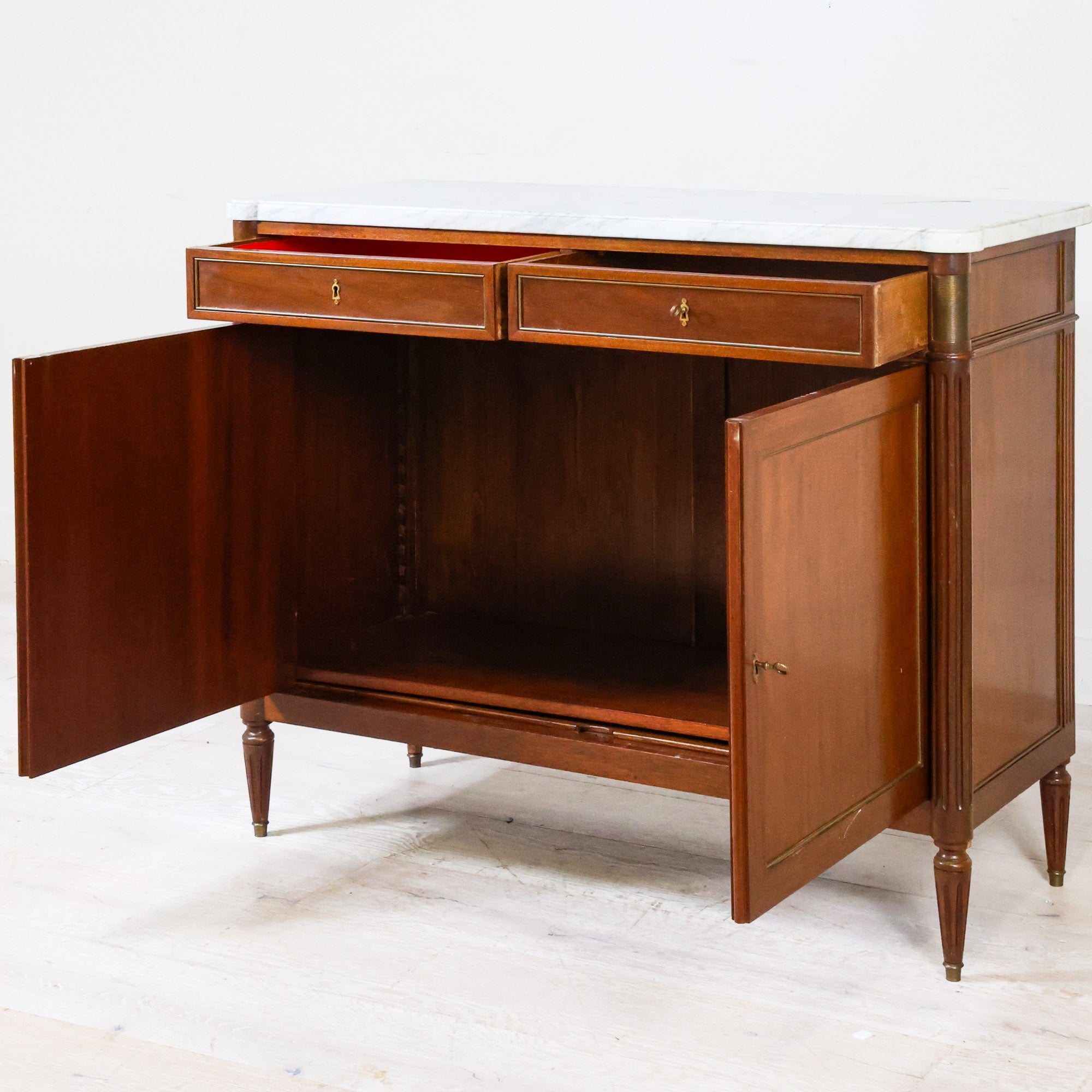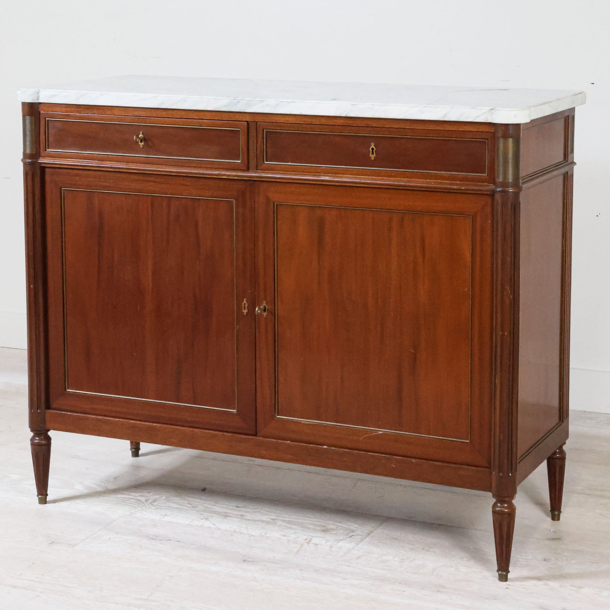 In the style of Louis XVI, this french buffet features a stunning white marble top with grey veining. Original brass keyhole escutcheons and 2 original keys gleam against the traditional stain. Fluting details on the sides + brass trim give this vintage find a regal feel.
