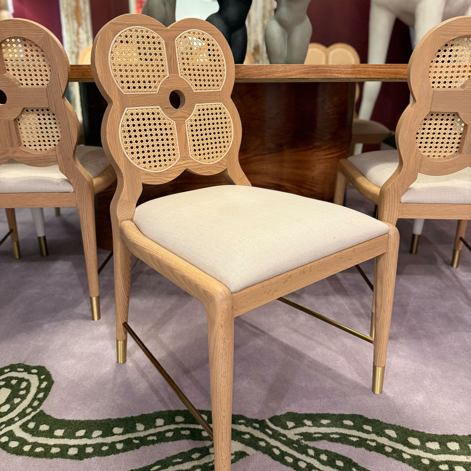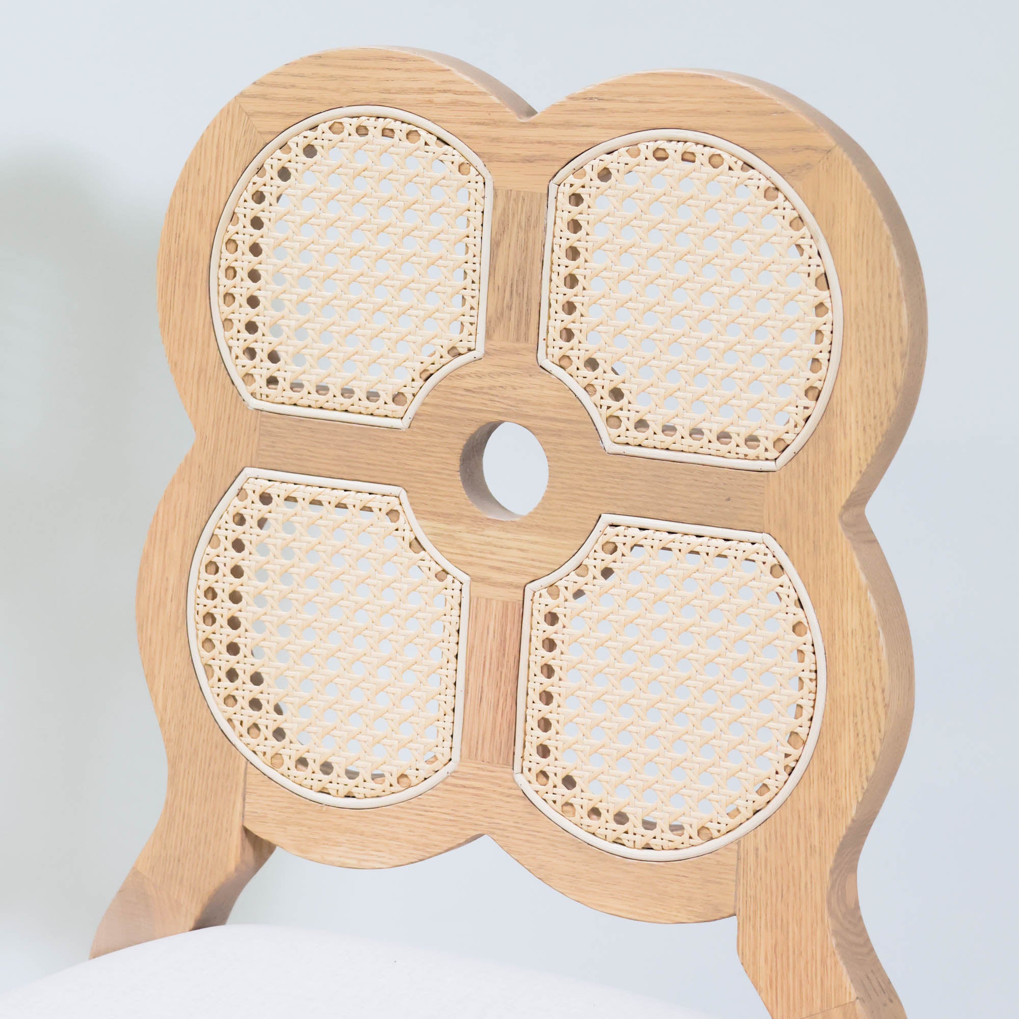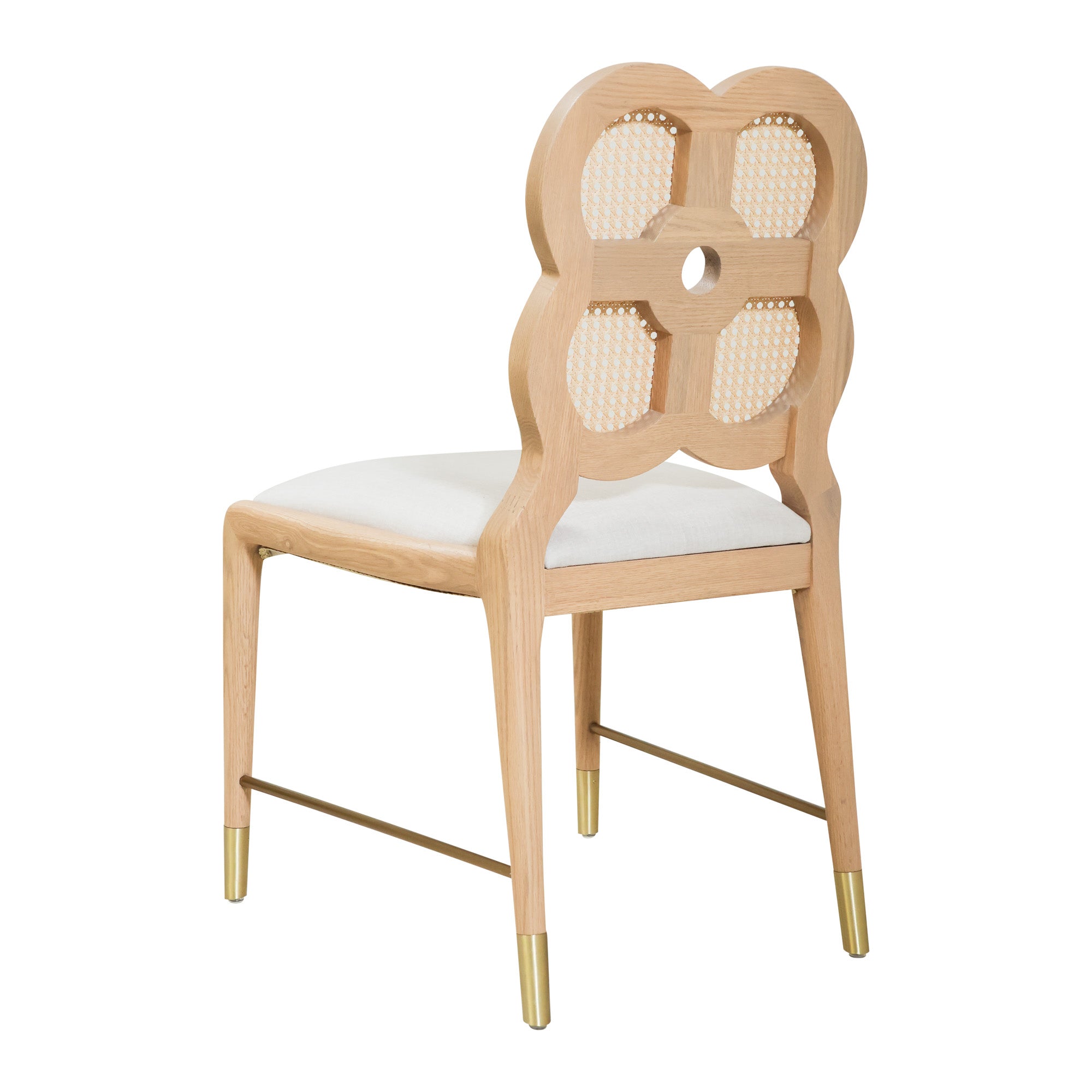 Add a touch of charm to your dining space with our Moreland Dining Chair. Featuring a playful clover-shaped back, light oak wood, and soft ivory linen velvet fabric, it’s a blend of elegance and whimsy.