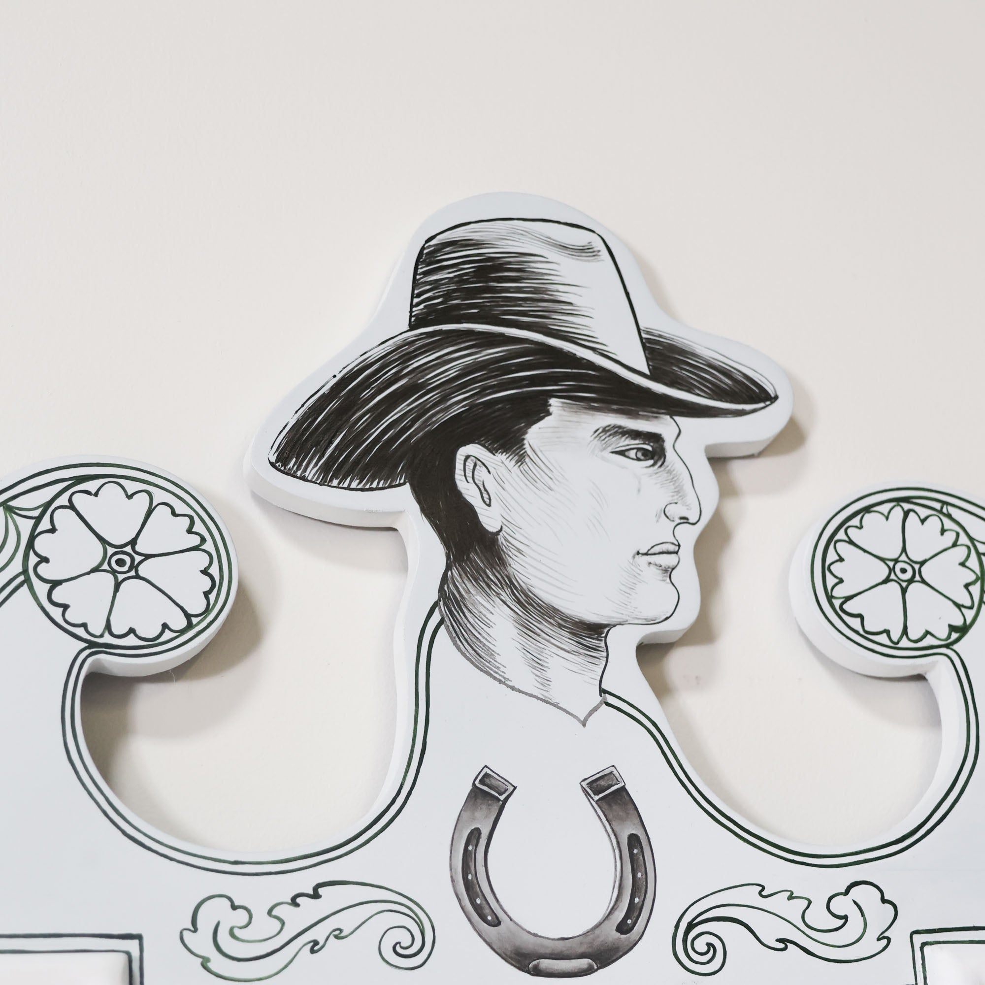 Hand-painted in white and black, he’s equal parts Marlboro Man and museum piece. The etched horseshoe and star details frame his chiseled reflection with charm and a touch of swagger.