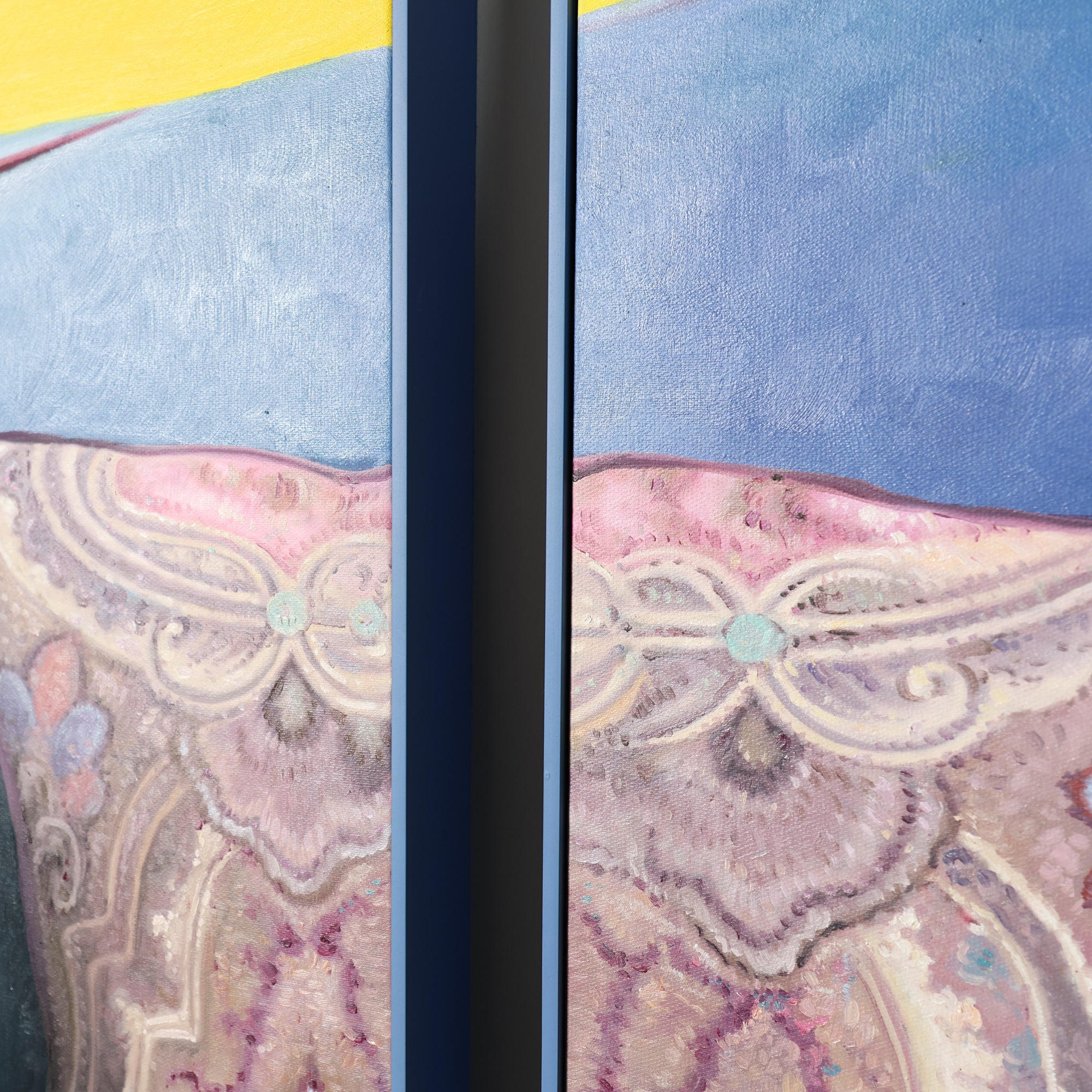 We love this vibrant triptych that turns a classic settee into modern art. Bold color, playful detail, and instant room-making energy. Hand-painted in the Tat Frederick studio.