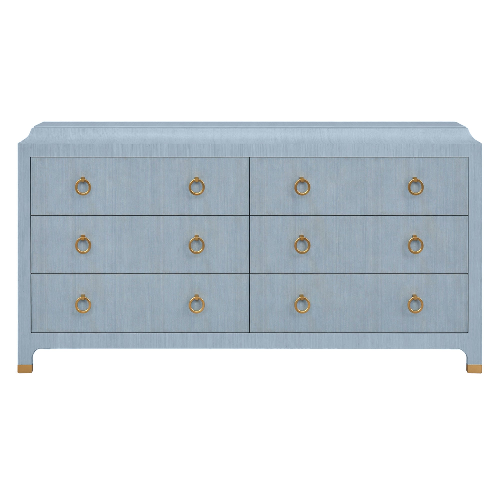 Our Jackie Dresser in Tulum Grasscloth features six roomy drawers that make storage a breeze. Brass ring pulls add the finishing touch against a natural grasscloth finish that's sealed for durability.