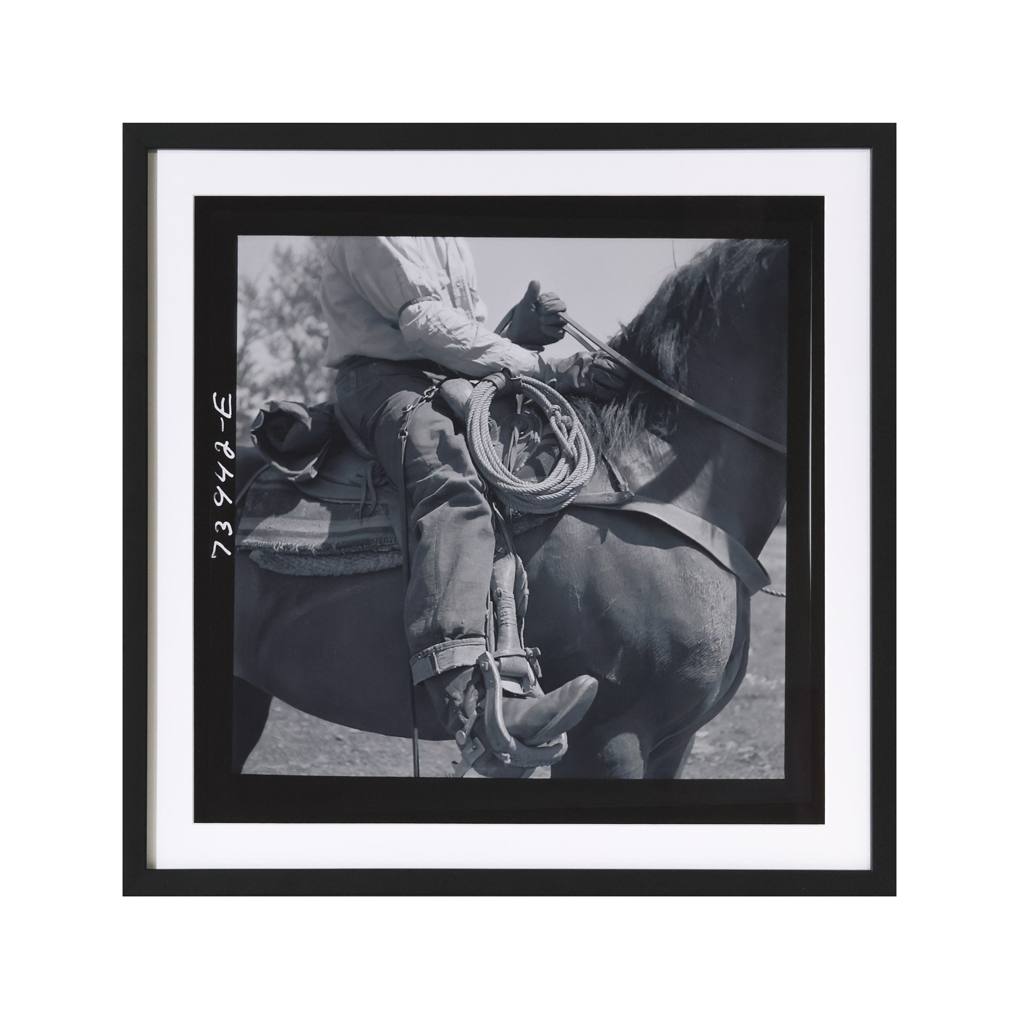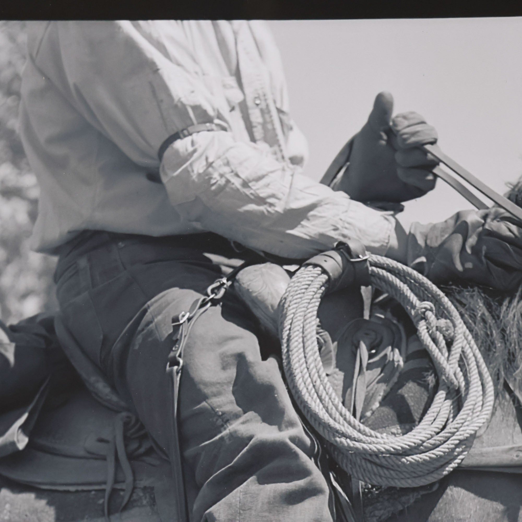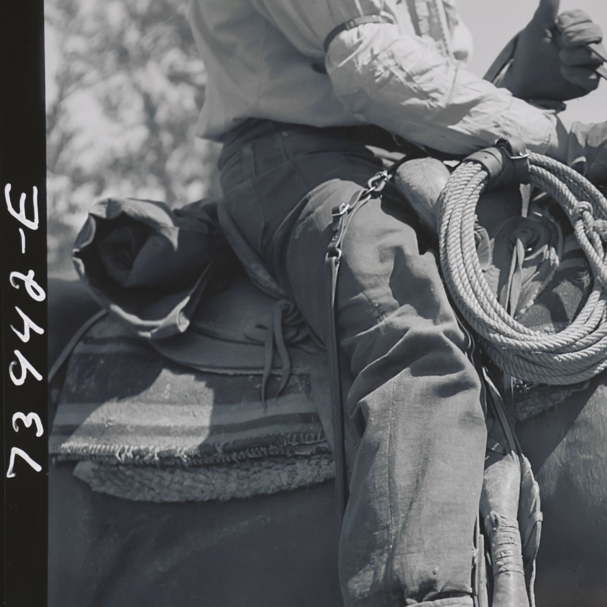 We love this vintage photograph by Russell Lee featuring a cowboy on horseback near Ola, Idaho cira the mid-1900s. The film slide number adds to the vintage appeal.