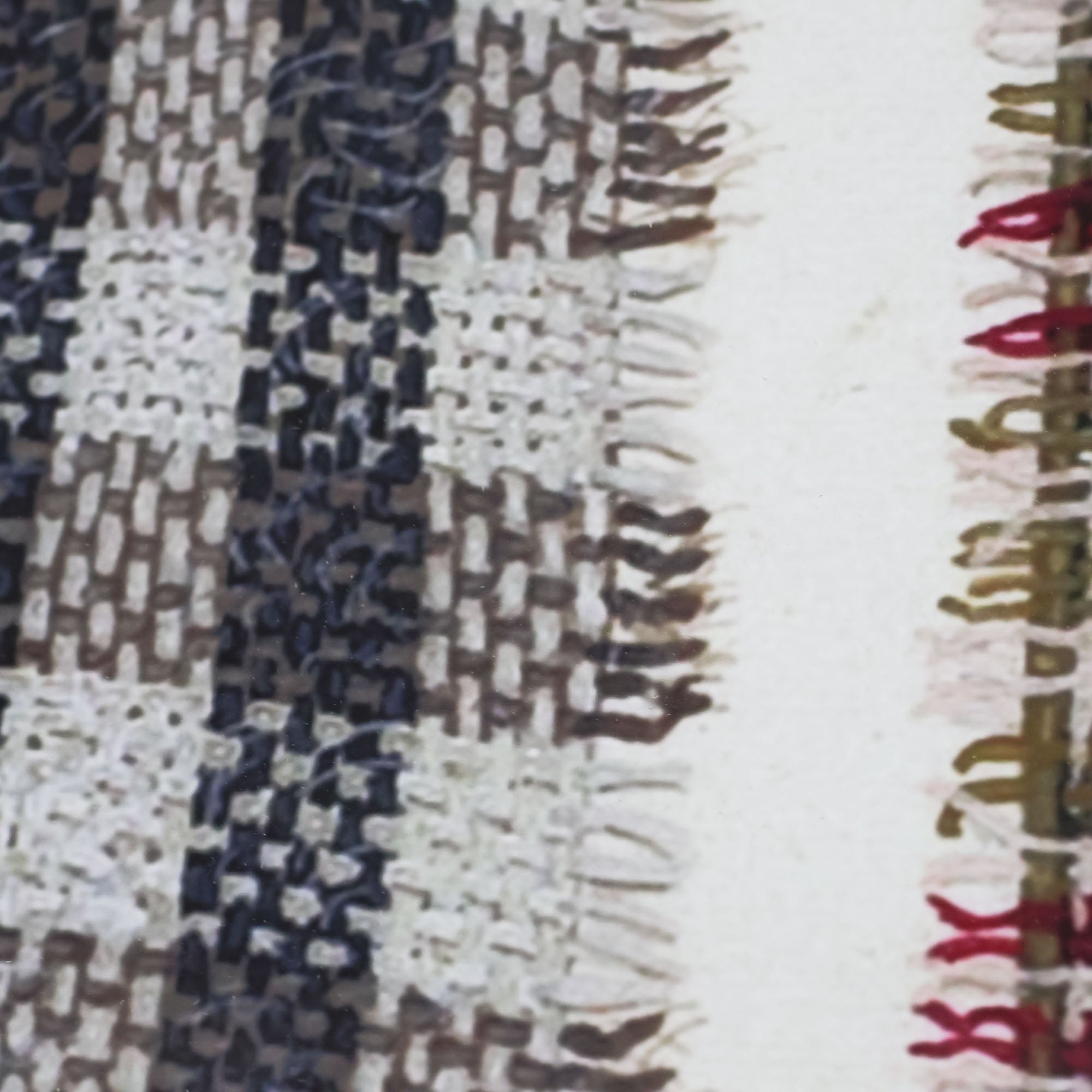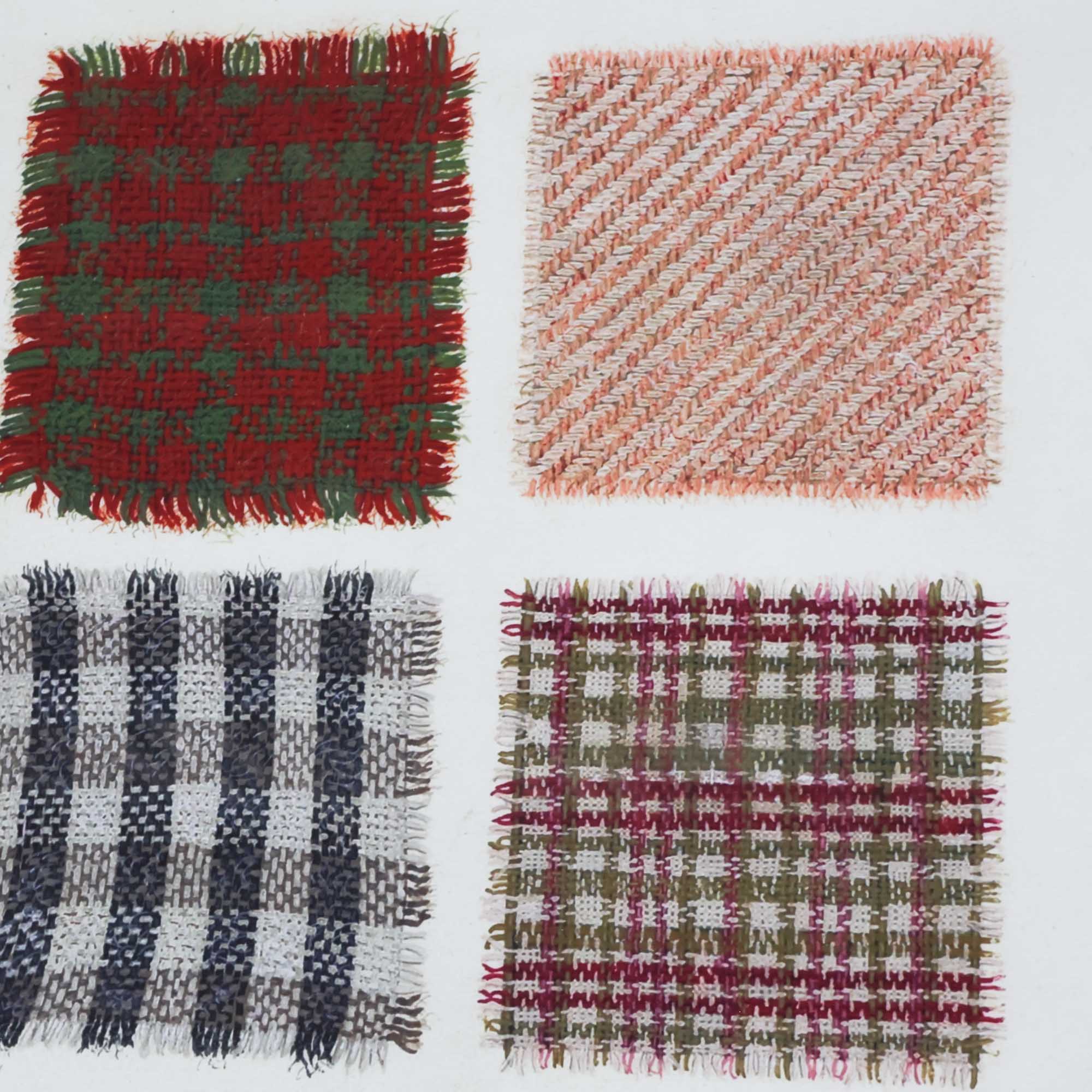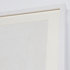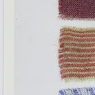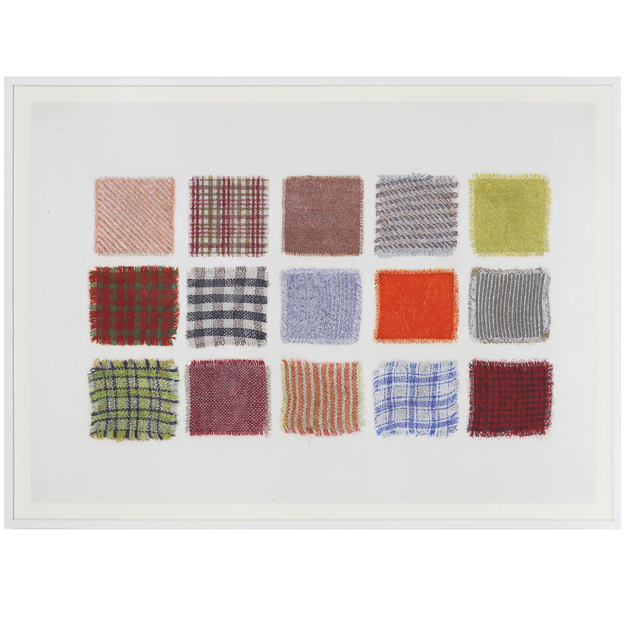Like a quilt from grandma, this piece feels full of memories. Print of different colored squares of cloth on linen, framed in white with an ivory matte.