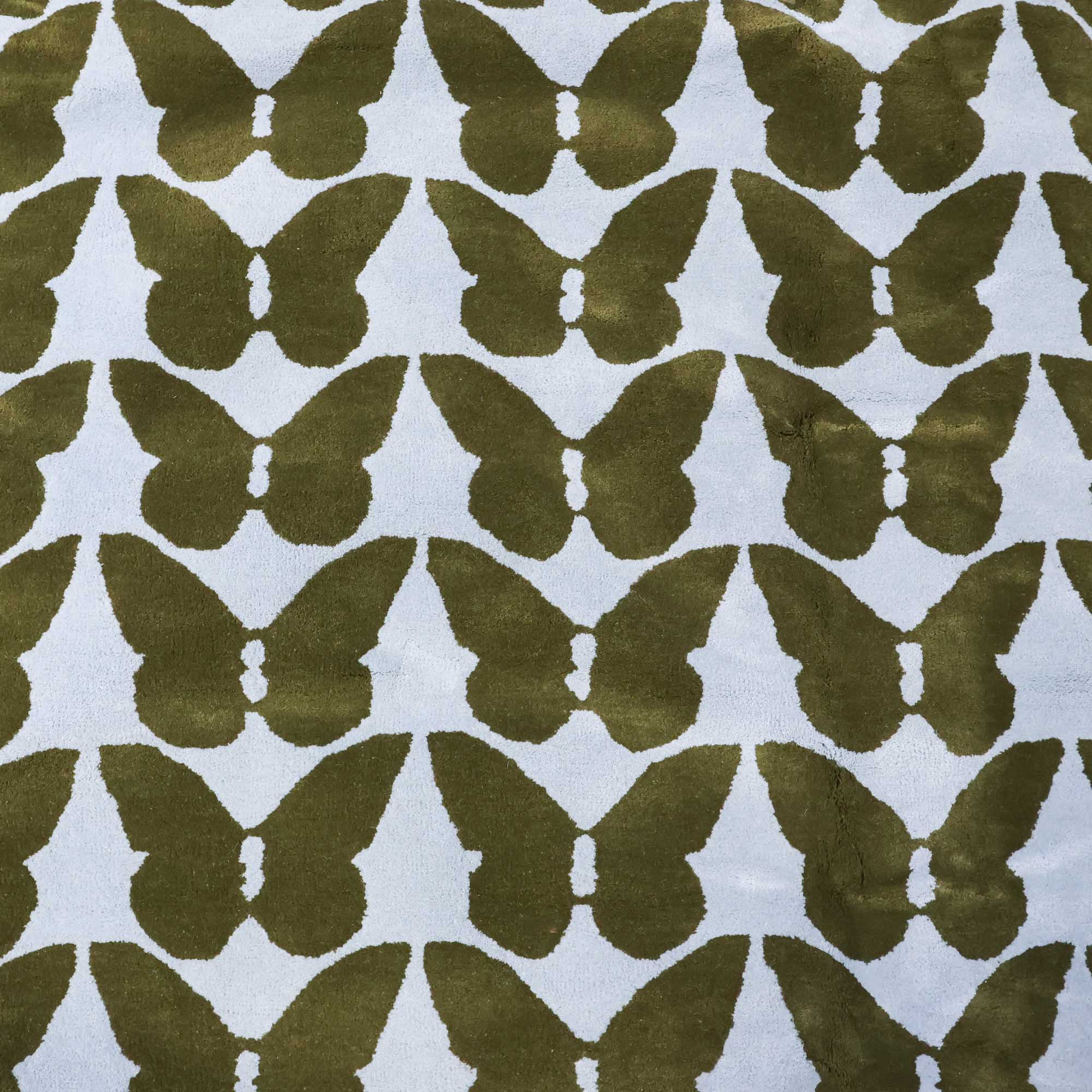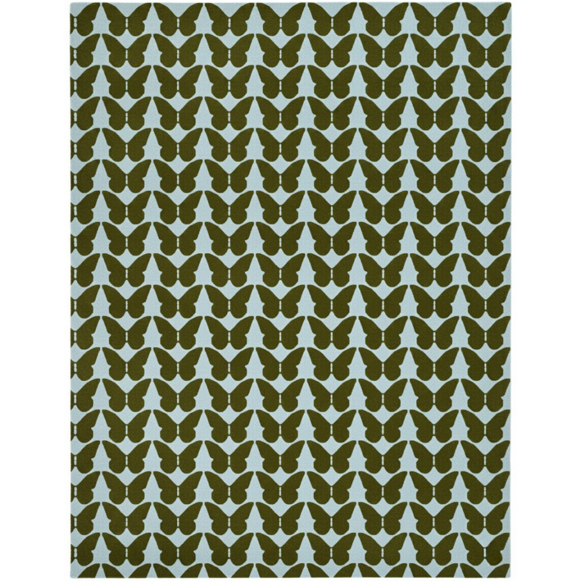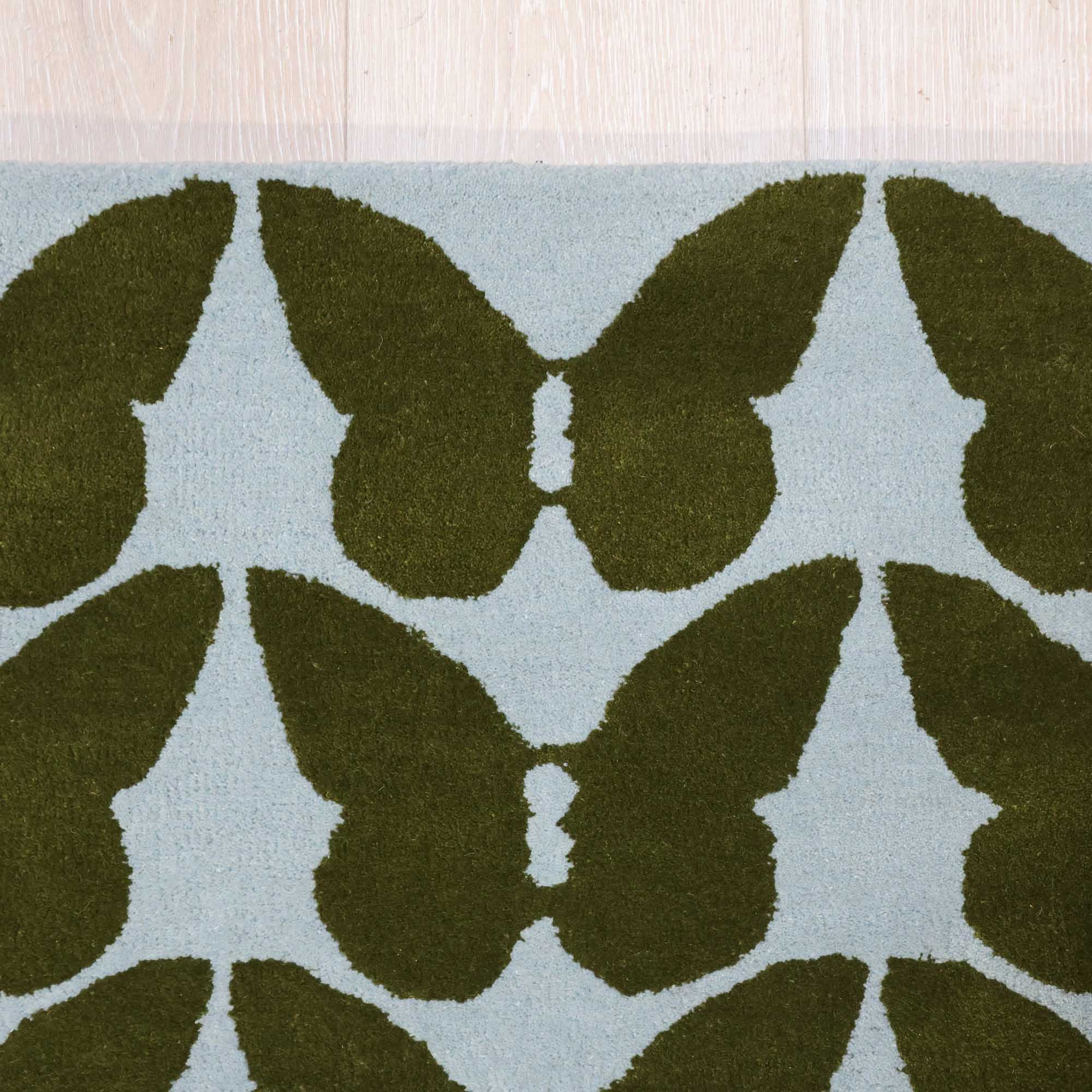 Meet Bessie: the butterfly-kissed rug that instantly lifts a room’s mood. This tufted beauty layers a soft sky-blue backdrop with a rhythmic parade of deep olive silhouettes, creating a graphic, gently whimsical pattern.