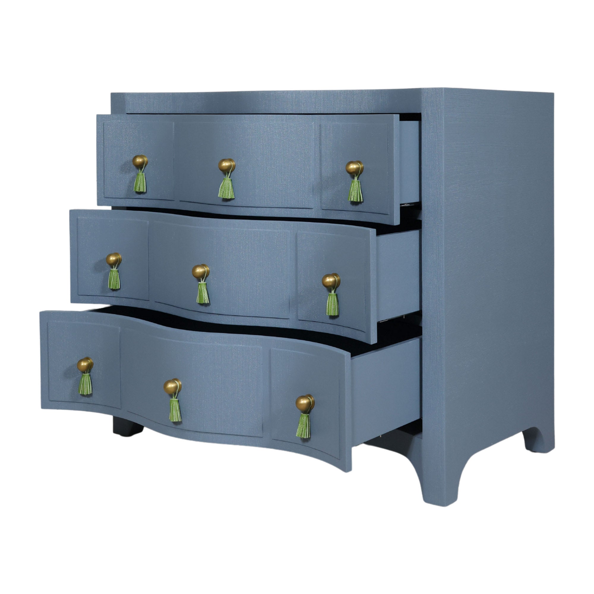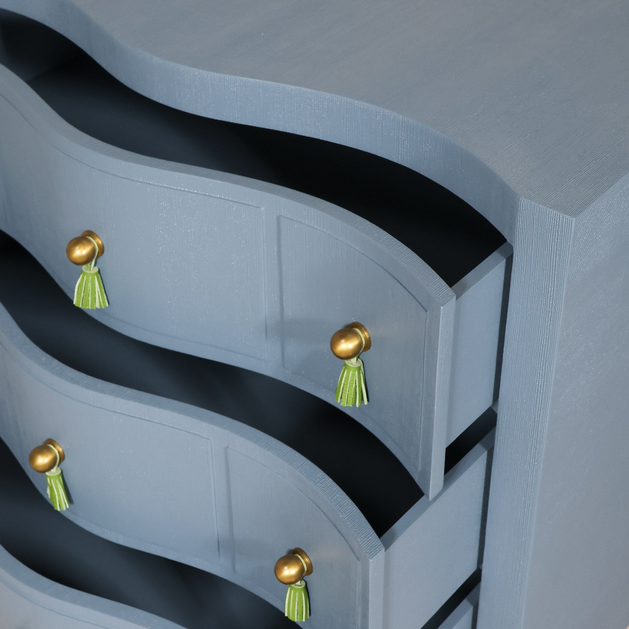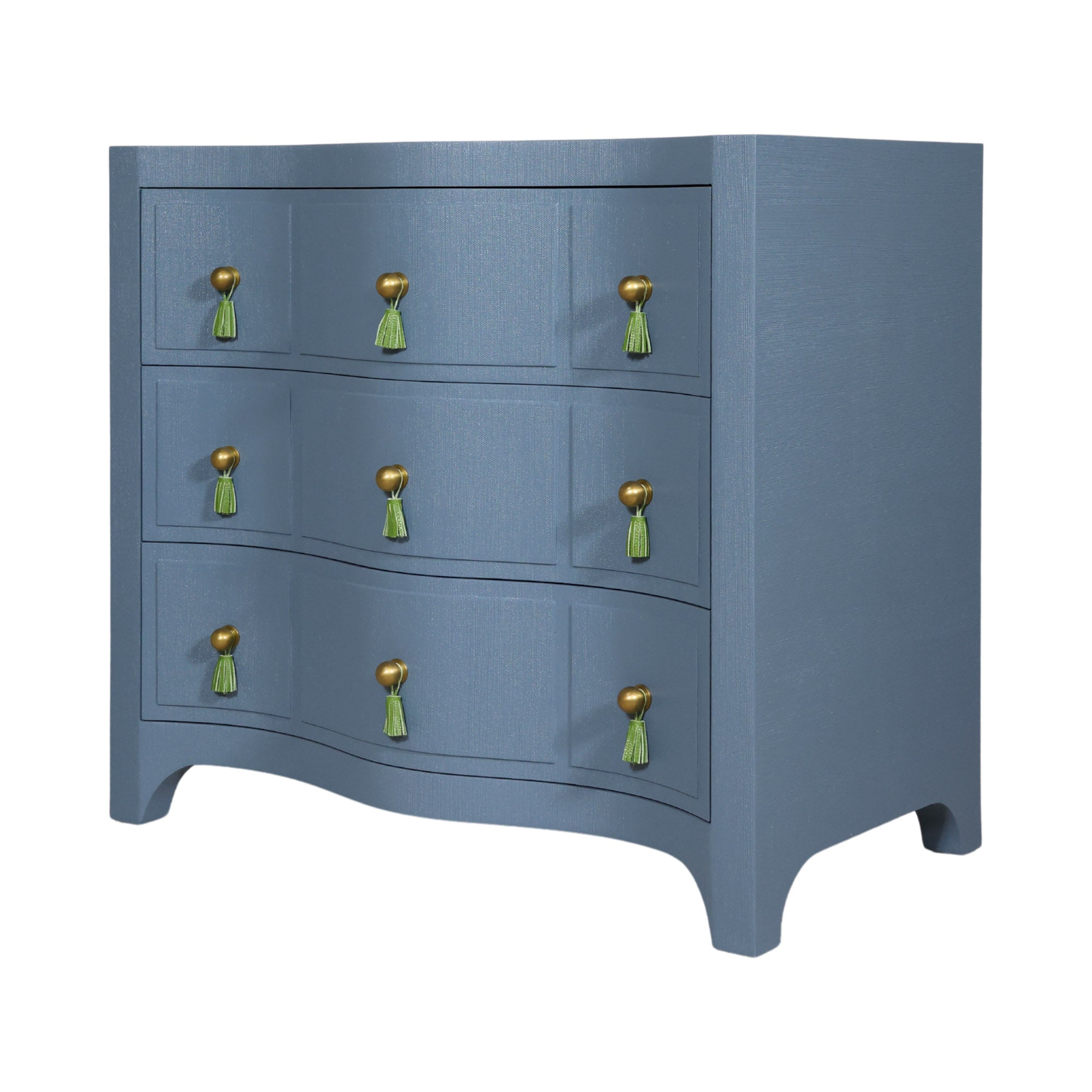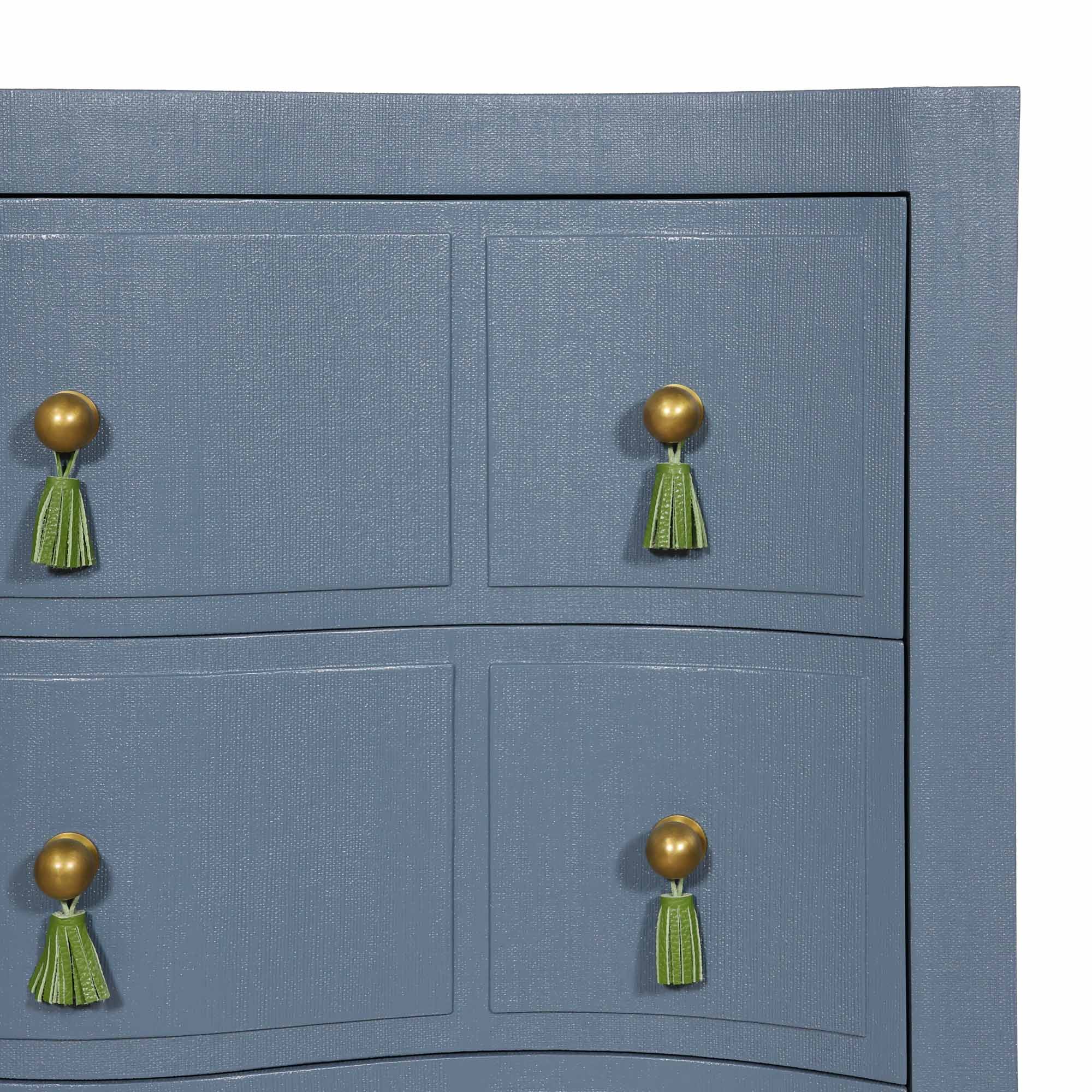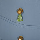 Charlie is here to make an entrance with curves that flirt, tassels that tease, and a blue vinyl finish that turns up the heat. Channeling Dorothy Draper's iconic glamour with a dose of modern edge, Charlie blends old-school sophistication with a wink of rebellion. Brass ball knobs and green leather tassels strike the perfect balance between playful and polished.