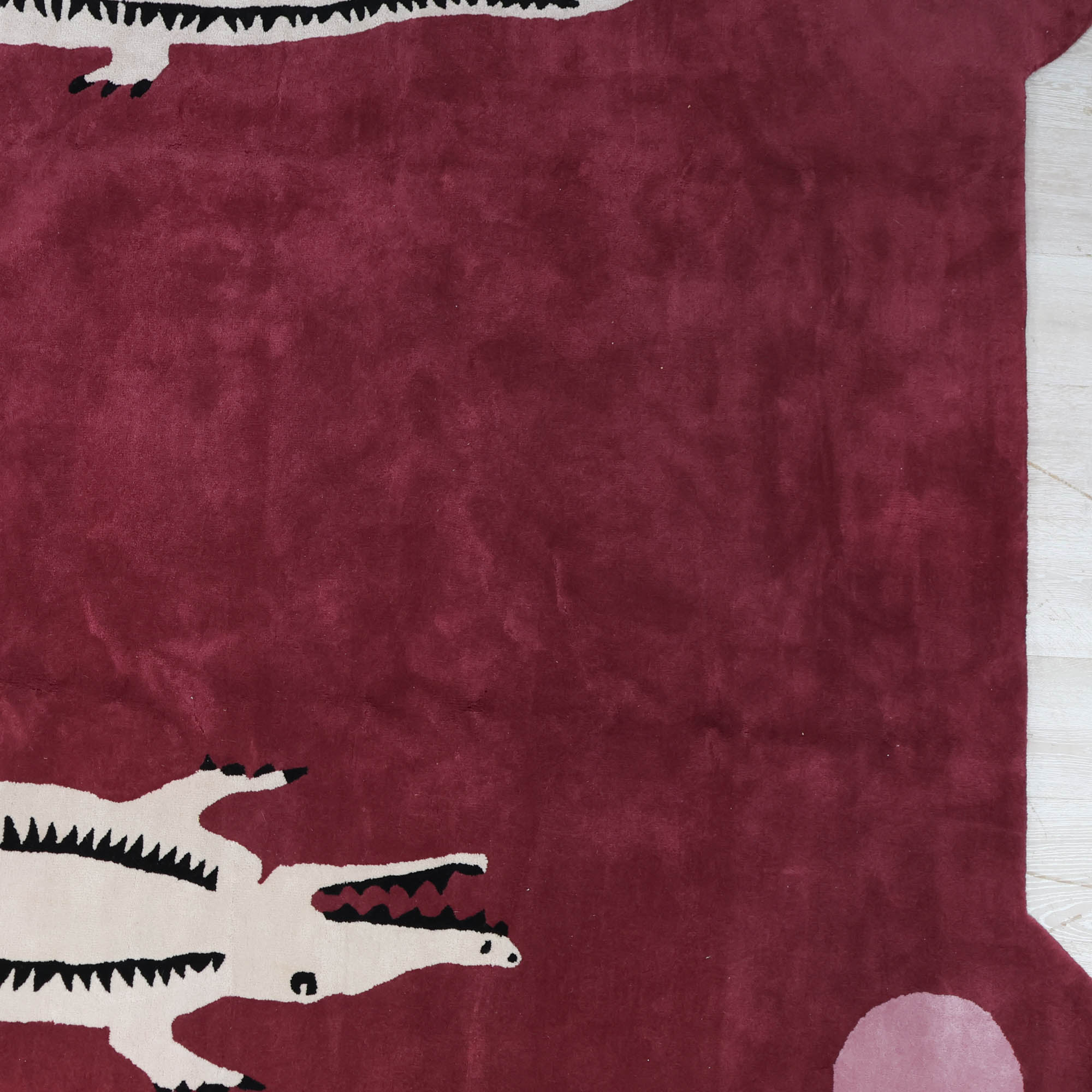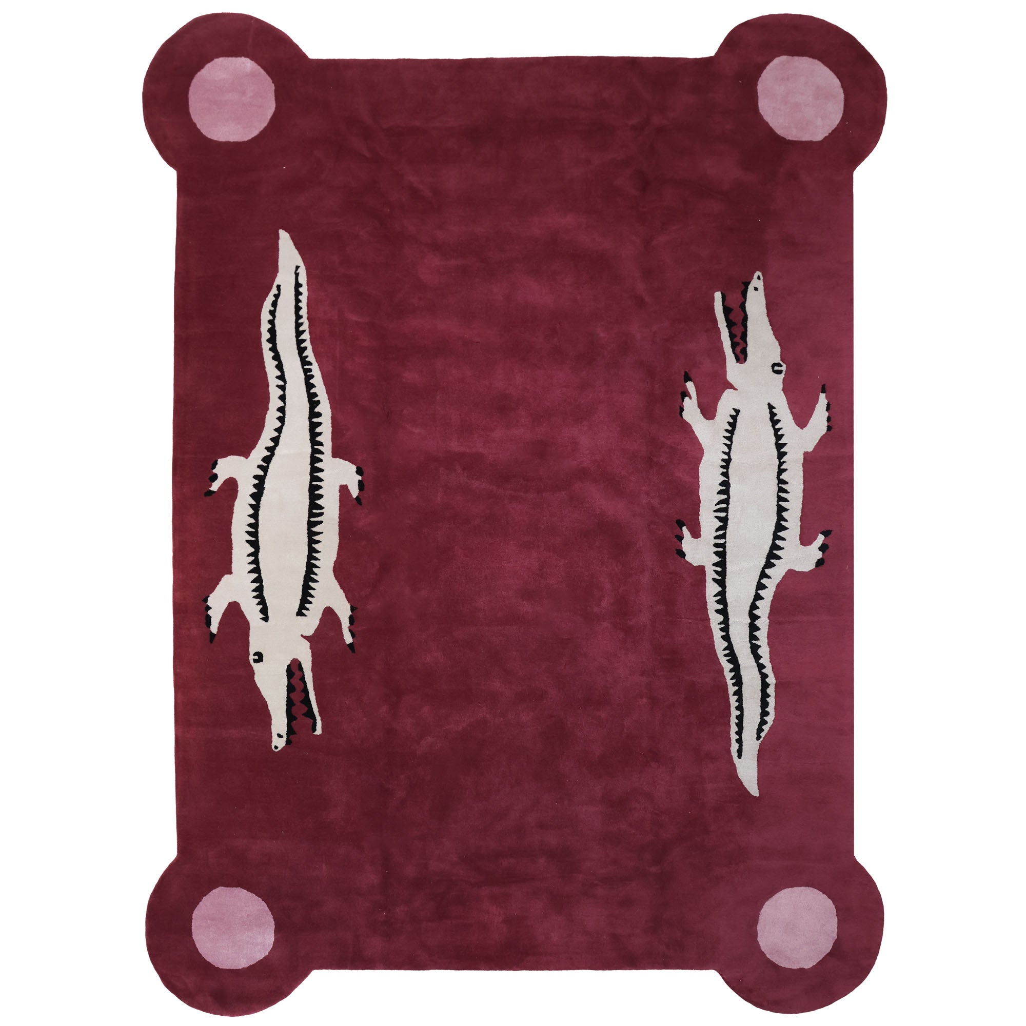 Our El Royale Tufted Rug brings a wink of wild to any room. Hand-tufted in wool, it features bold ivory alligators stretched across a deep berry ground, with oversized rose pink circles anchoring each corner. Cheeky and chic, this rug is built to last and impossible to ignore — a true conversation starter for your space.