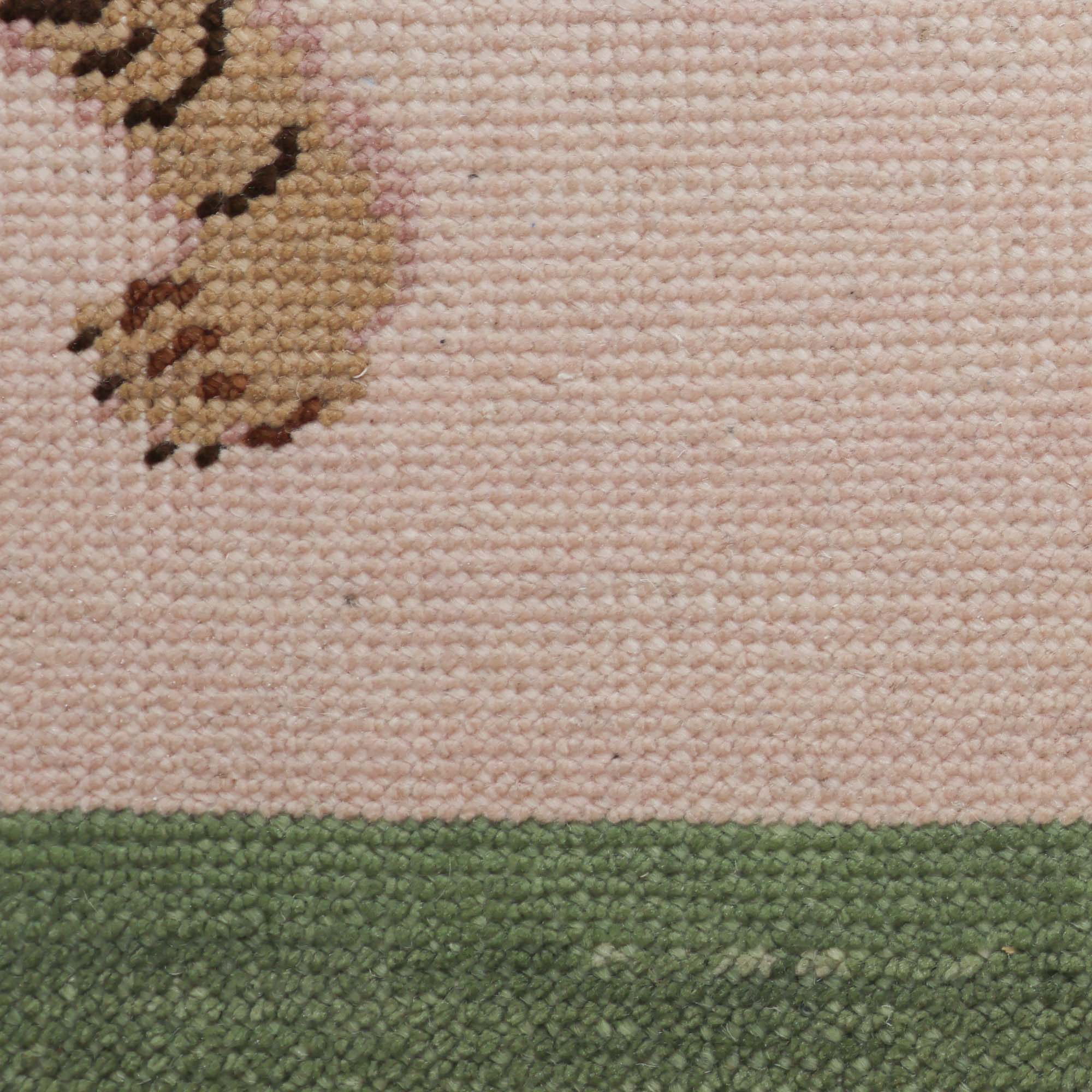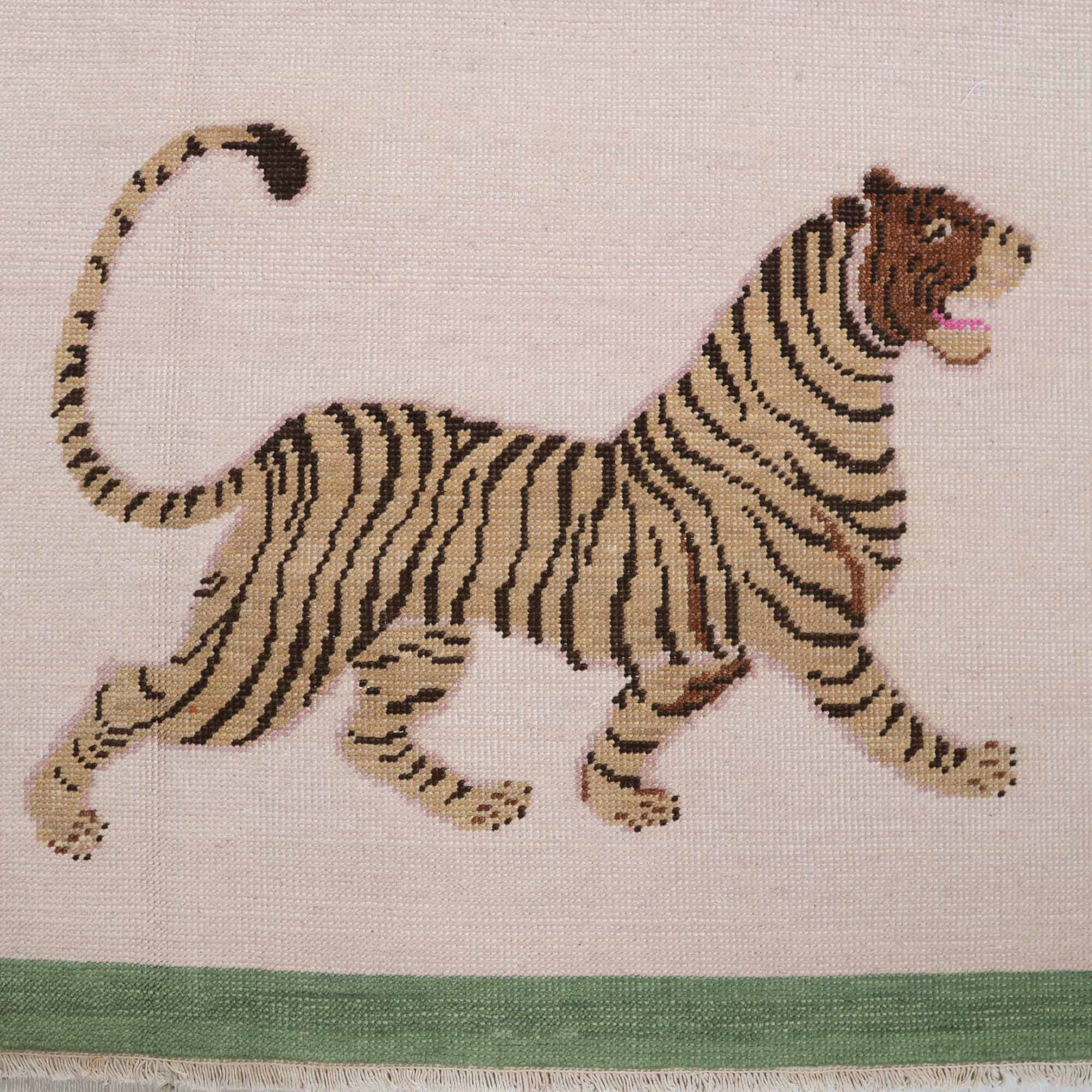 This custom oushak-inspired wool rug was designed by Scout and hand woven with a Turkish-style knot by artisans in India. It features a tan background with brown tigers and a green border with fringe.