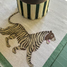 Bring on the drama. The Elton prowls with four striped tigers stationed at each corner, circling a wide field of soft blush and framed in green. It’s equal parts fierce and refined—an animal motif reimagined with a wink of sophistication.