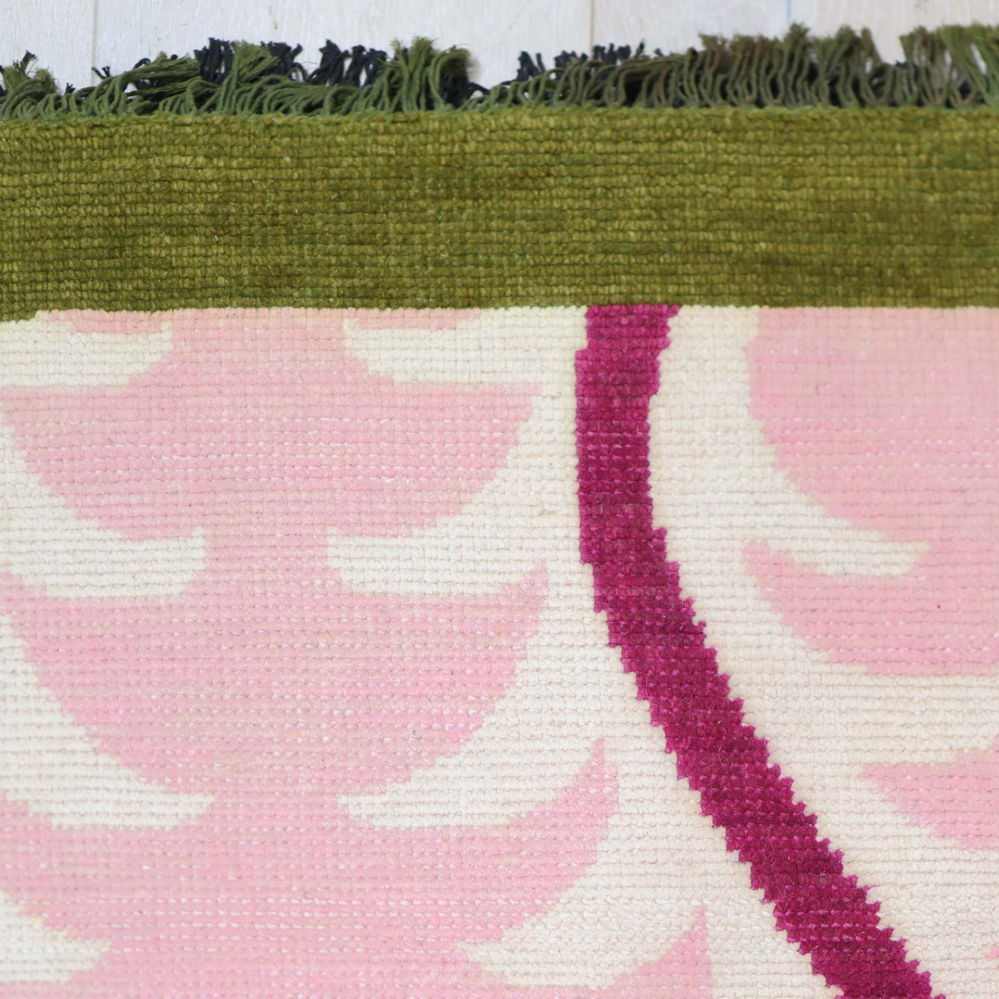 Soft blush meets sculptural geometry. Undulating waves in pink, ivory, and berry create a striking yet soft geometry, framed in olive green.
