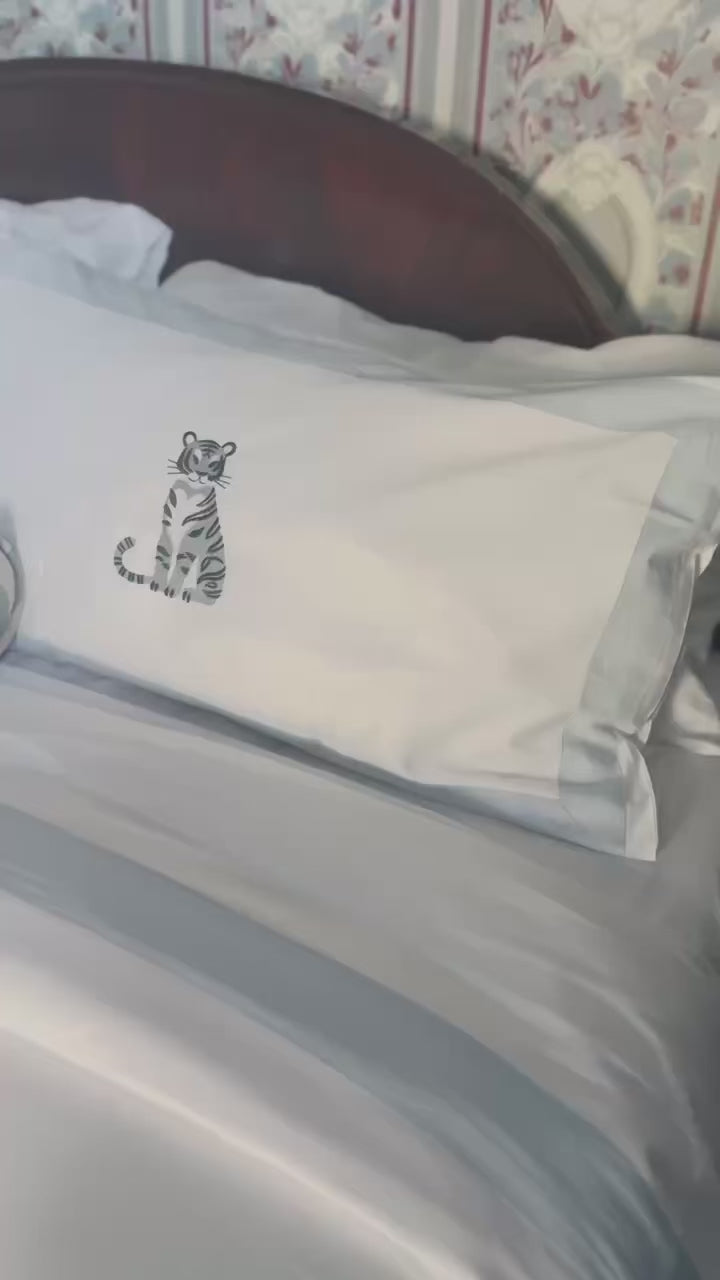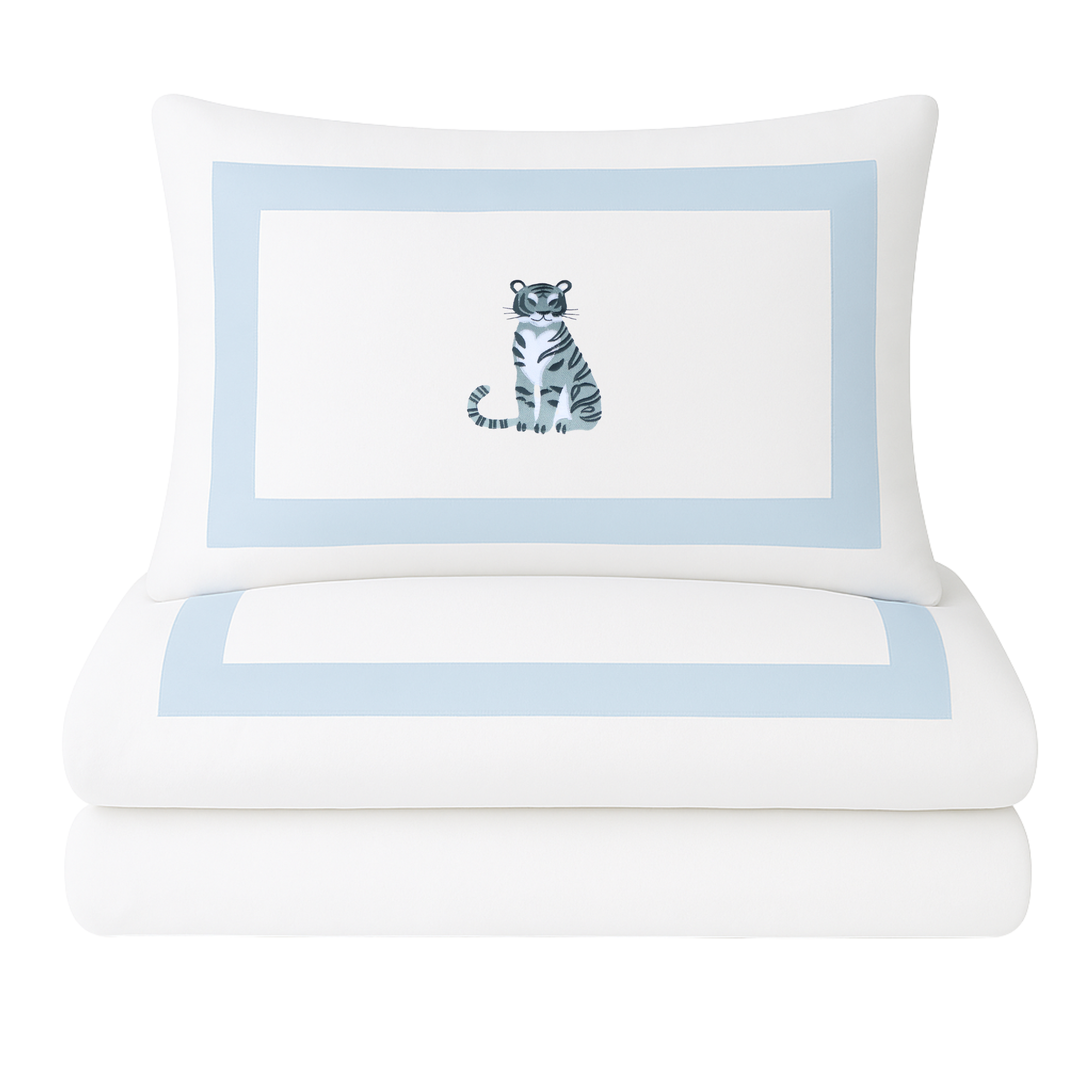 These duvet sets bring out your wild side. Featuring a custom embroidered blue tiger on crisp white cotton, this bedding adds a playful bite to classic design.