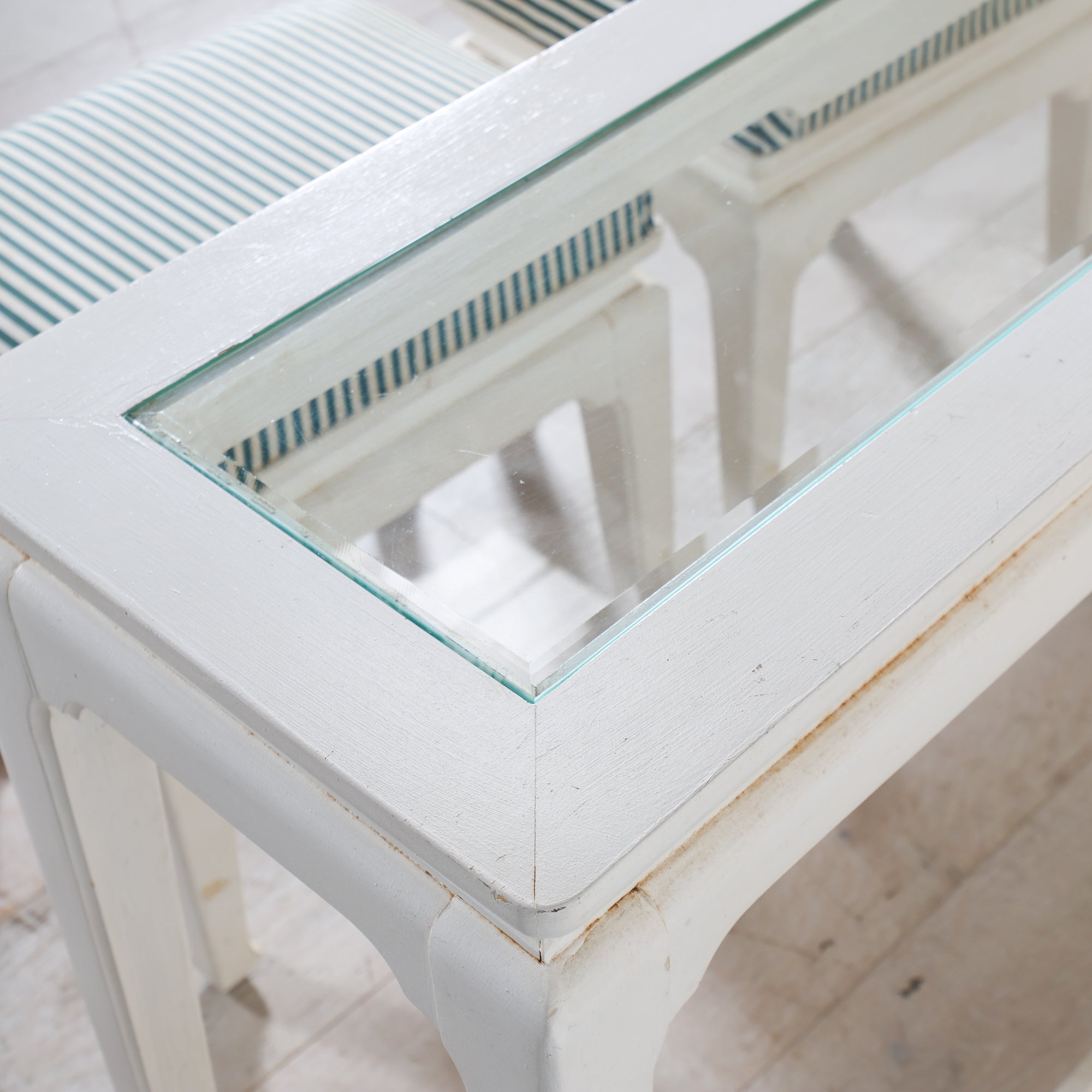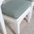 This table boasts asian inspired details. Matching benches, featuring striped upholstery, tuck nicely under the table and feature the same general shape.