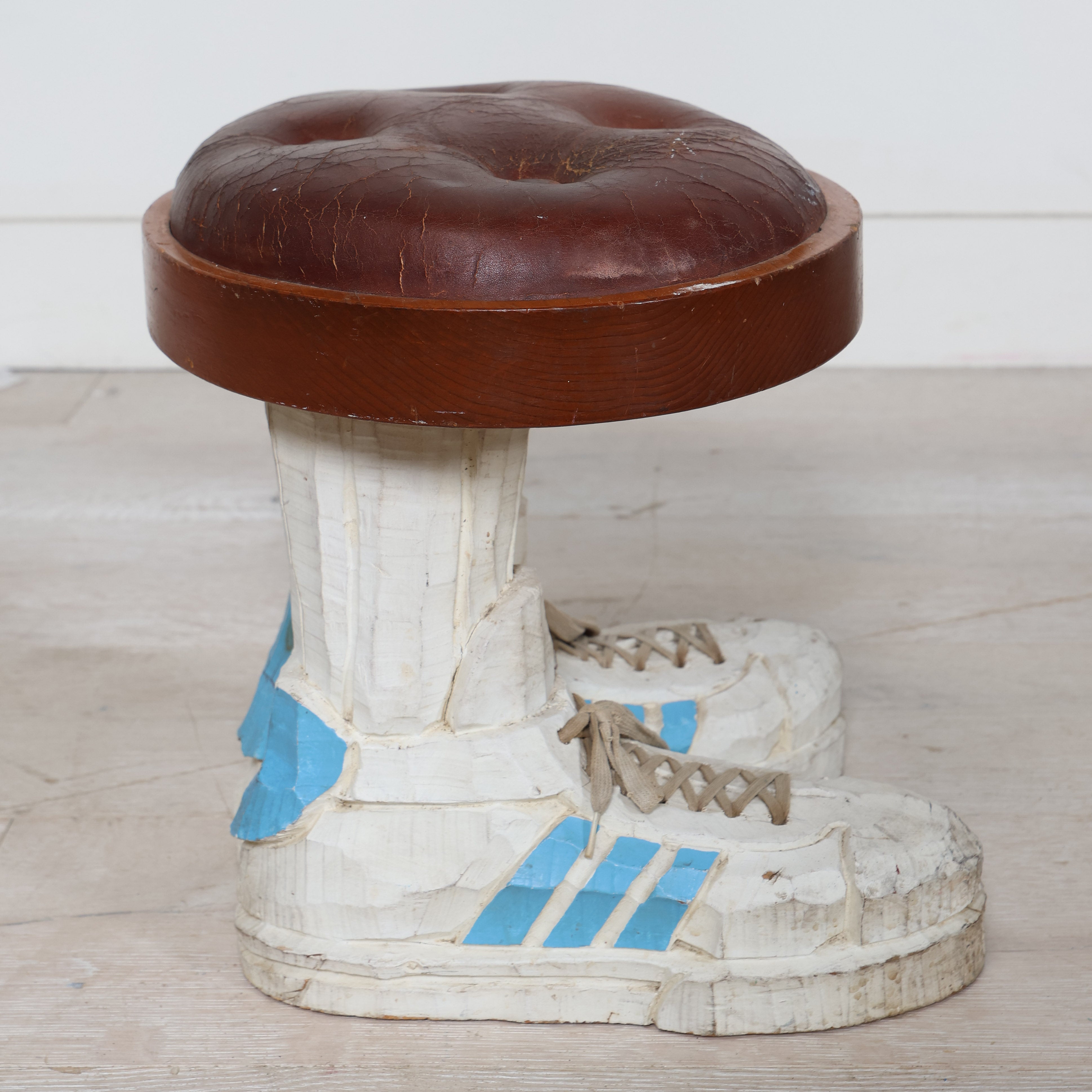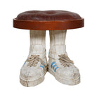 This cheeky side table is topped with a classic wood and leather seat and grounded by a very unexpected base - hand carved wooden sneakers.