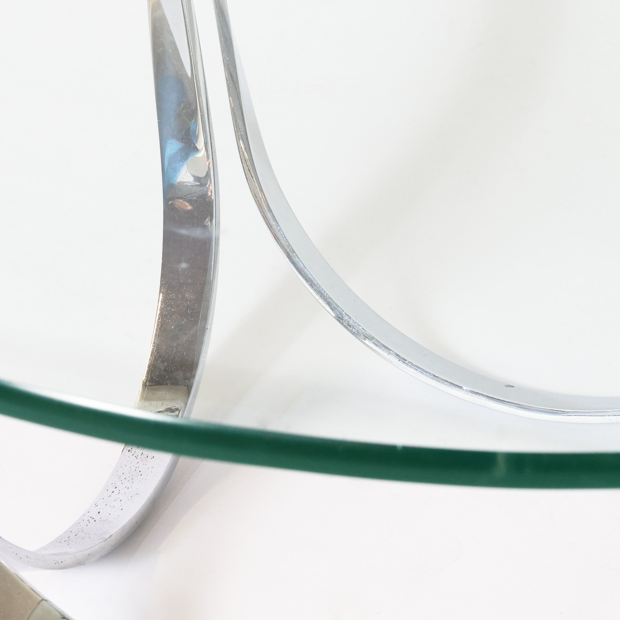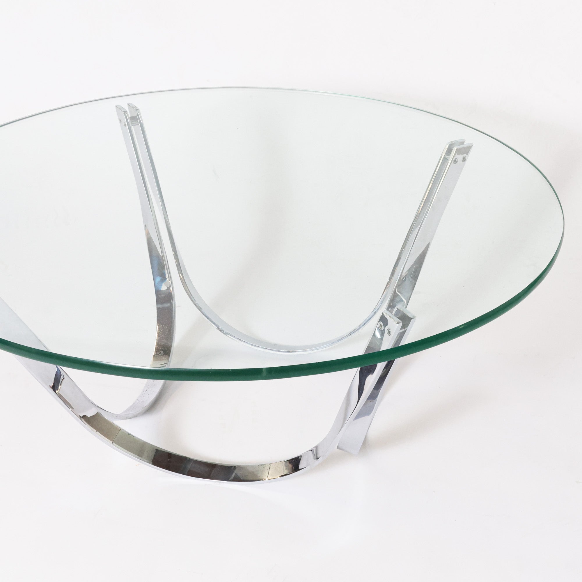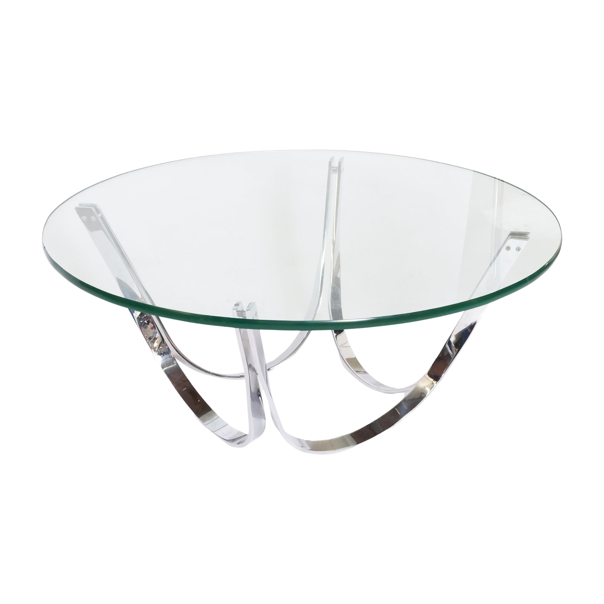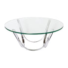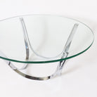 Sculptural and stunning, this vintage coffee table features chrome-plated steel polished to a mirror finish and a thick-cut round glass top. Designed by Roger Sprunger for Dunbar, circa 70s.