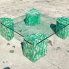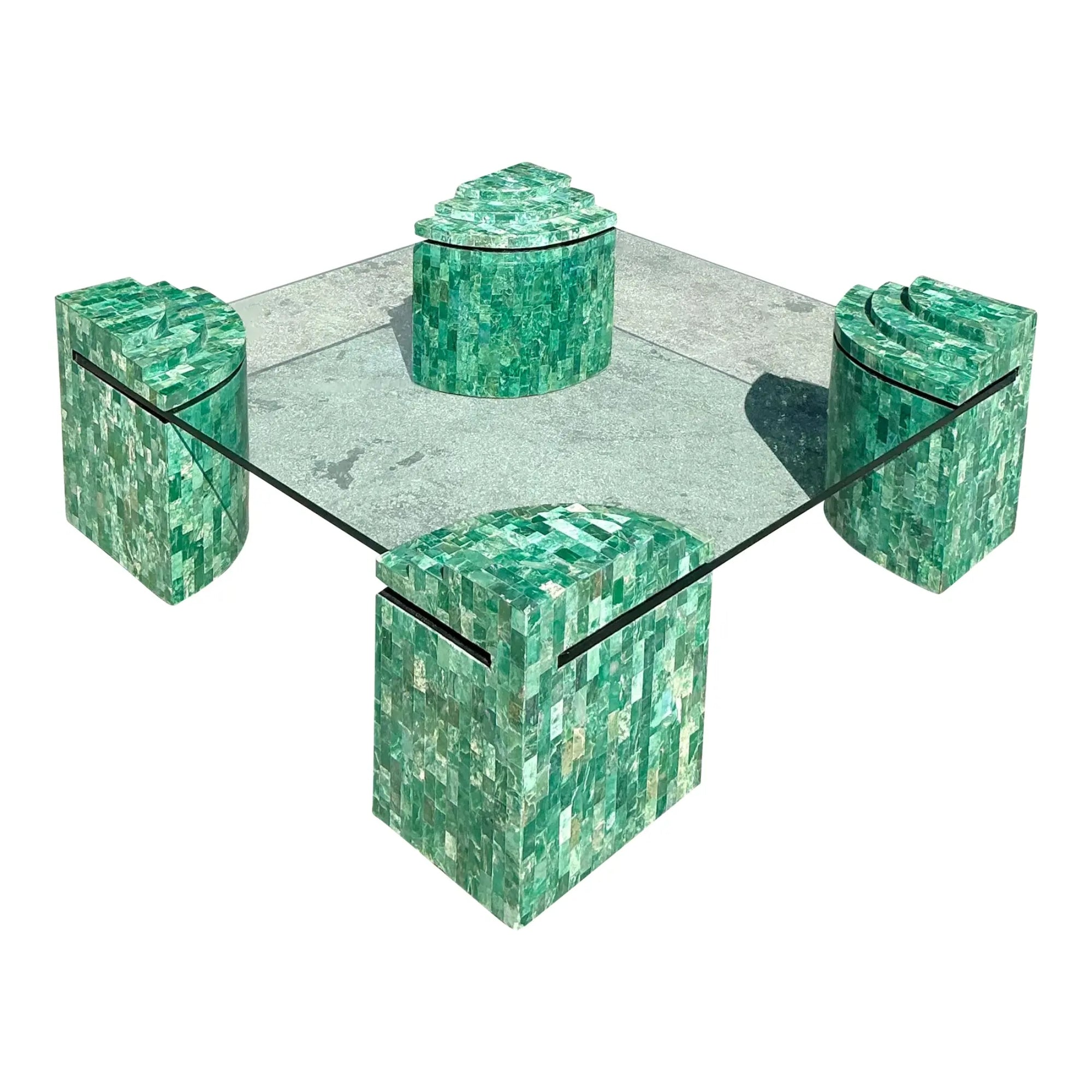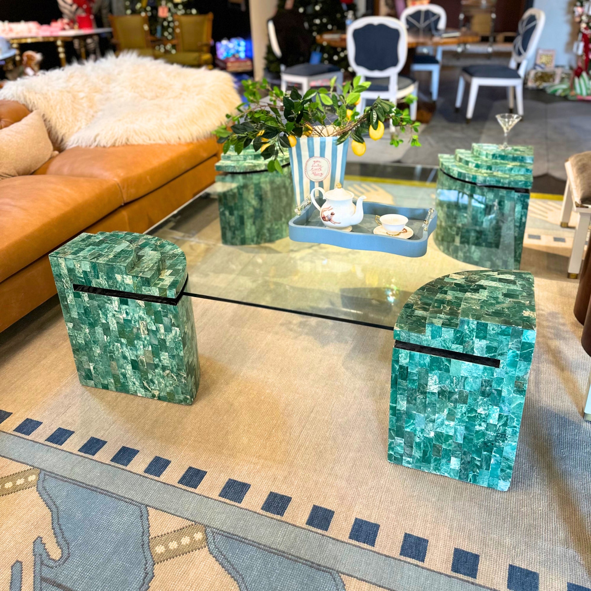 Elevate your living space with this breathtaking vintage Maitland Smith tessellated stone coffee table, a masterpiece of artistry and design. This striking table features four sculptural green stone bases adorned with a tessellated pattern, creating a stunning visual effect that captures the essence of timeless luxury. A thick, beveled glass top rests elegantly on the bases, giving the piece an airy, sophisticated presence.