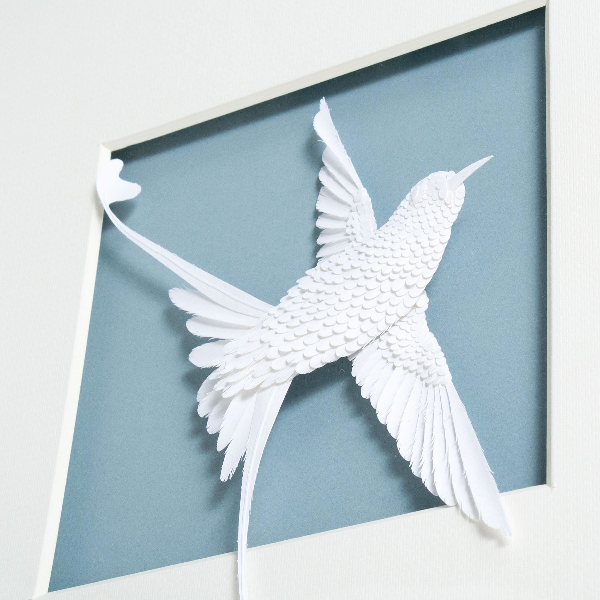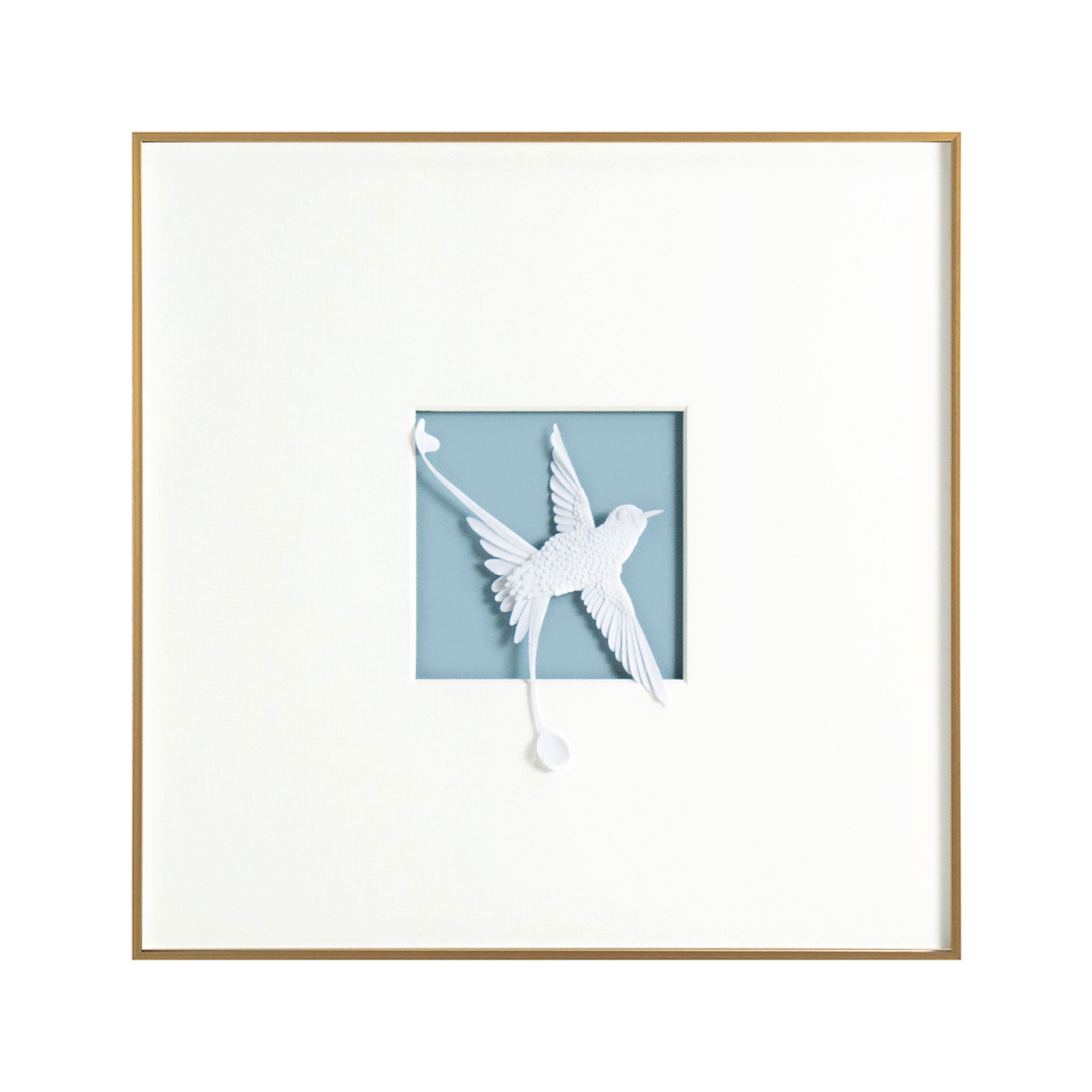 Our exclusive Aviary Series is sure to make your space sing. Hand-crafted paper birds fly on a blue background. A cream matte and gold frame adds the finishing touch.