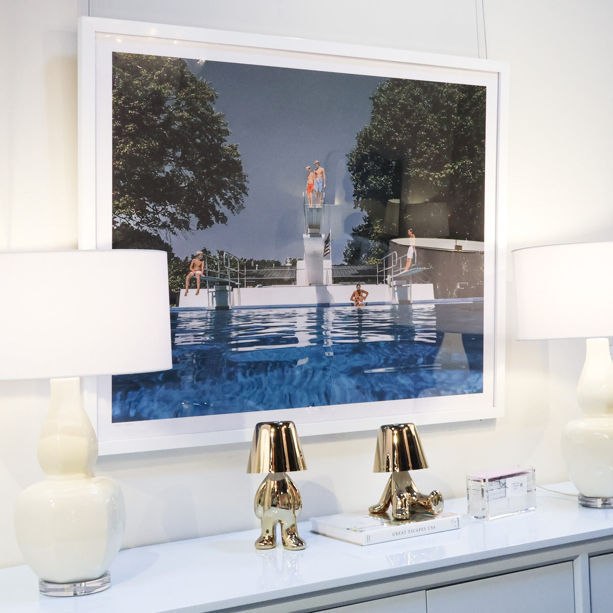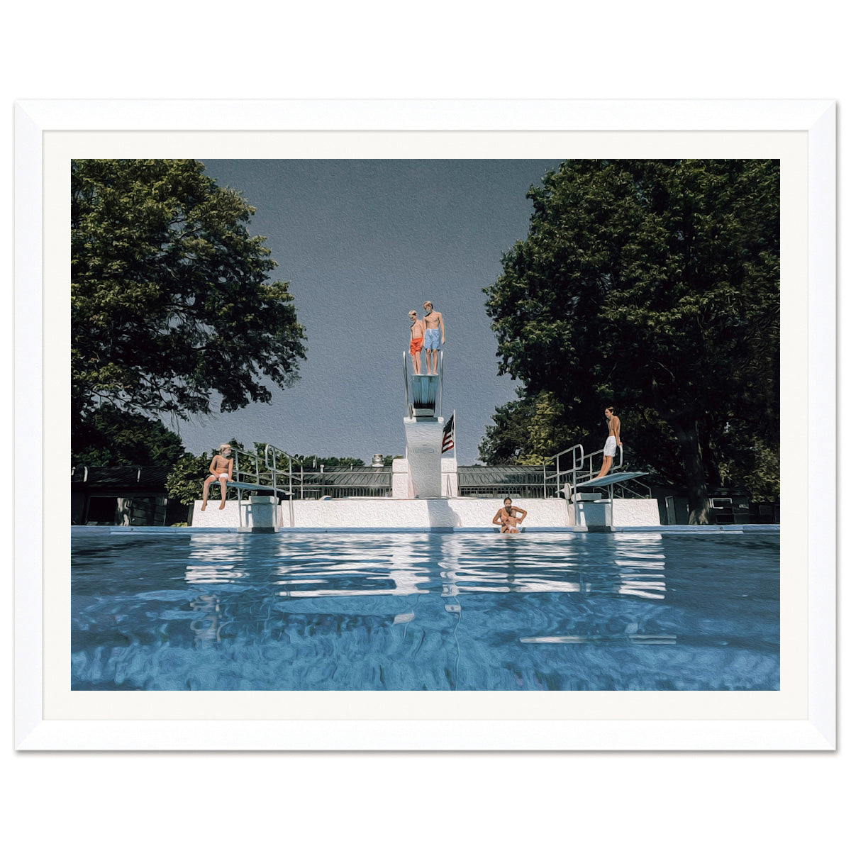 Photography print by Jessica Roark featuring a poolside scene. Printed on fine archival paper and framed in white.