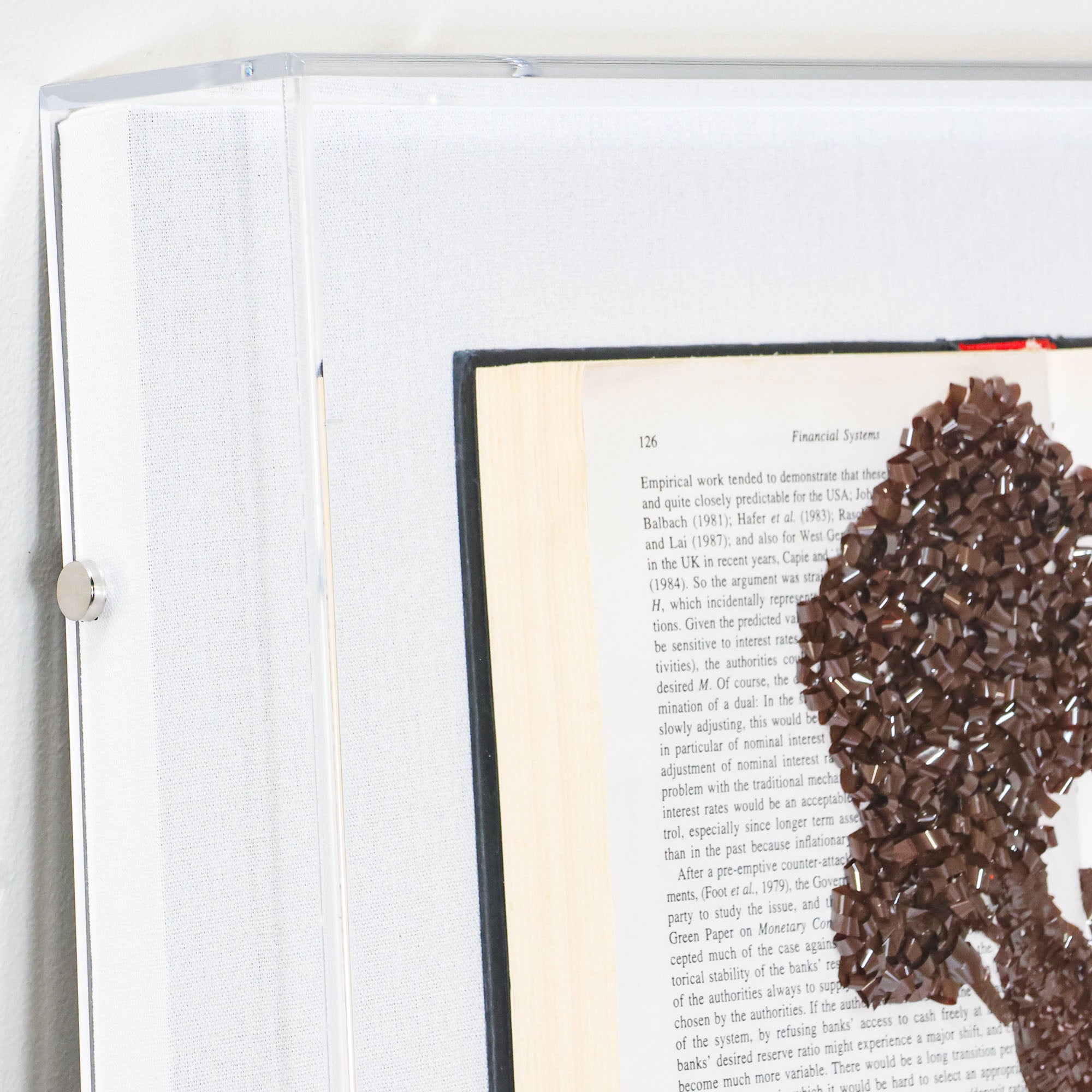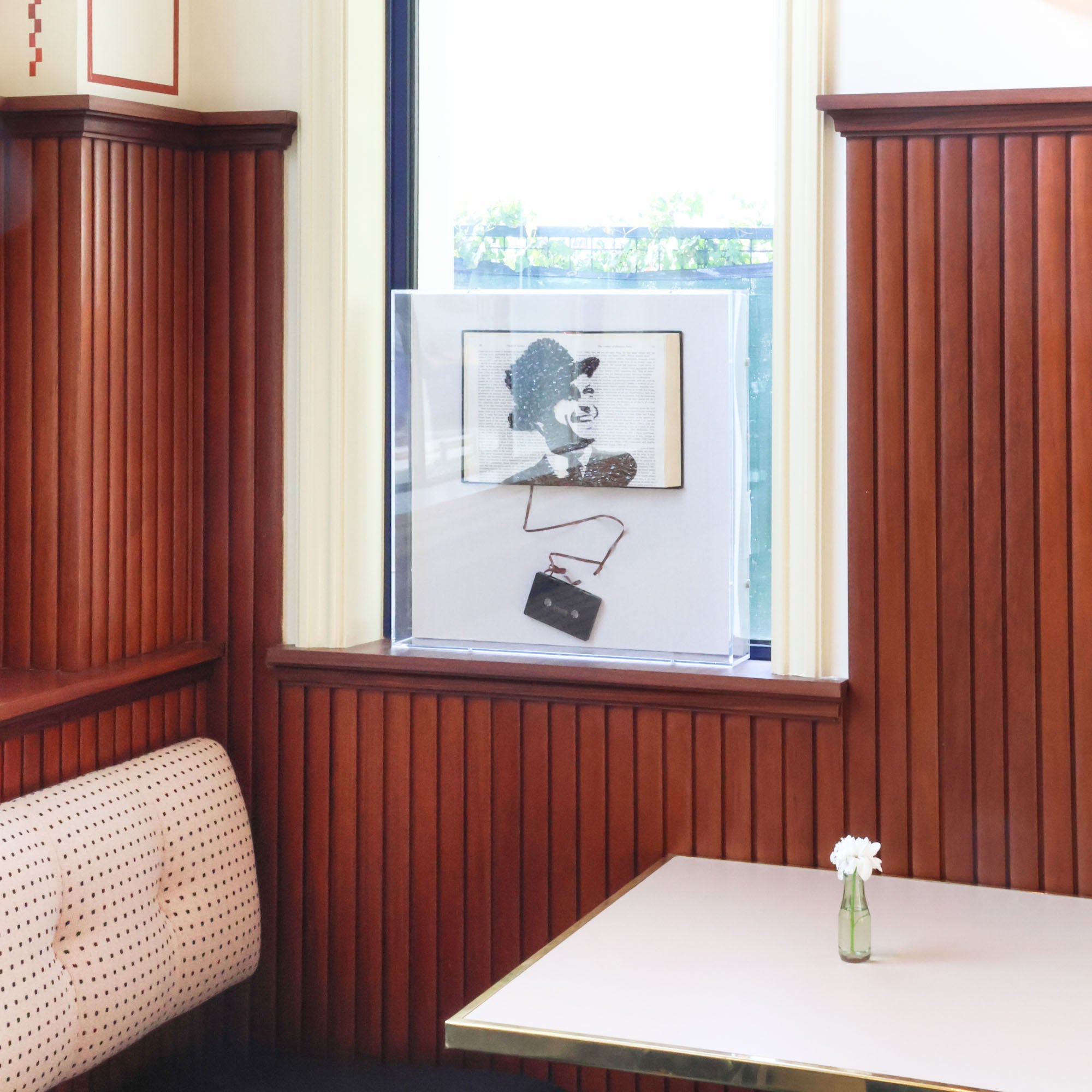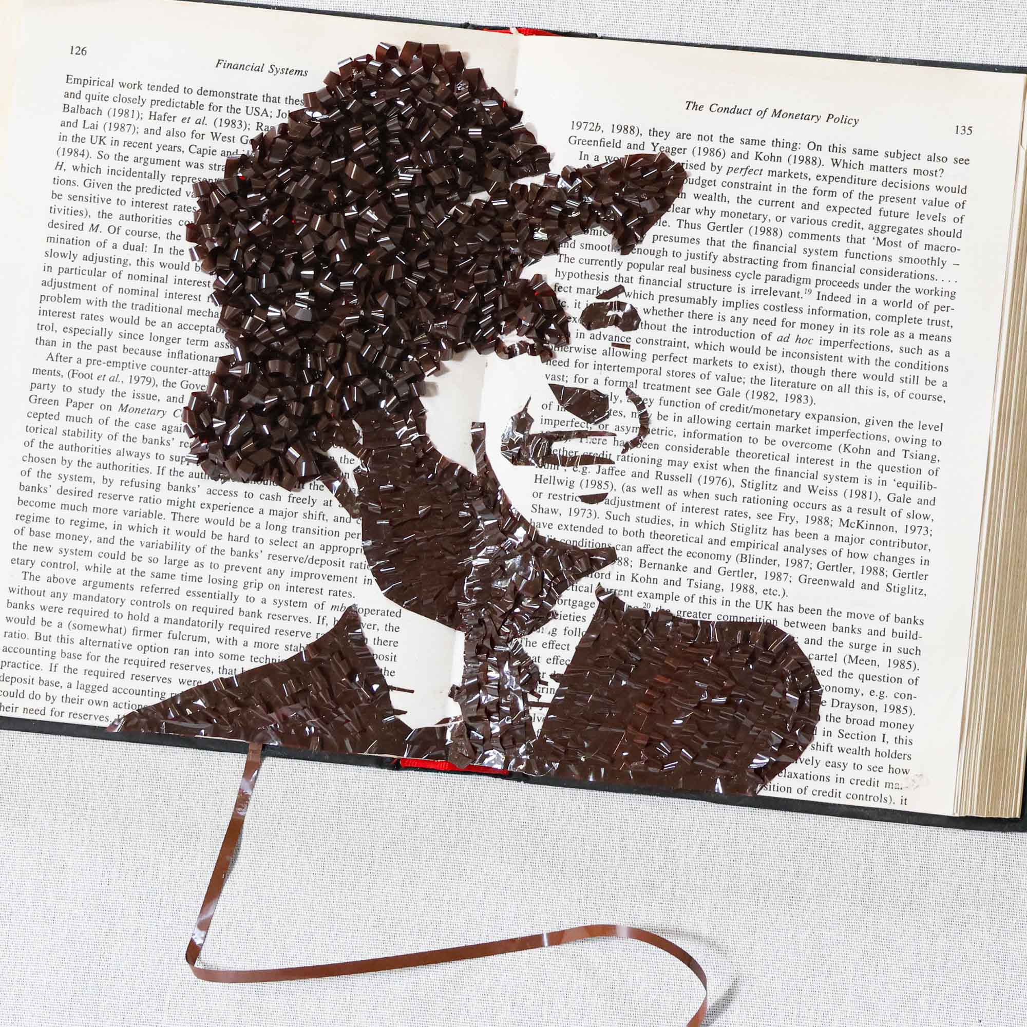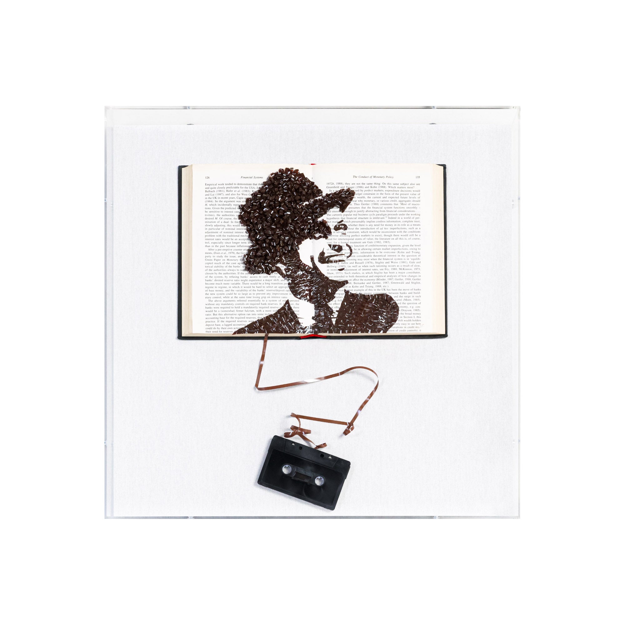 From the Tat Frederick studio, this piece showcases an open book with a portrait of Frank Sinatra composed of cassette tape film.