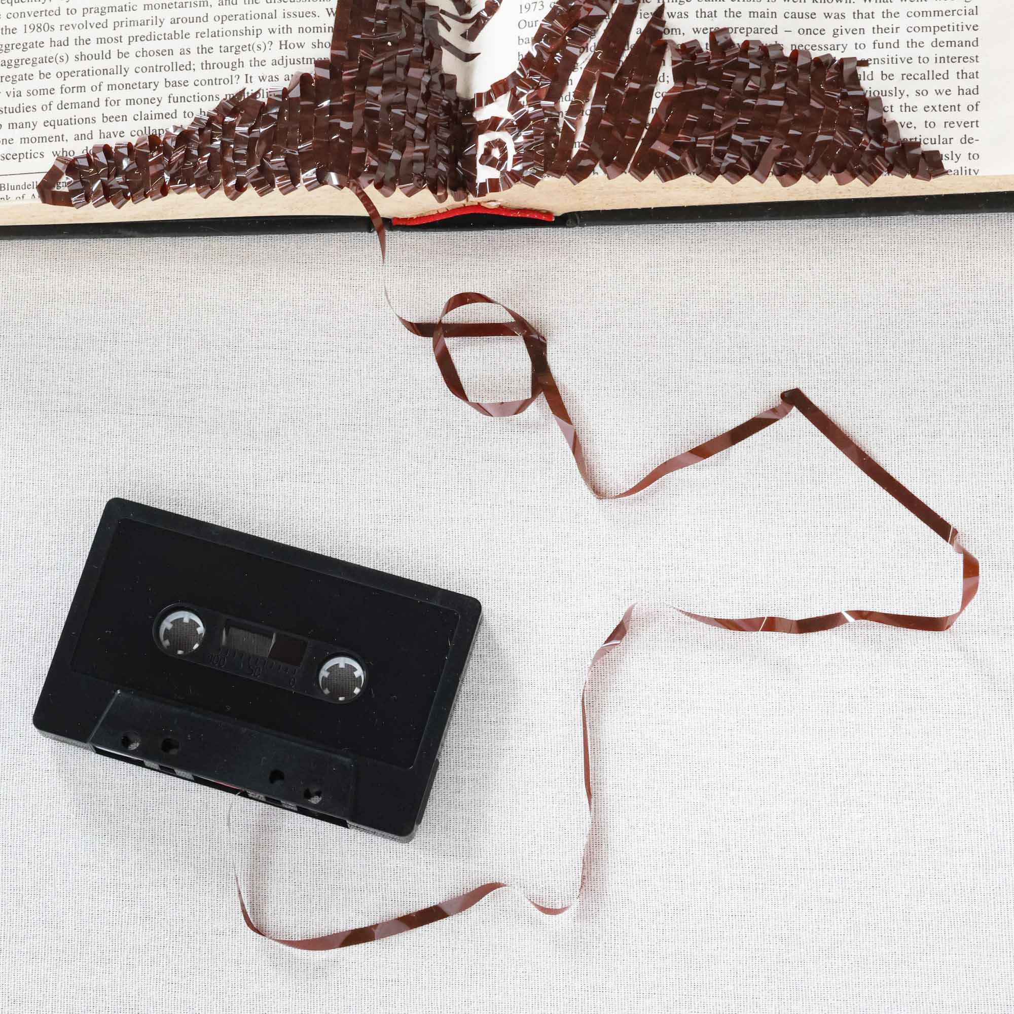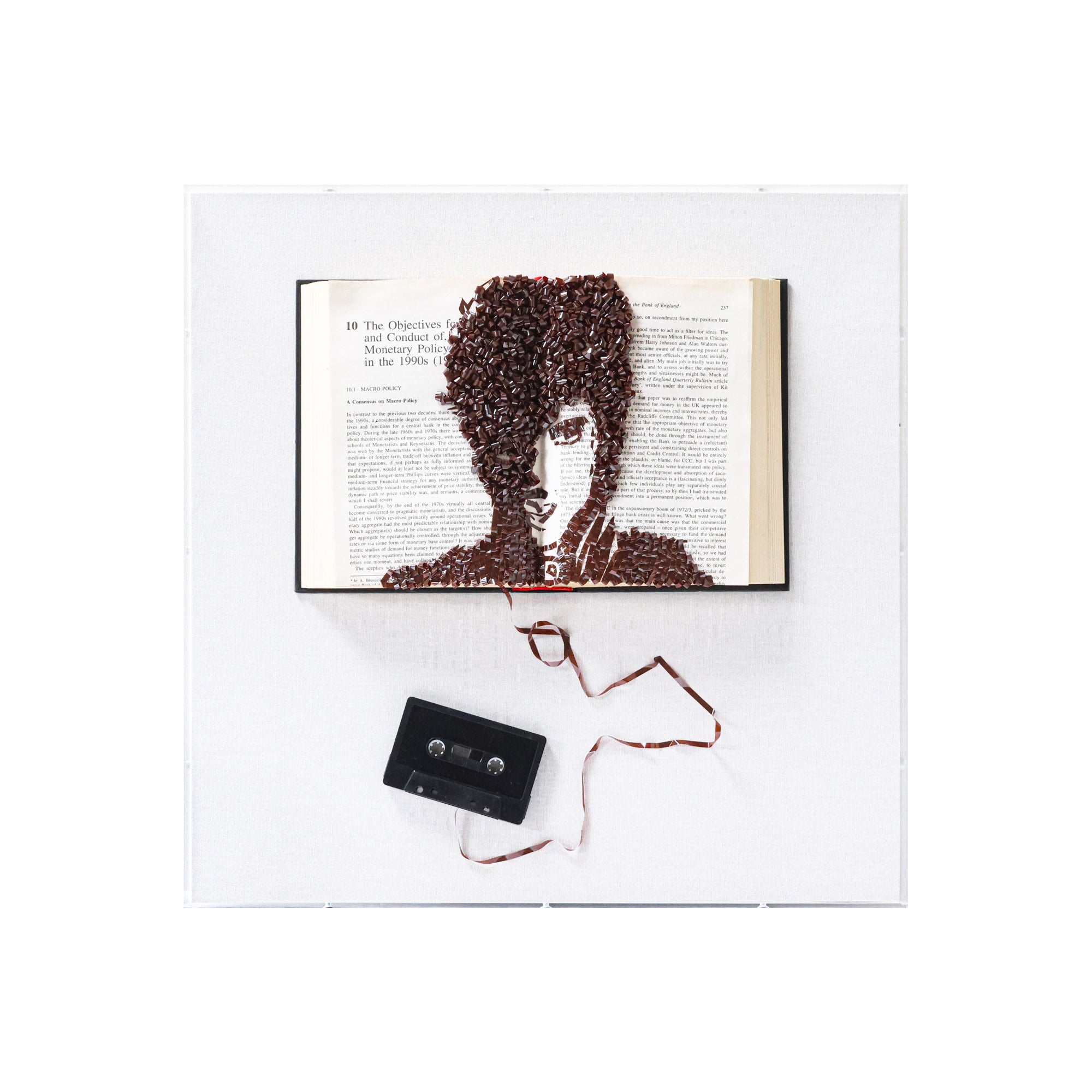 From the Tat Frederick studio, this piece showcases an open book with a portrait of Prince composed of cassette tape film.