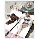 Women and her chimp best friend hanging out on the beach. Arrives professionally framed in white.