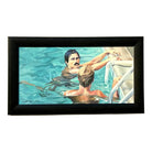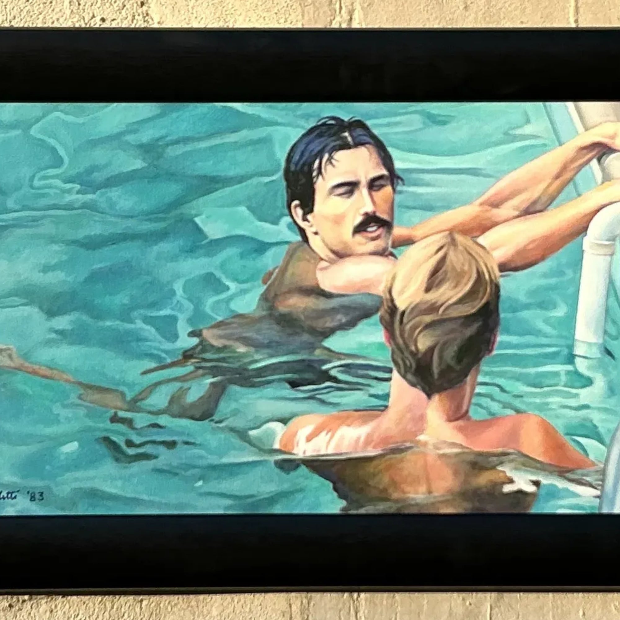 This original painting features two pool dipped hunks. A turquoise dream. Signed and dated 1983, framed in black.