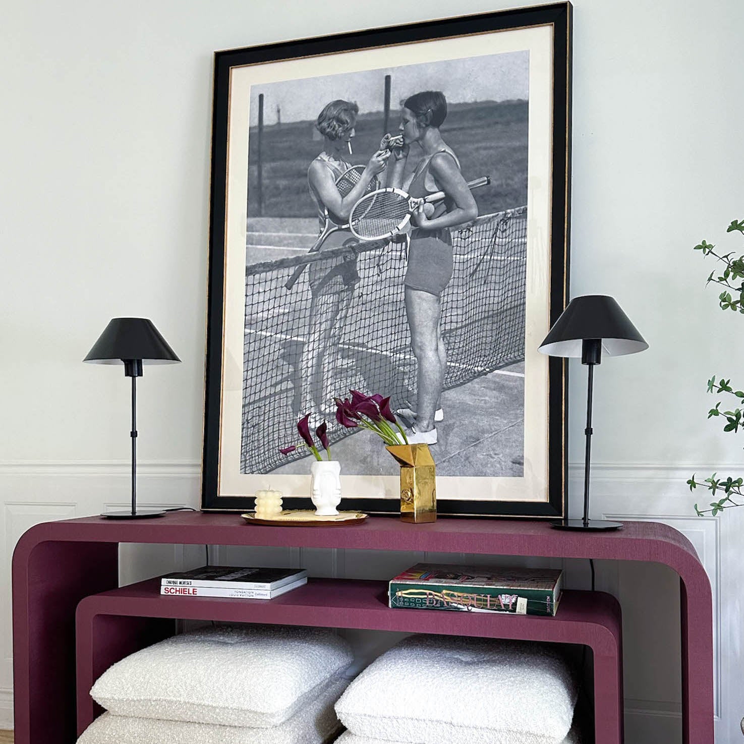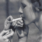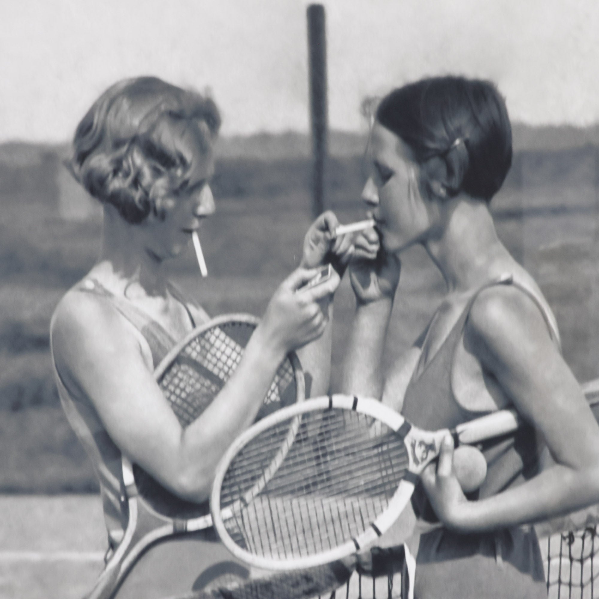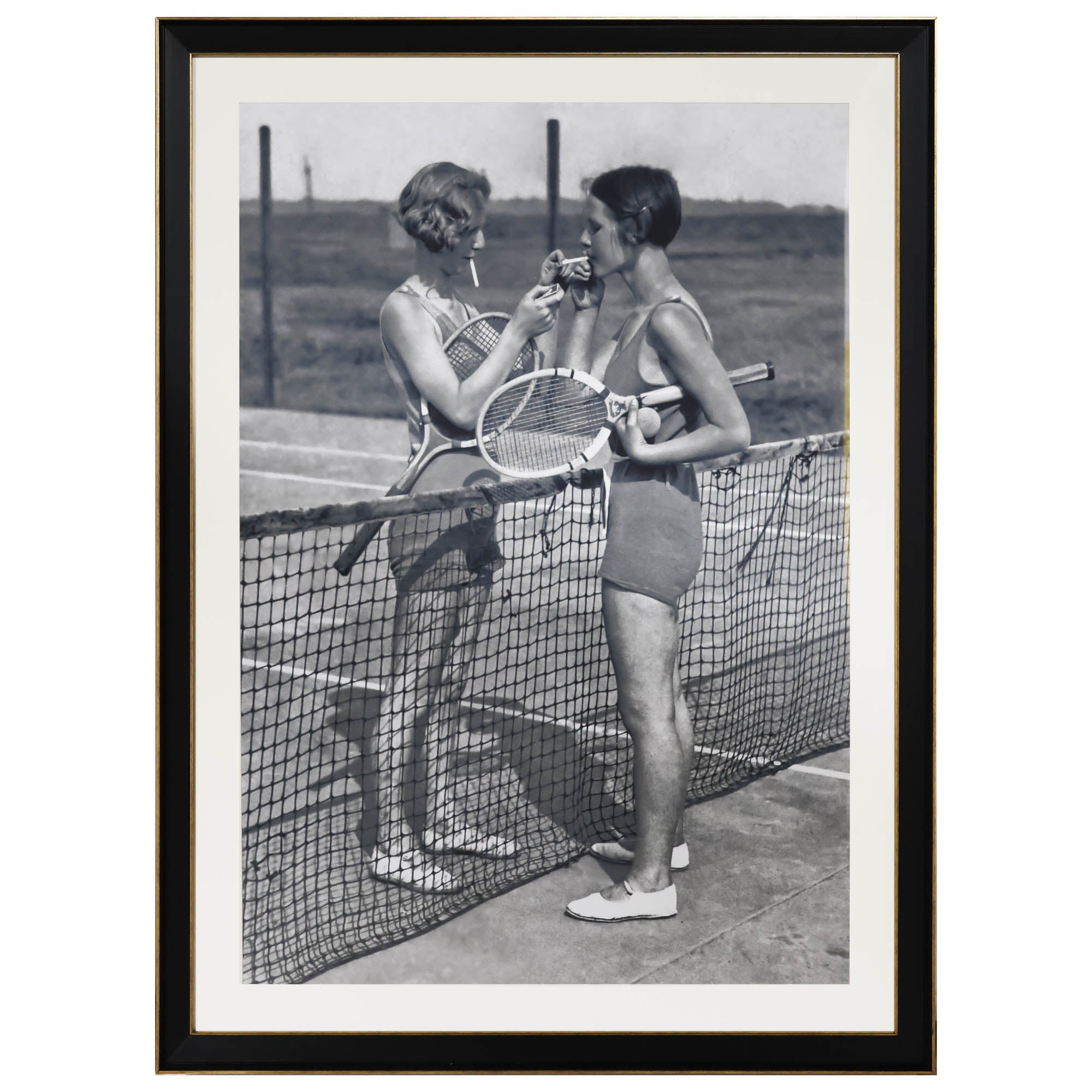 Vintage photograph of two tennis players meeting at the net for a cigarette light. We couldn't love it more. Printed on archival paper with an ivory matte and black frame with gold detailing.