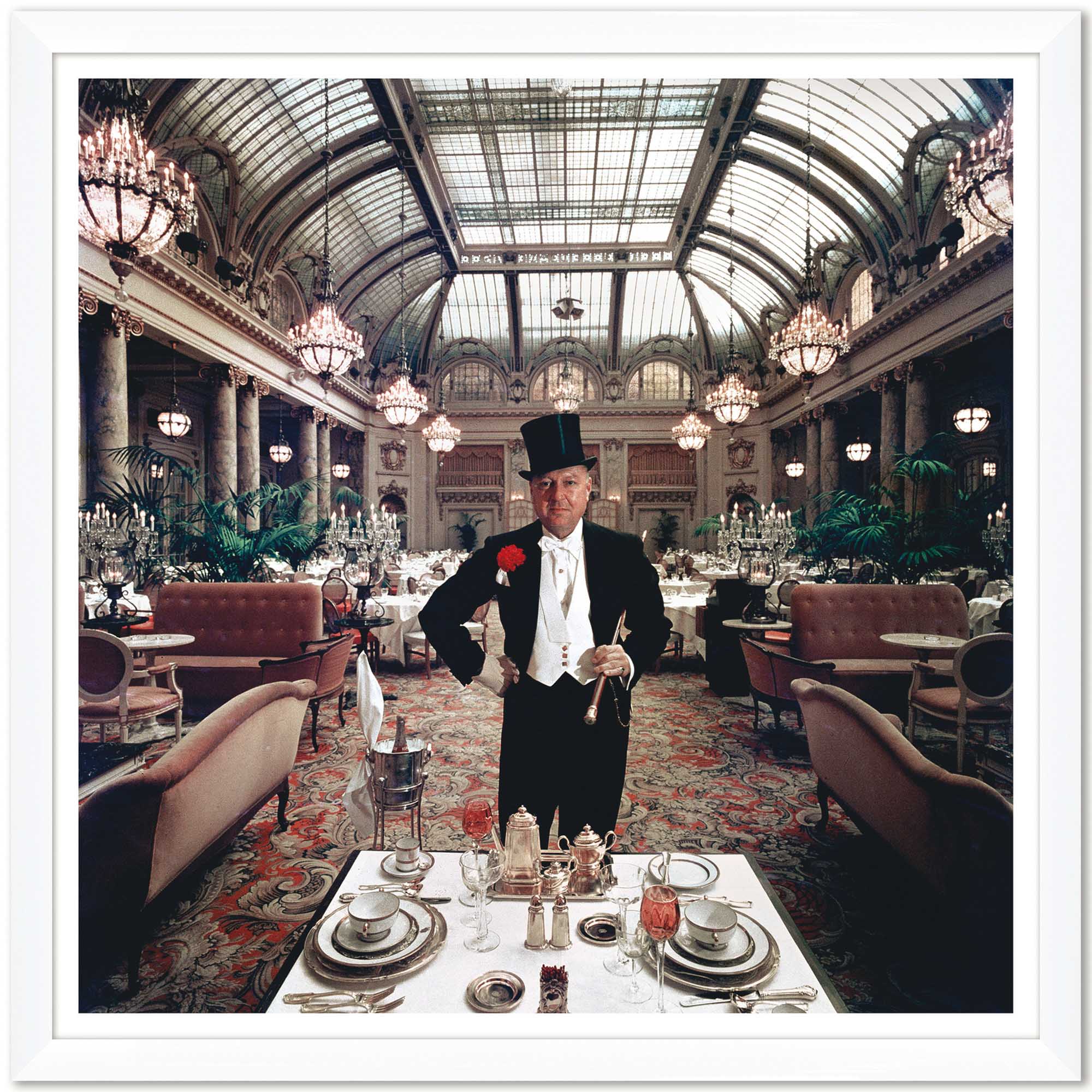Slim Aarons photography of journalist Lucius Beebe beside a gold place setting in the glass roofed Garden Court of the Palace Hotel, San Francisco. Fun fact: his walking stick once belonged to a Wells Fargo stage driver.