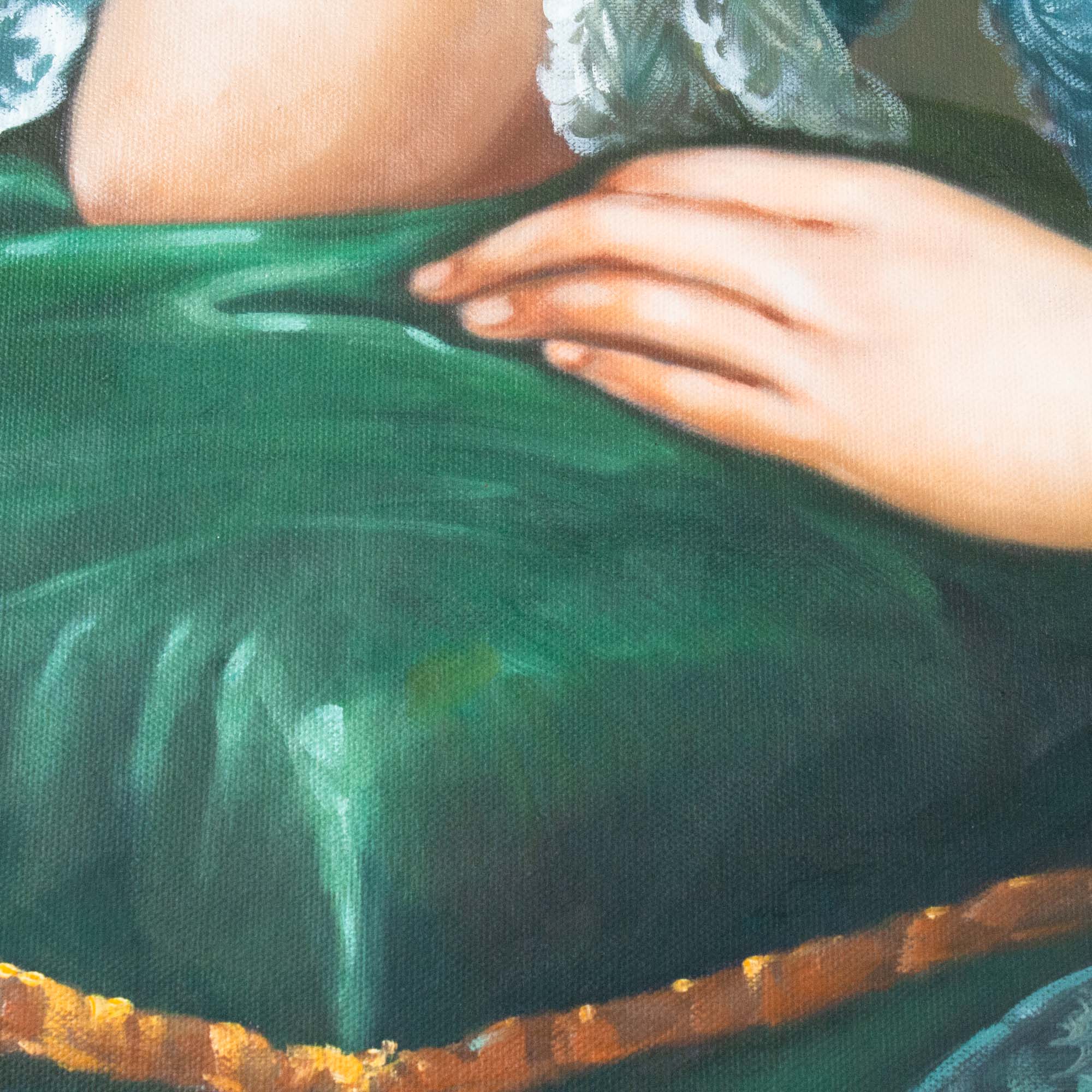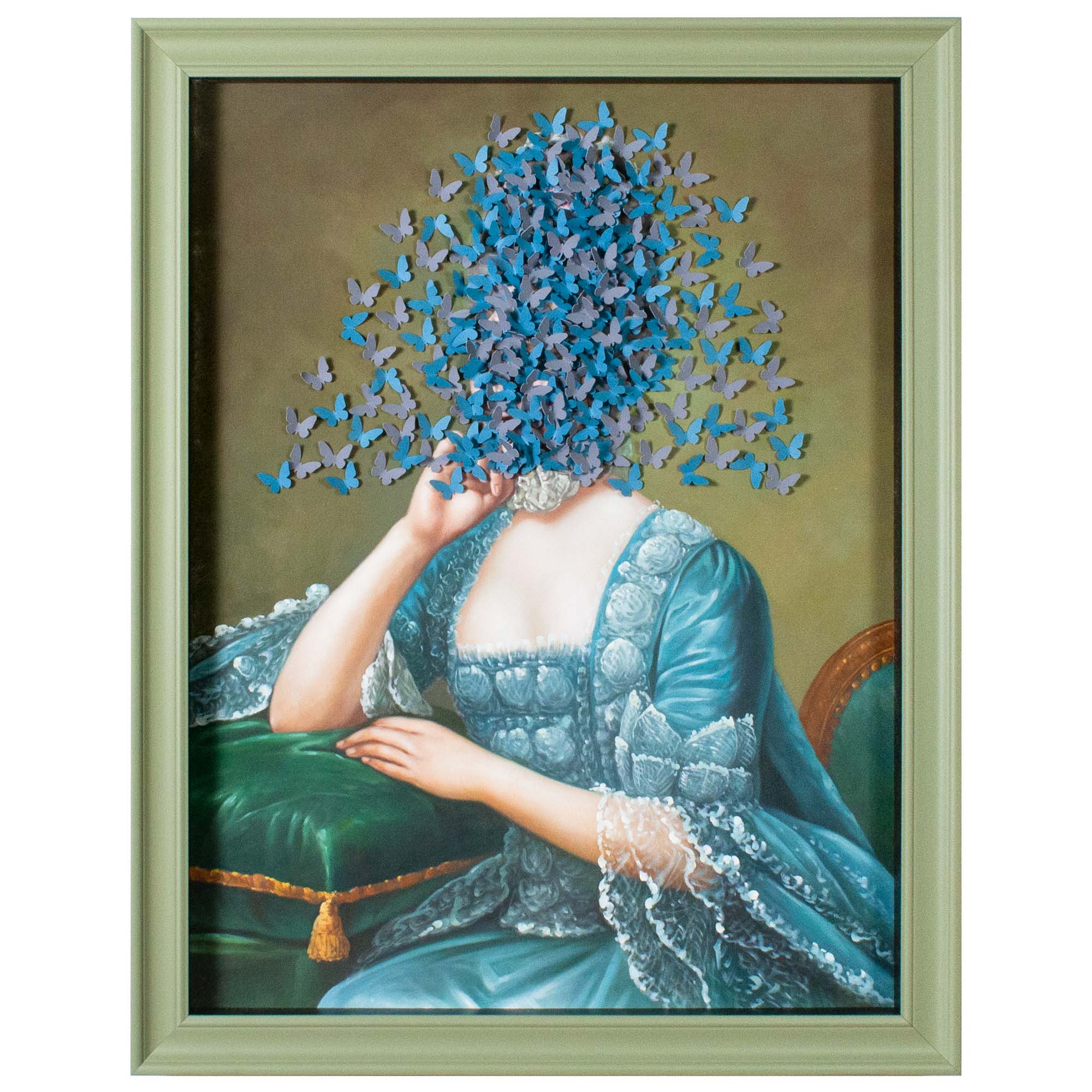 A modern-day blend of chiaroscuro and mixed media, Lady Ella is printed on canvas with a swarm of blue and purple butterflies in her hair.