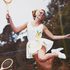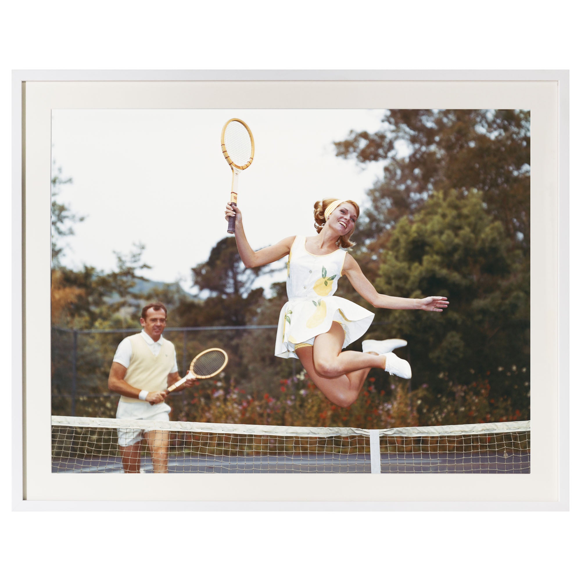 This vintage Tom Kelley photograph features a woman jumping gleefully on the court. We couldn't love it more. Printed on archival paper with an ivory matte and white frame, this piece will brighten any space.