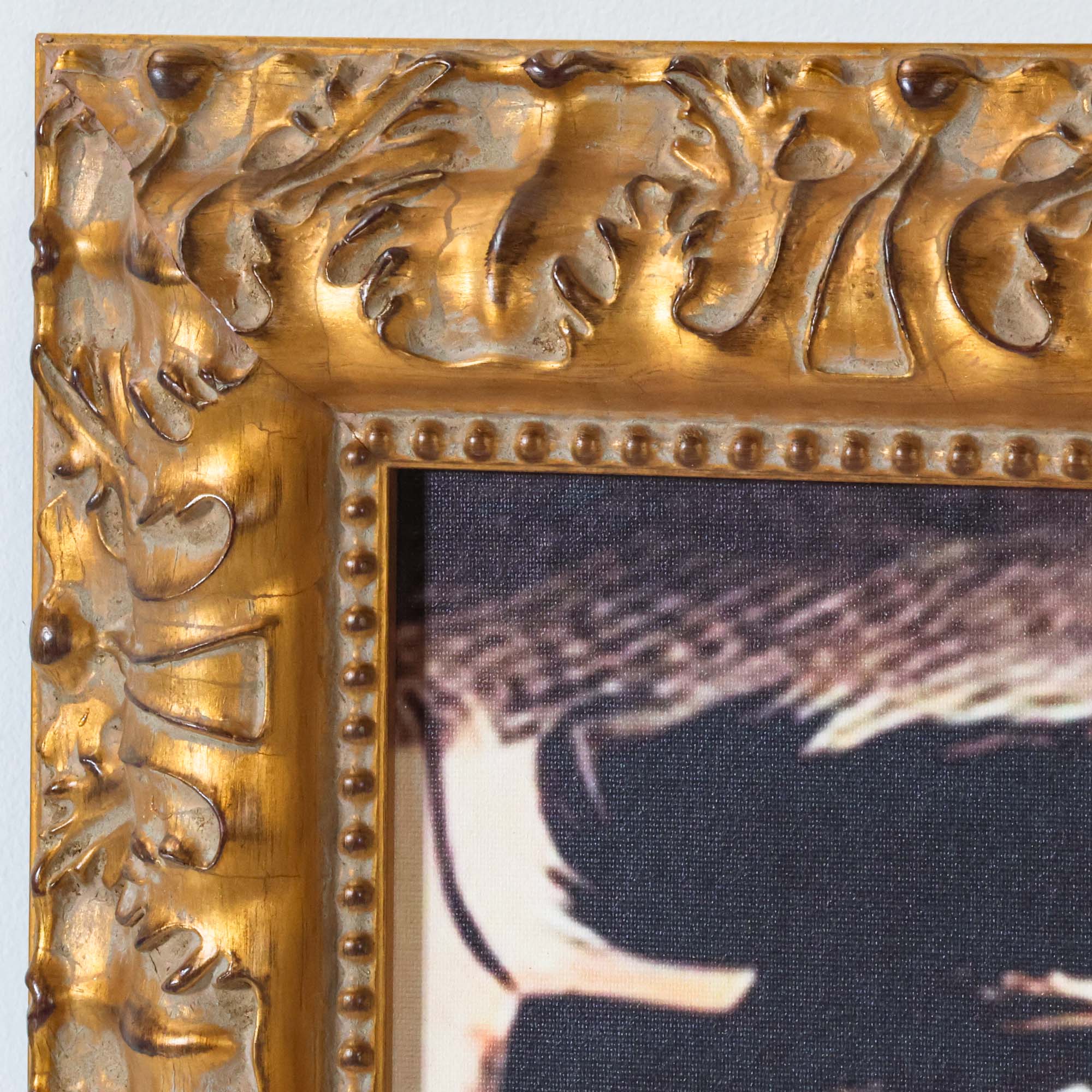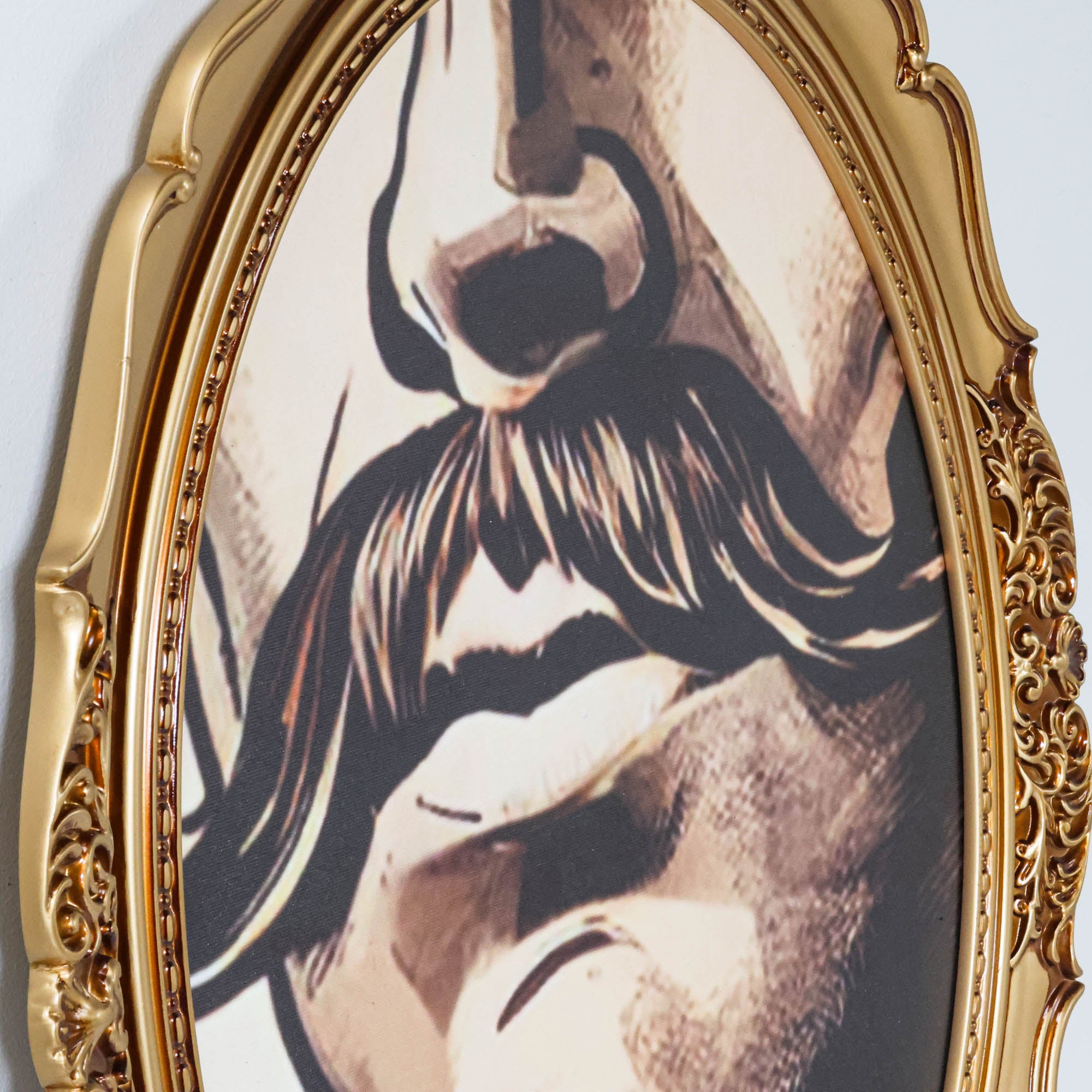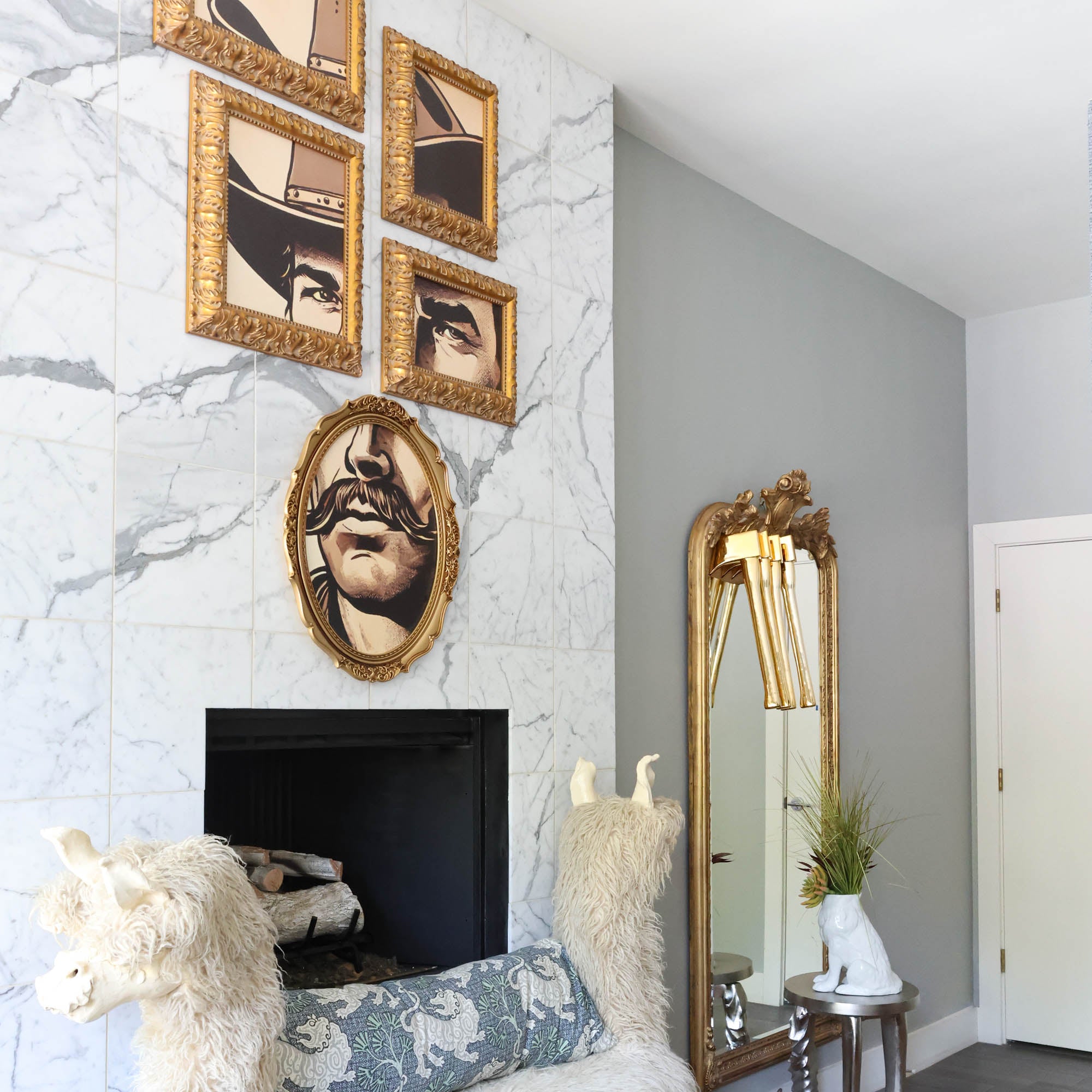 From the Tat Frederick studio, Otis depicts a portrait of a cowboy that is comprised of 5 gold-framed prints of various shapes and sizes.