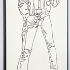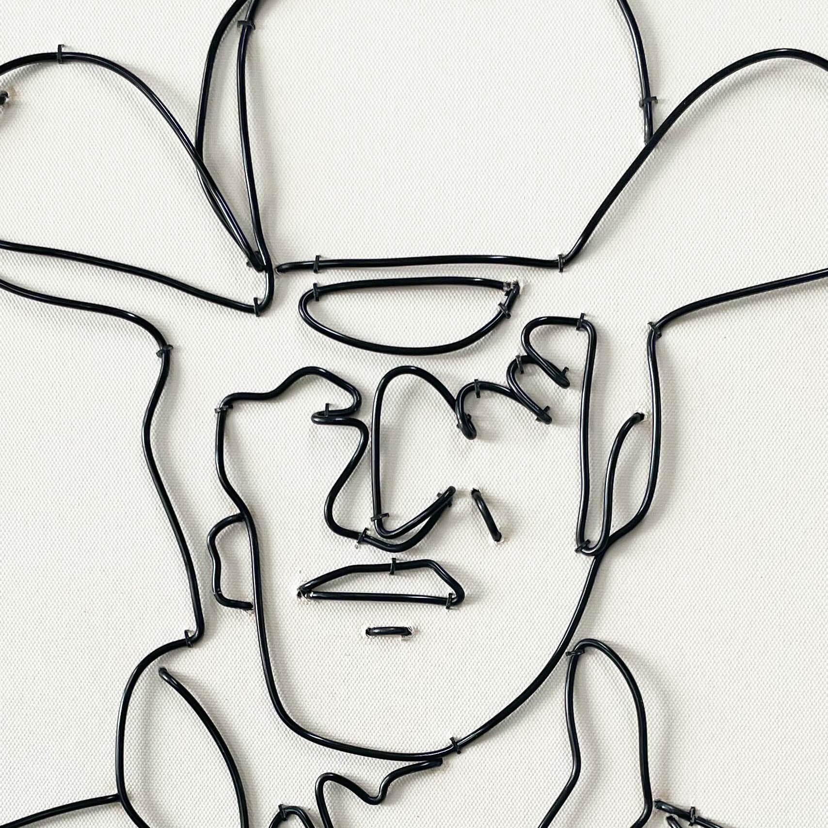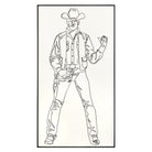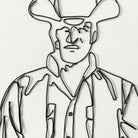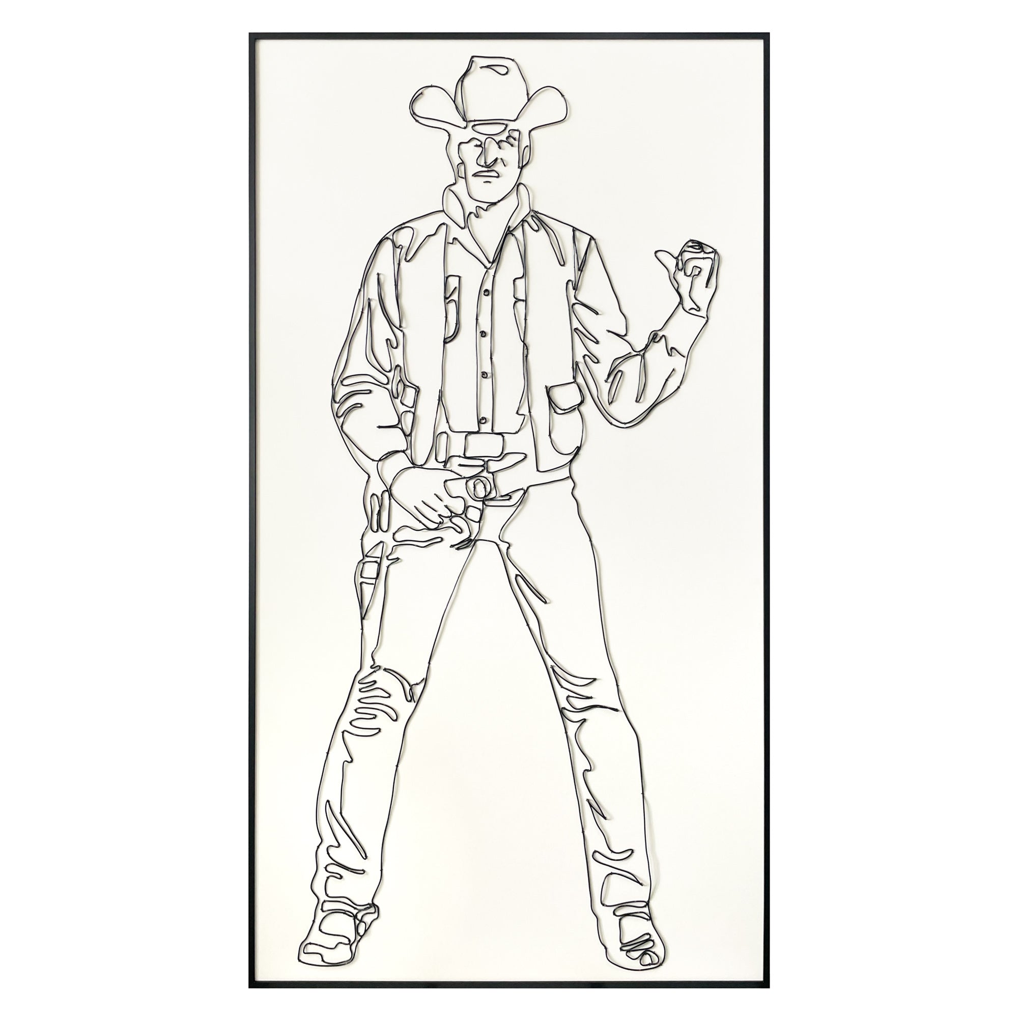 Mixed media artwork by Tat Frederick featuring a cowboy. This wire portrait is pinned to drawing paper and framed in black with an ivory white matte.