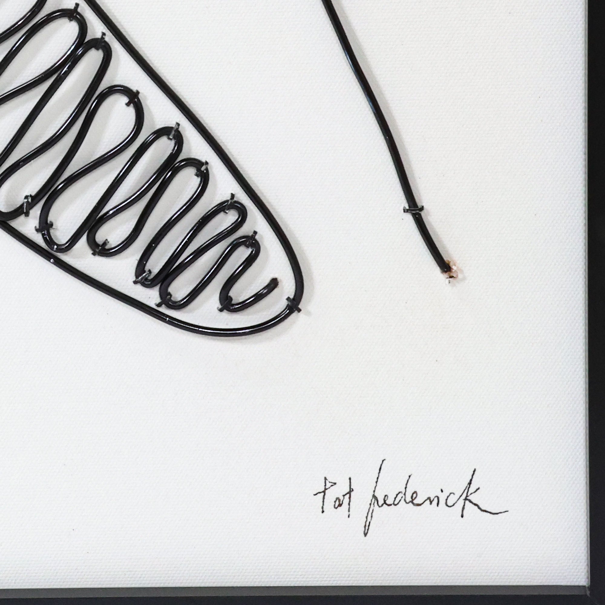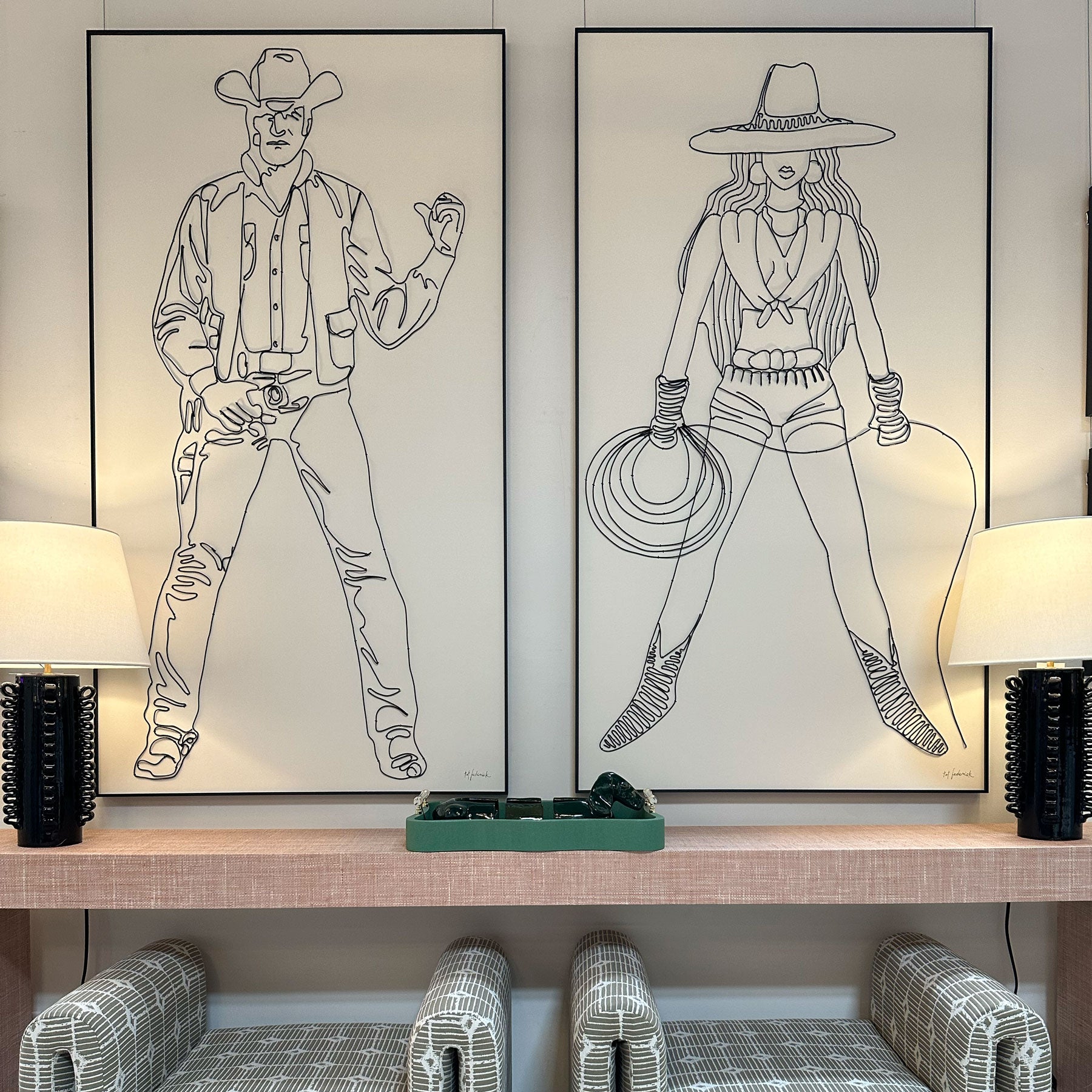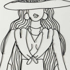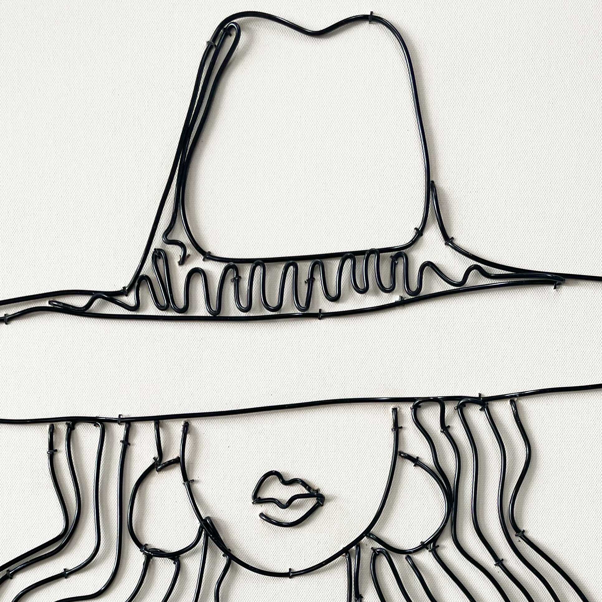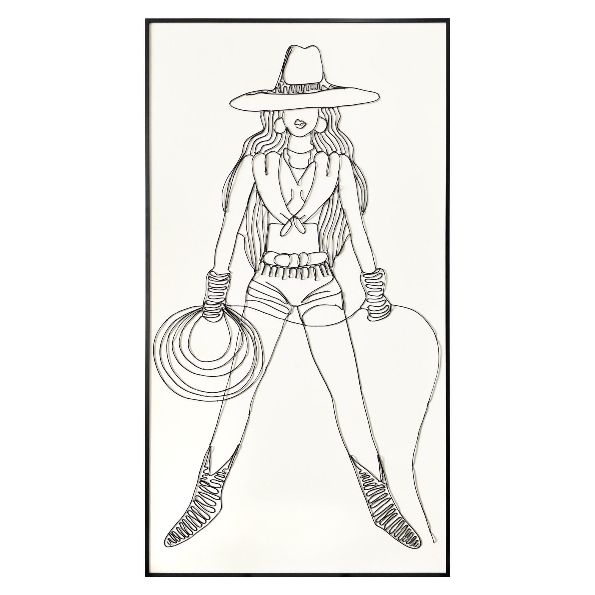 Mixed media artwork by Tat Frederick featuring a cowgirl and her lasso. This wire portrait is pinned to drawing paper and framed in black with an ivory white matte.