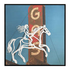 'Spitfire Girl' from the Tat Frederick studio features a yarn portrait of a cowgirl on top of a vintage gas pump photograph. Framed in black.