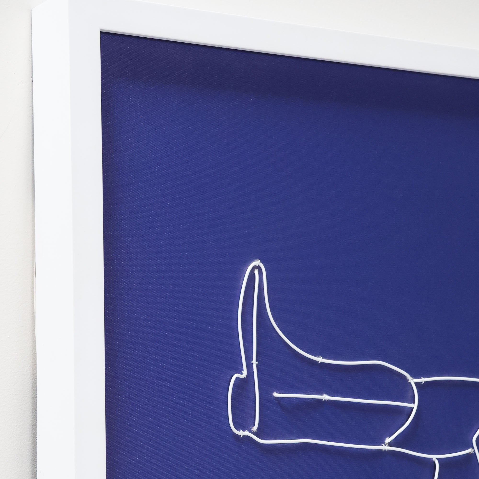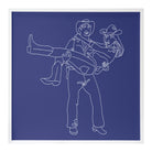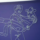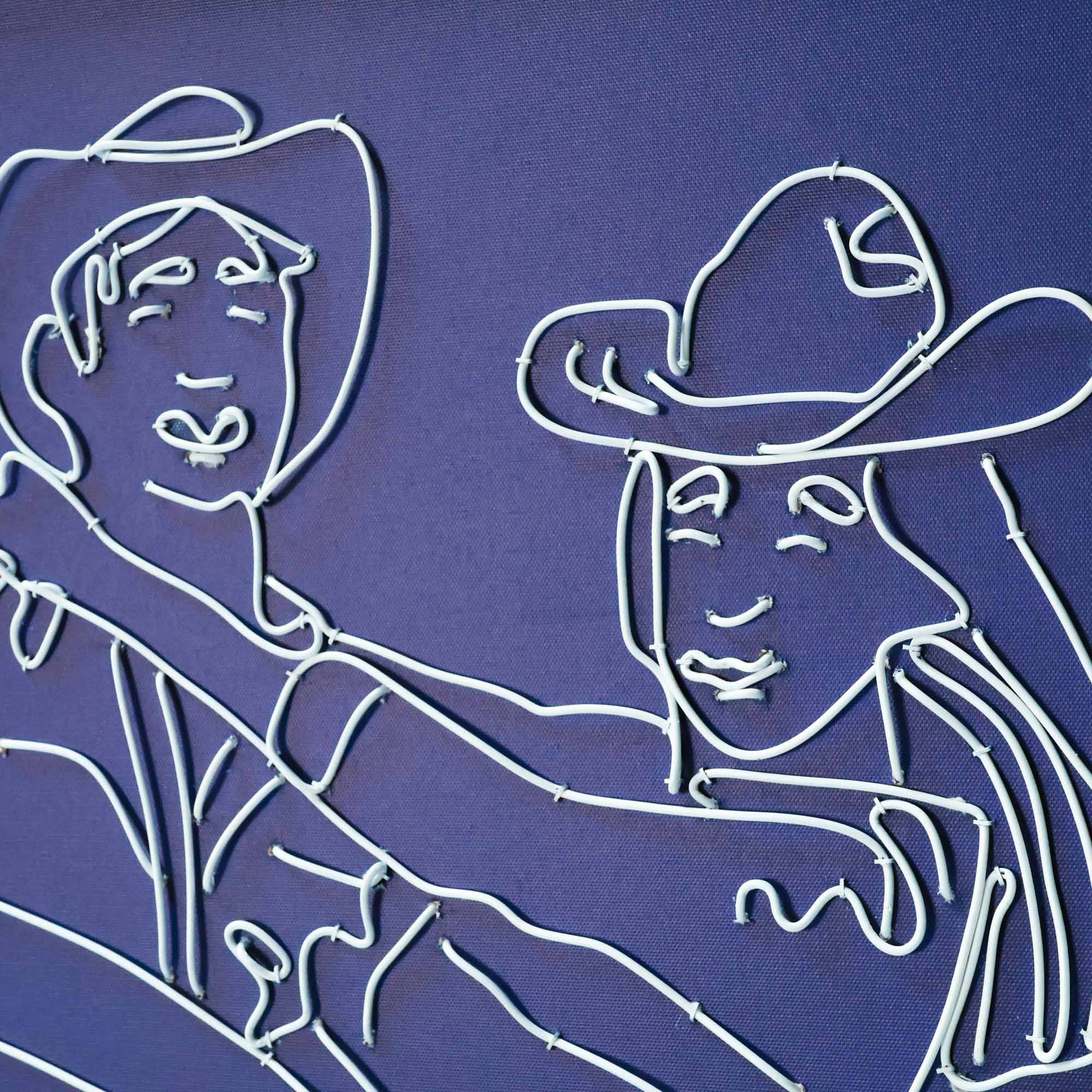 'Stars Go Blue' from the Tat Frederick studio features a wire portrait of a cowgirl in a cowboy's arms. White wire pinned to blue canvas.