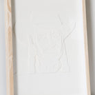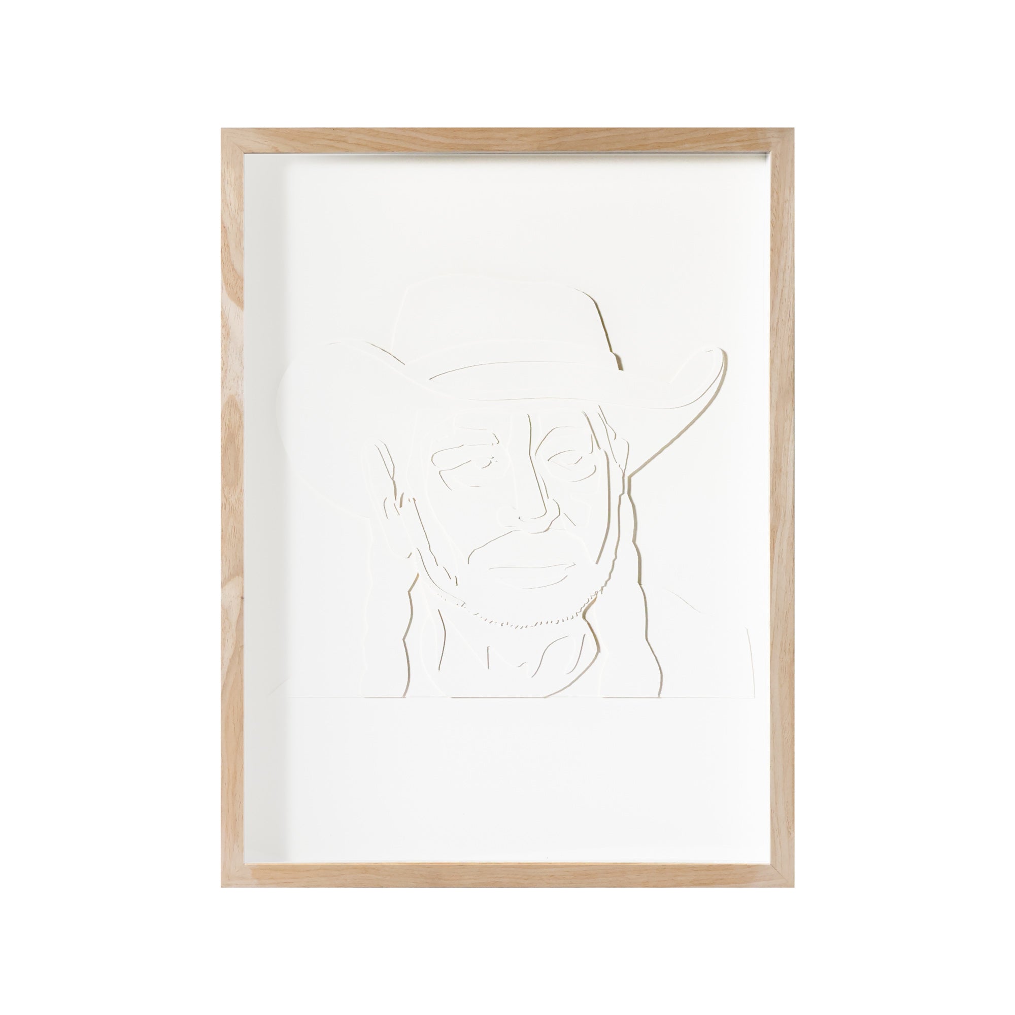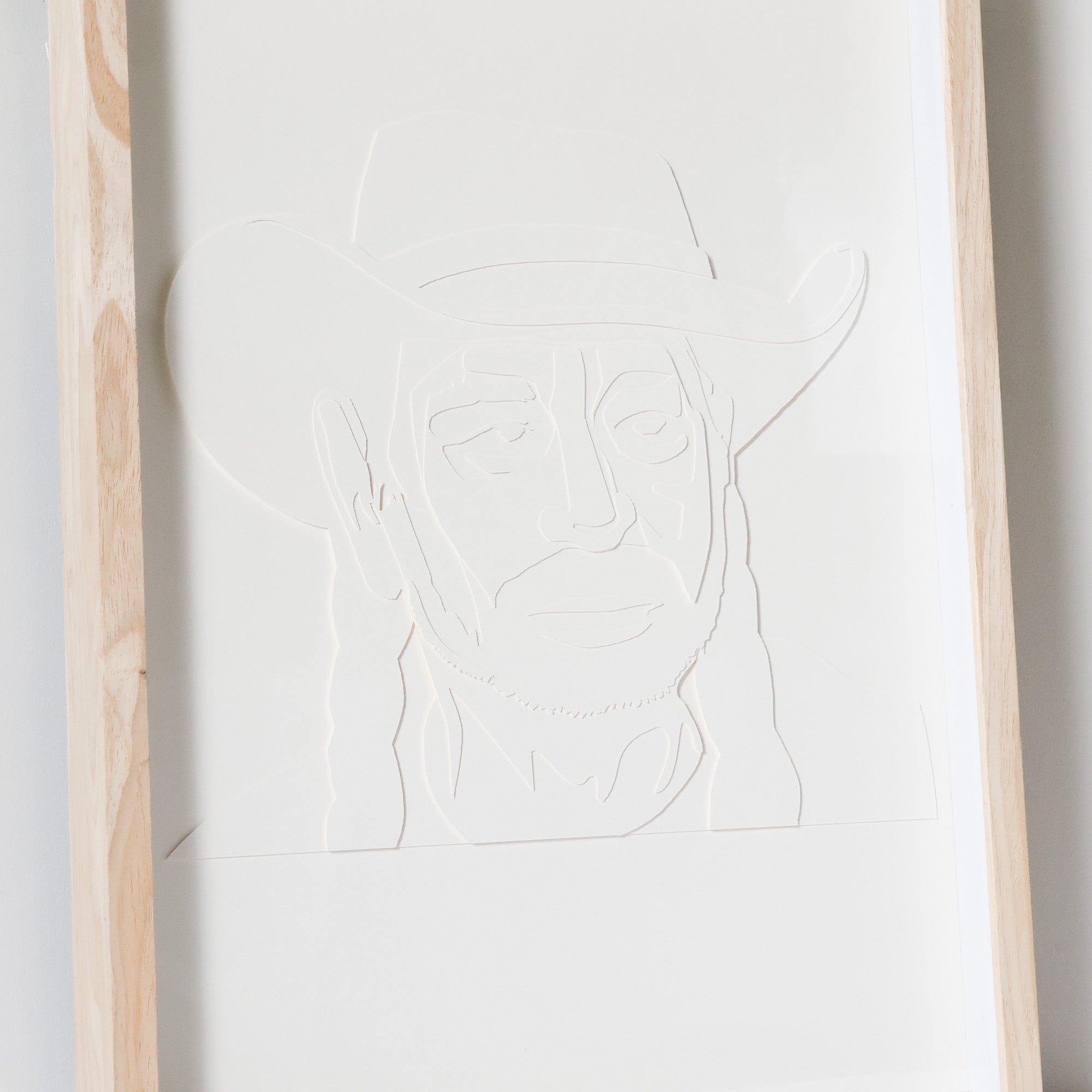 Willie Nelson portrait made of hand cut paper by Tat Frederick. Framed in a blonde wood frame with a plexiglass panel.