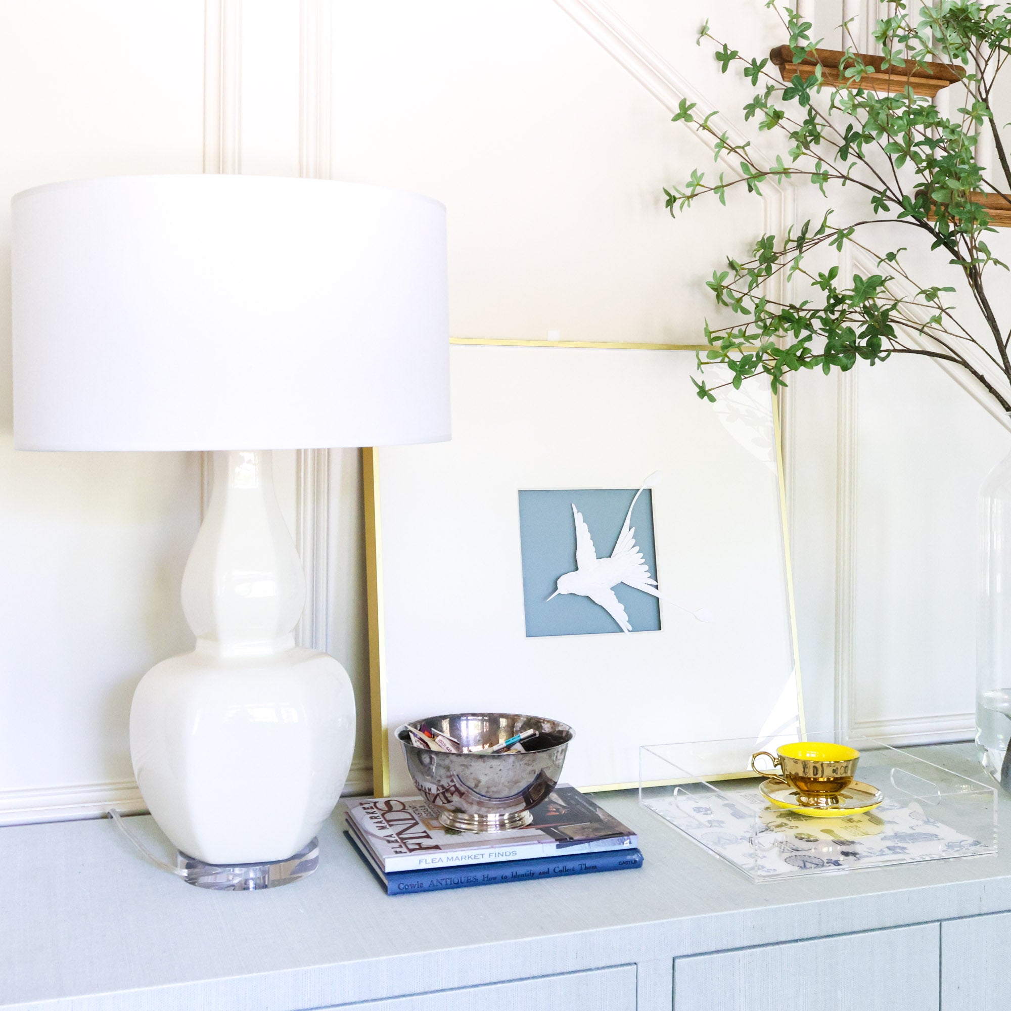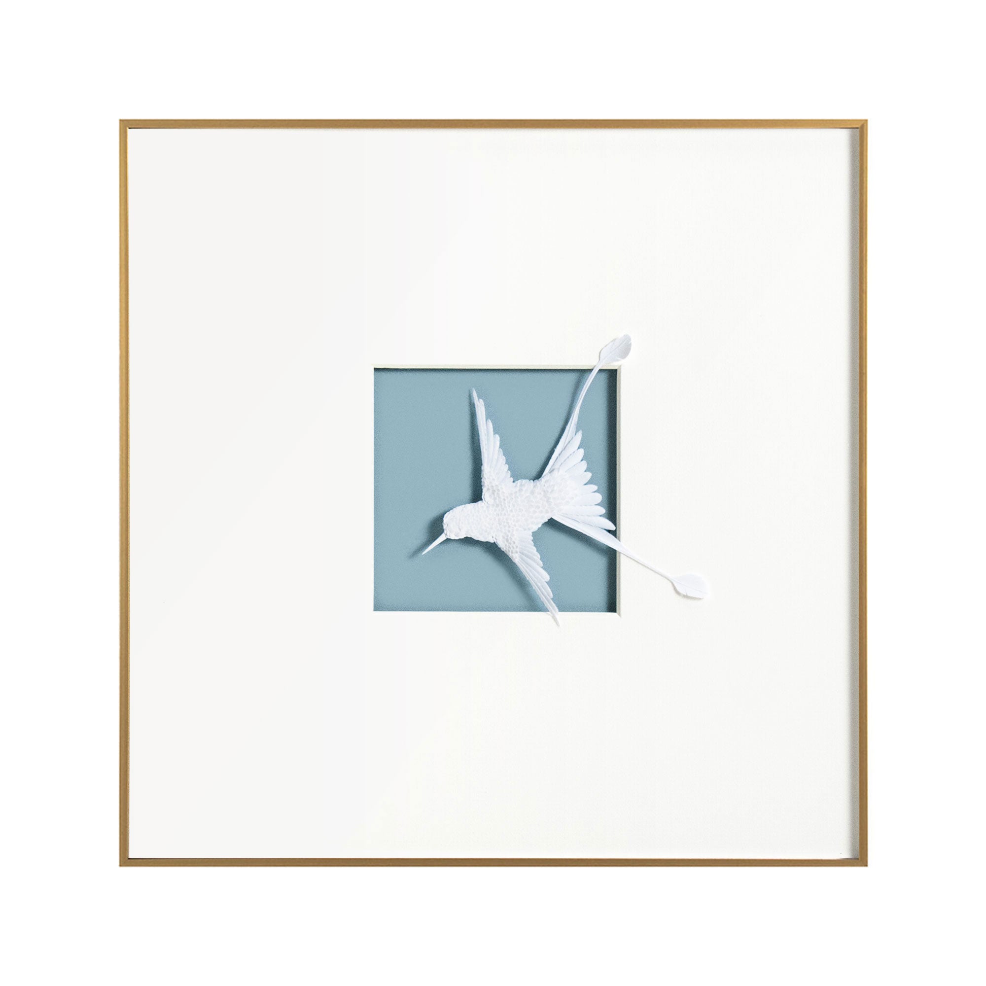Our exclusive Aviary Series is sure to make your space sing. Hand-crafted paper birds fly on a blue background. A cream matte and gold frame adds the finishing touch.