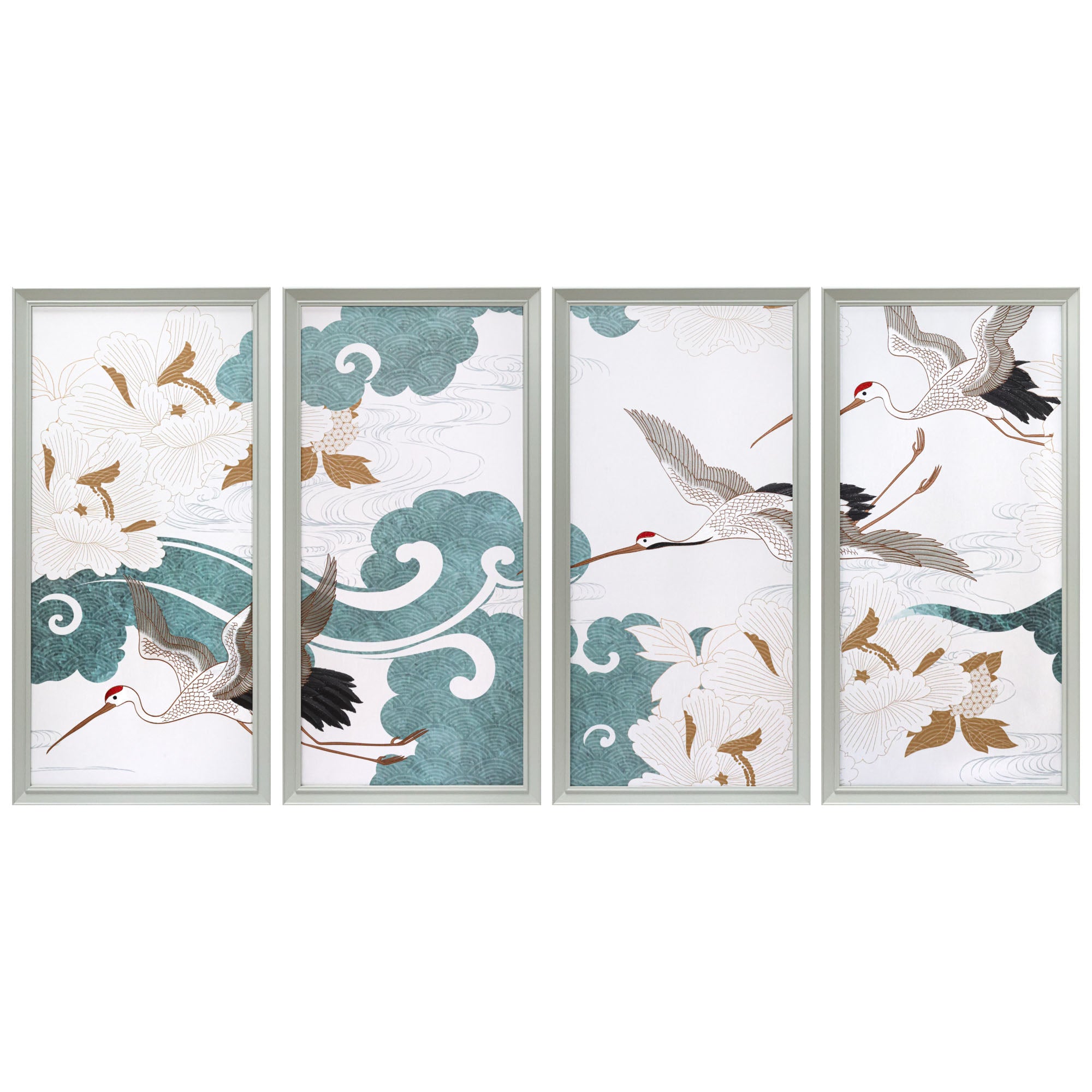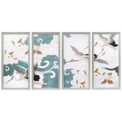 From the Tat Frederick studio, Beaula Polyptych features 4 panels with hand-embroidered silk details that showcase an abstract depiction of birds in flight.