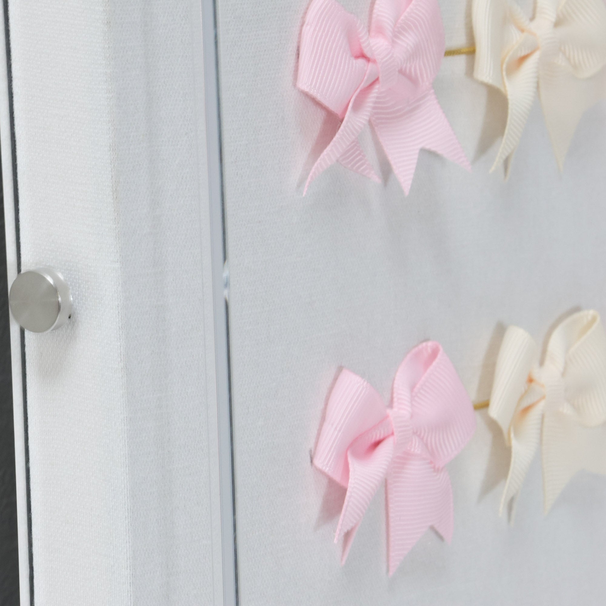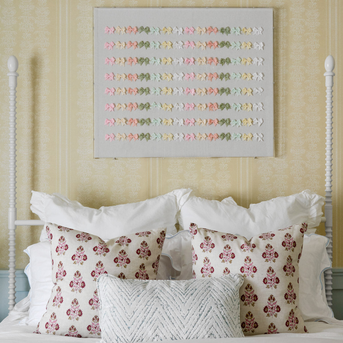 From the Tat Frederick studio, this 3d artwork features rows of pastel bows framed in an acrylic shadowbox.